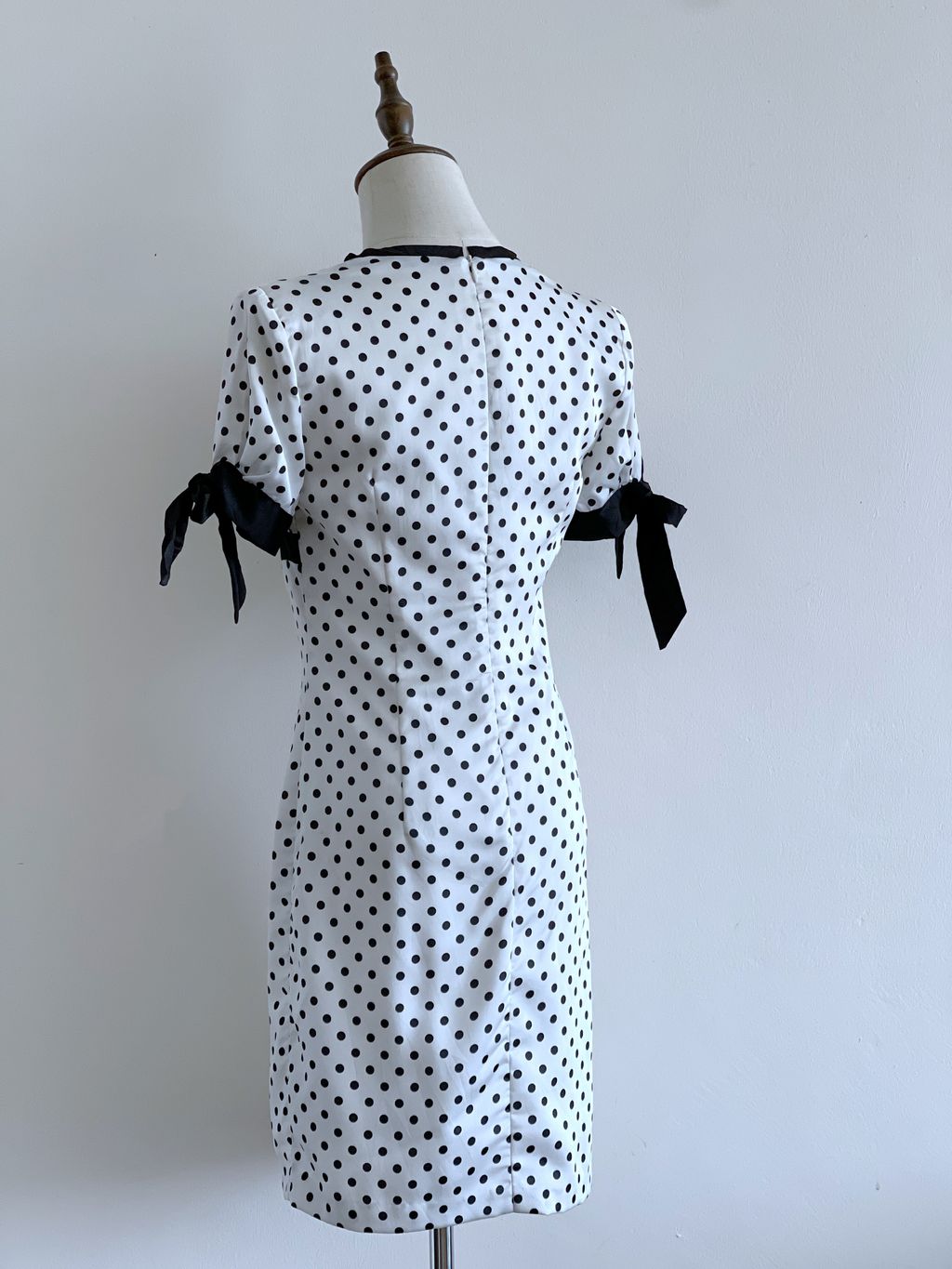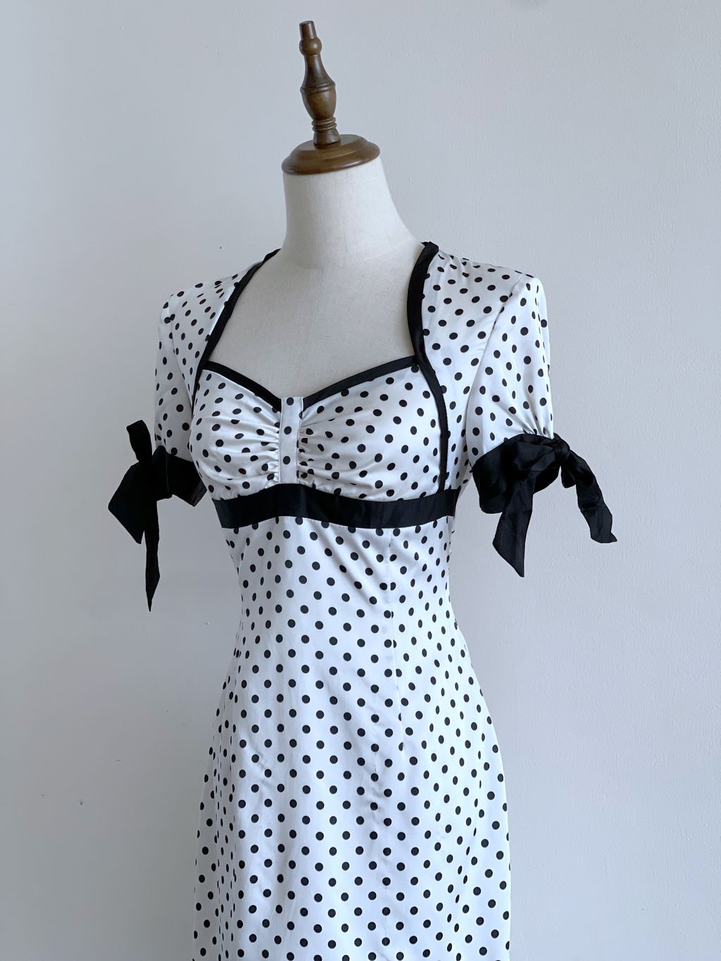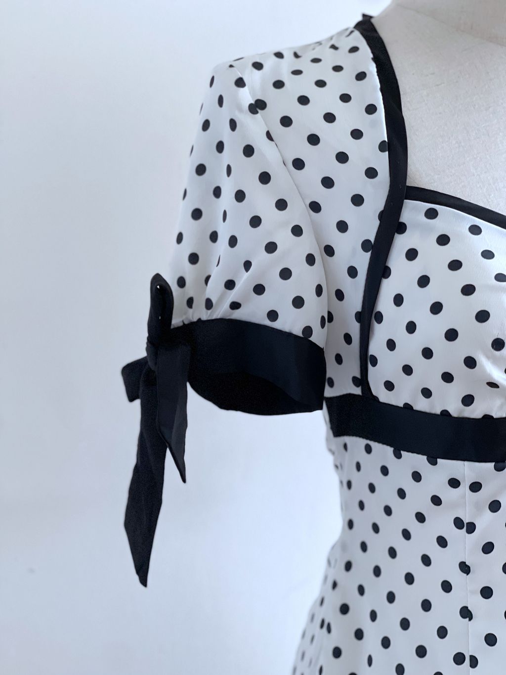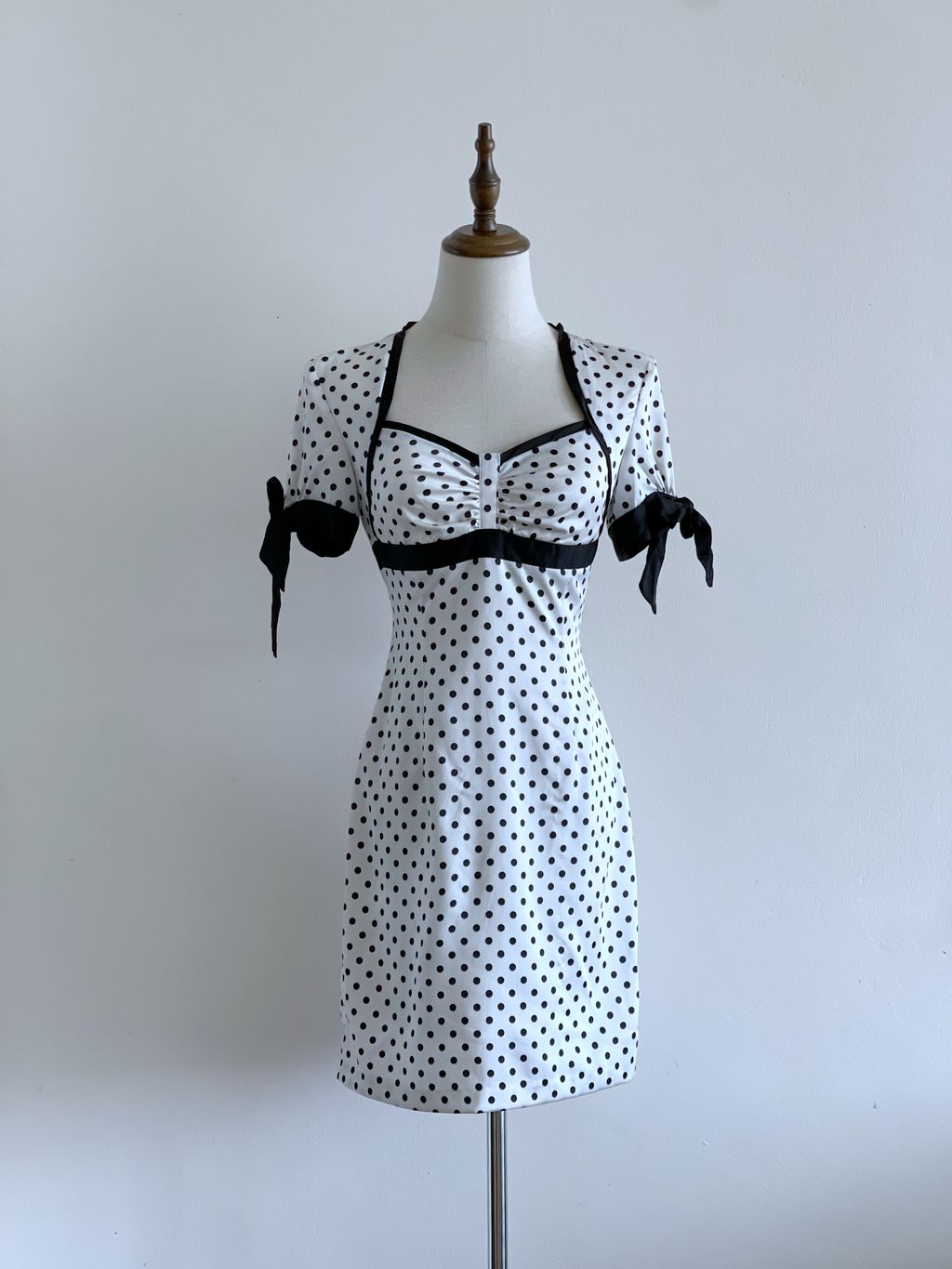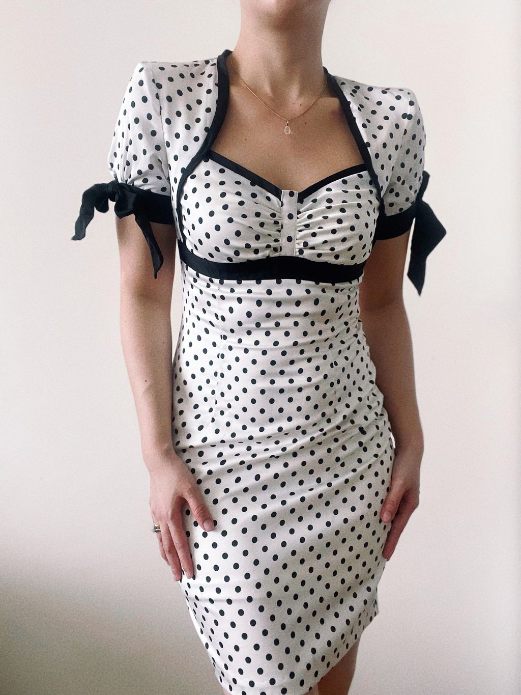 Channel your inner bombshell in this vintage-inspired stunner—crisp white with classic black polka dots, a sweetheart neckline, and flirty short sleeves topped with black bows. Features a fitted bodice, subtly flared straight skirt, and shoulder pads for that perfect hourglass silhouette. Fully lined and full of attitude.