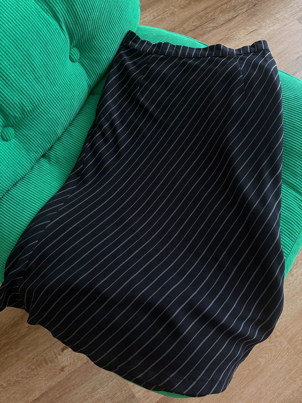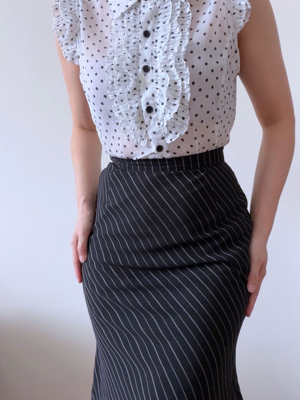 A timeless silhouette with subtle sophistication, this vintage A-line midi skirt features vertical pinstripes that elongate the figure, complemented by a full lining for smooth drape and comfort. Finished with a discreet side zipper, it blends classic tailoring with effortless vintage charm, perfect for both polished and casual ensembles.