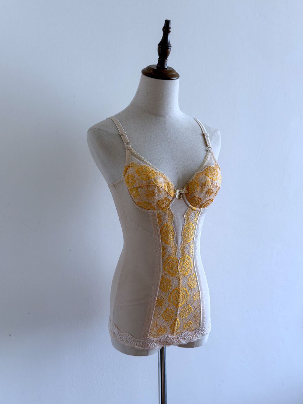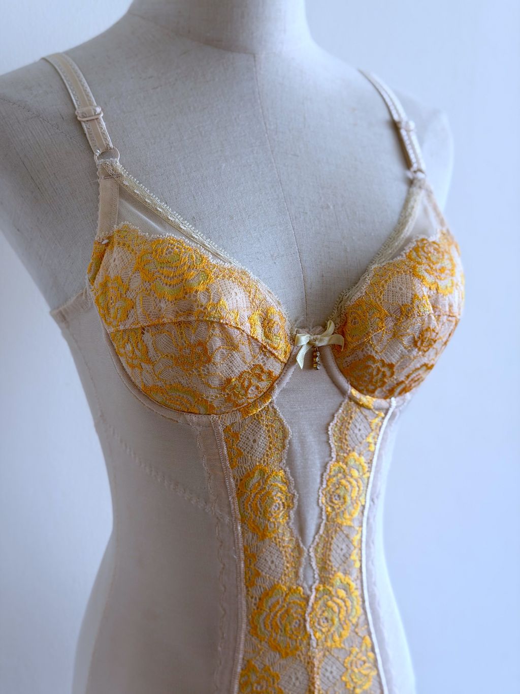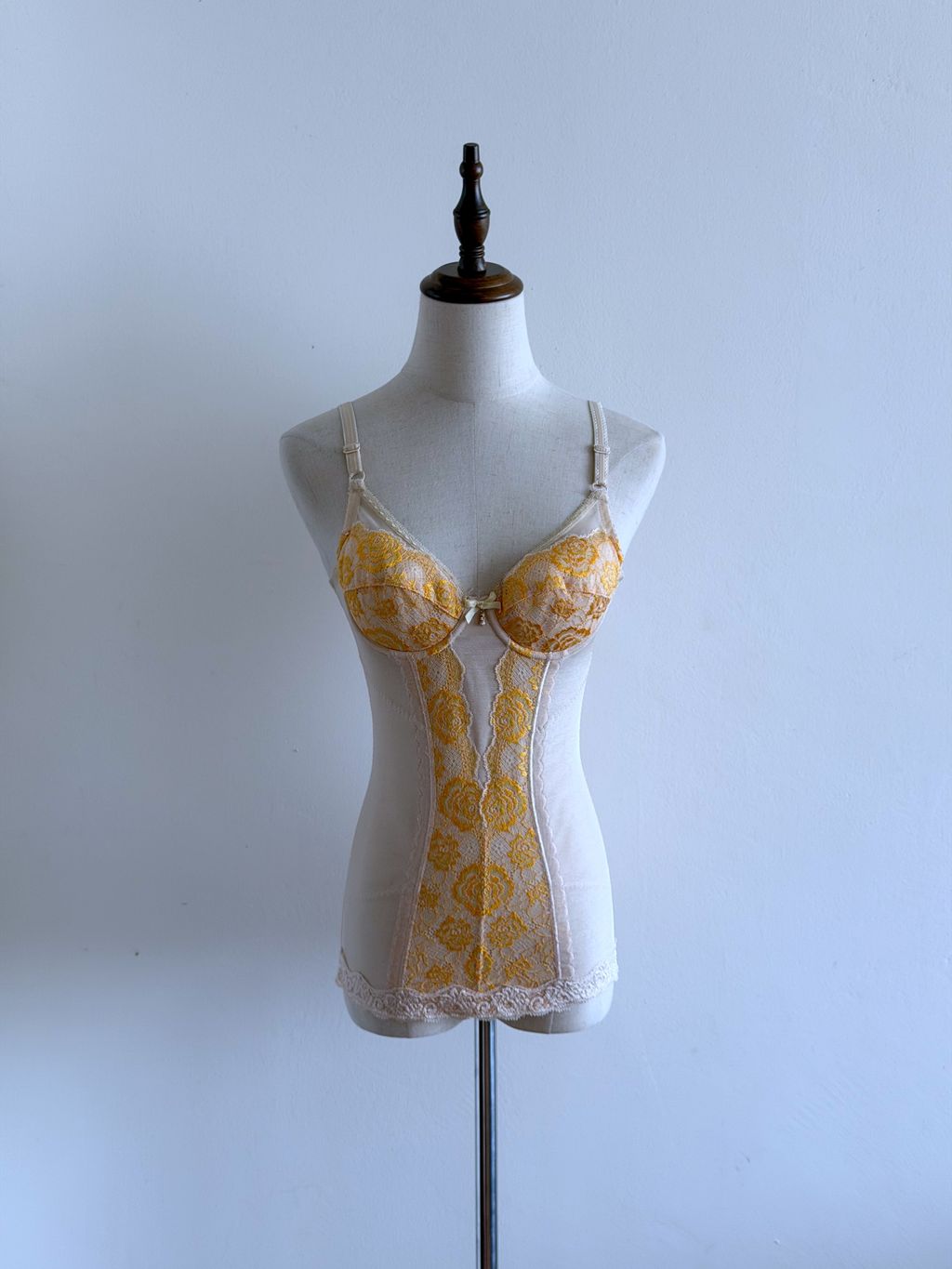 A sun-kissed whisper of lace, this corset bustier blends elegance and delicate charm in a dreamy butter yellow floral lace overlay set on a soft beige base. The bustier-style neckline with folded cups creates gentle shaping, while the long-line fit gracefully extends to the hips, offering a flattering silhouette.