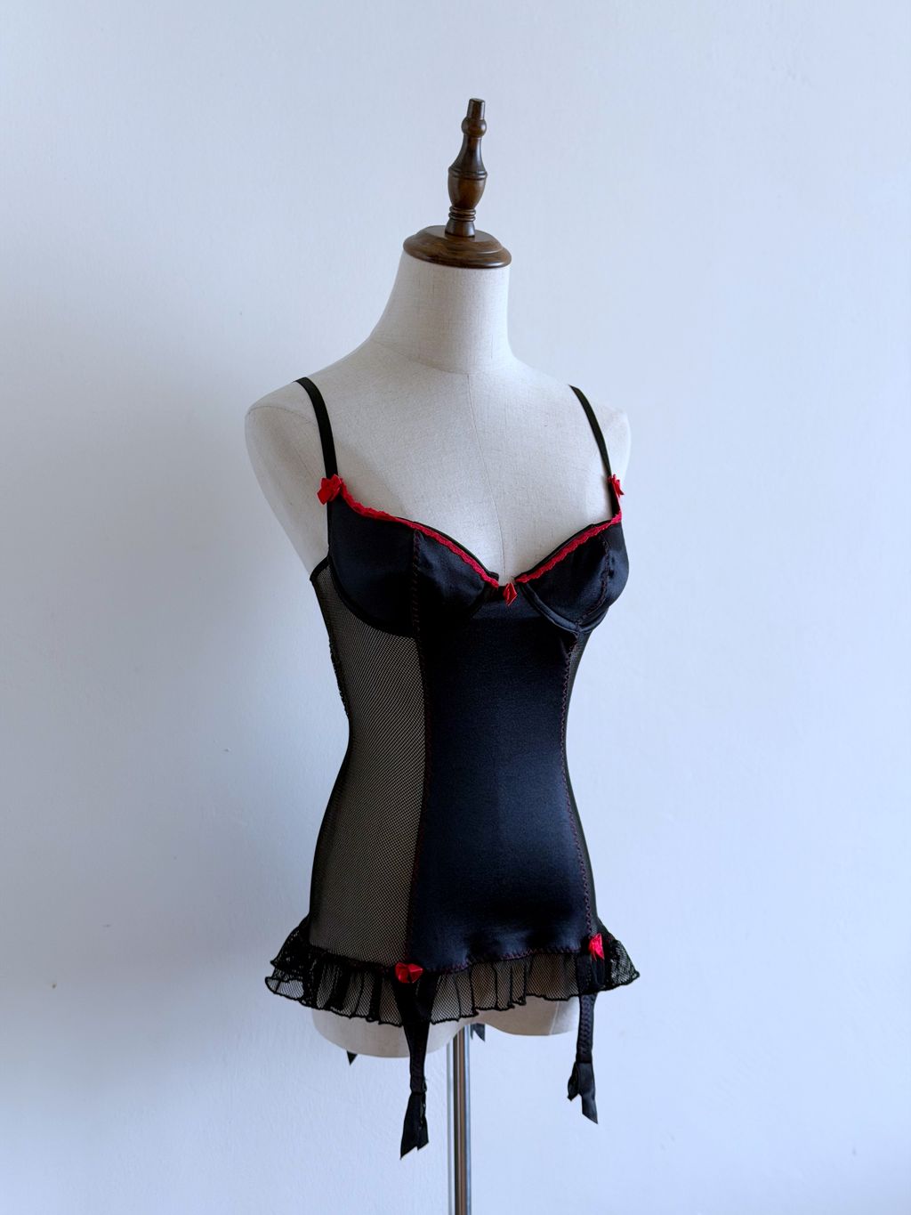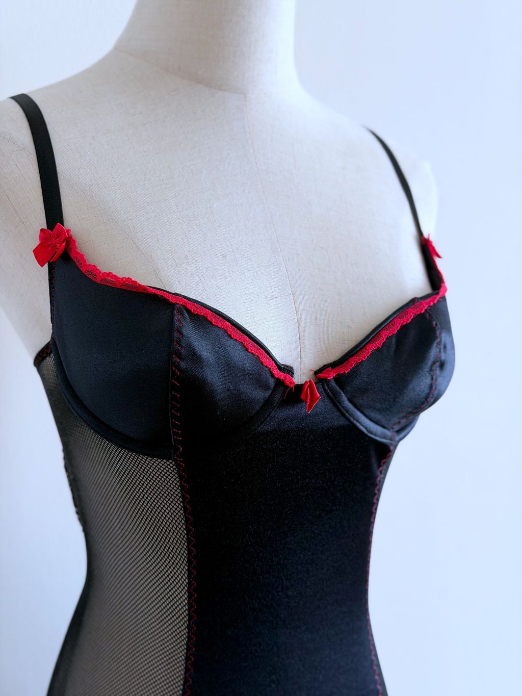 A bold statement of vintage allure, this Fredericks of Hollywood “Seduction” bustier/chemise combines silky black satin with sheer mesh panels for an irresistibly flirty silhouette. Bright red trim and tiny bows add striking, playful accents, capturing the essence of coquette glamour.