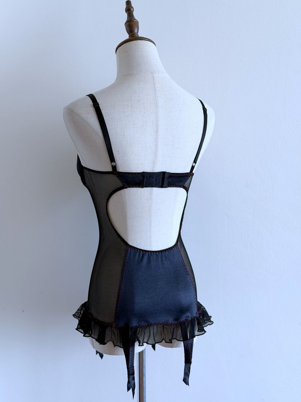 The lightly padded underwired cups provide gentle support and shaping, while adjustable shoulder straps ensure the perfect fit. The flowing babydoll-inspired skirt ends in a hemline with adjustable garter straps, ideal for pairing with stockings, completing a timelessly seductive look. The back features a hook closure, keeping the piece structured yet effortlessly elegant.