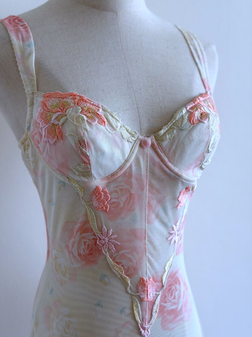 A flutter of whimsy and nostalgia, this floral lace bodysuit/teddy is a delicate ode to coquette, fairycore, and 90s–Y2K charm. Crafted in semi-sheer mesh with intricate pastel rosette lace detailing, it drapes lightly over the body, creating a soft, ethereal silhouette.