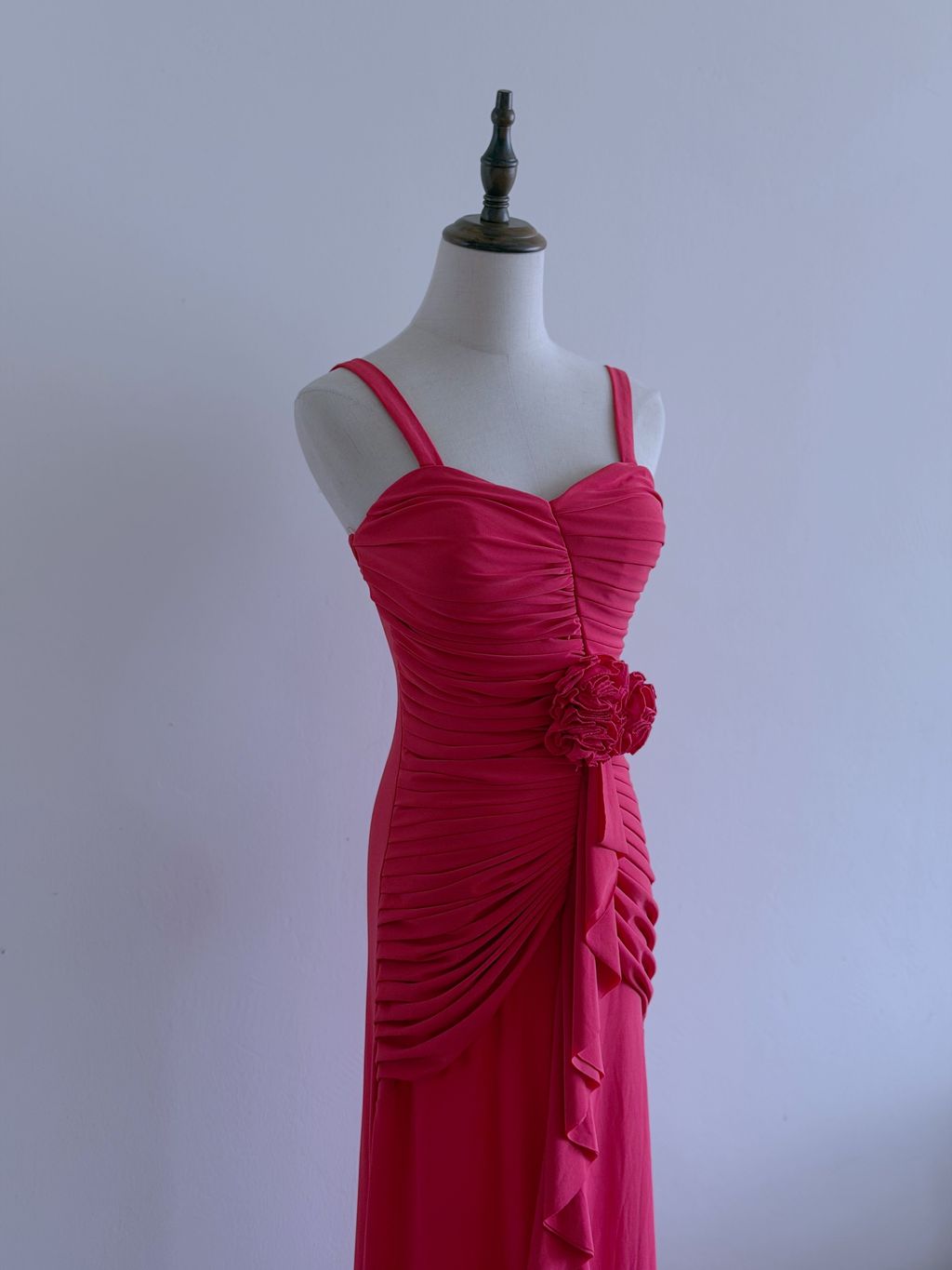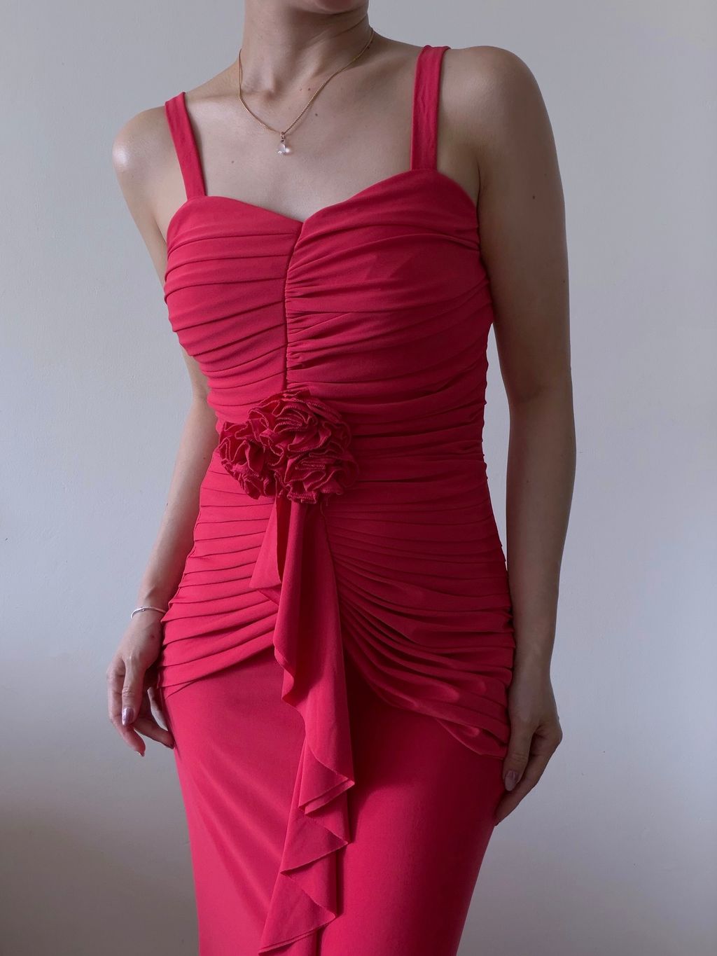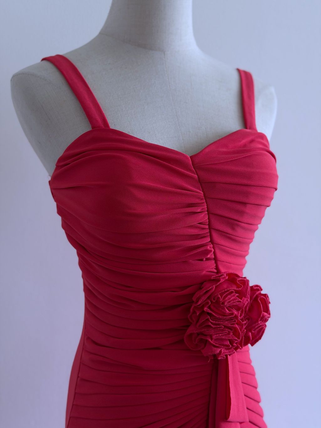 A romantic vision in coral, this evening dress exudes timeless vintage elegance with delicate, feminine detailing. The bodice is thoughtfully crafted with soft gathers and intricate pleating, enhanced by 3D rosettes that add texture and charm.