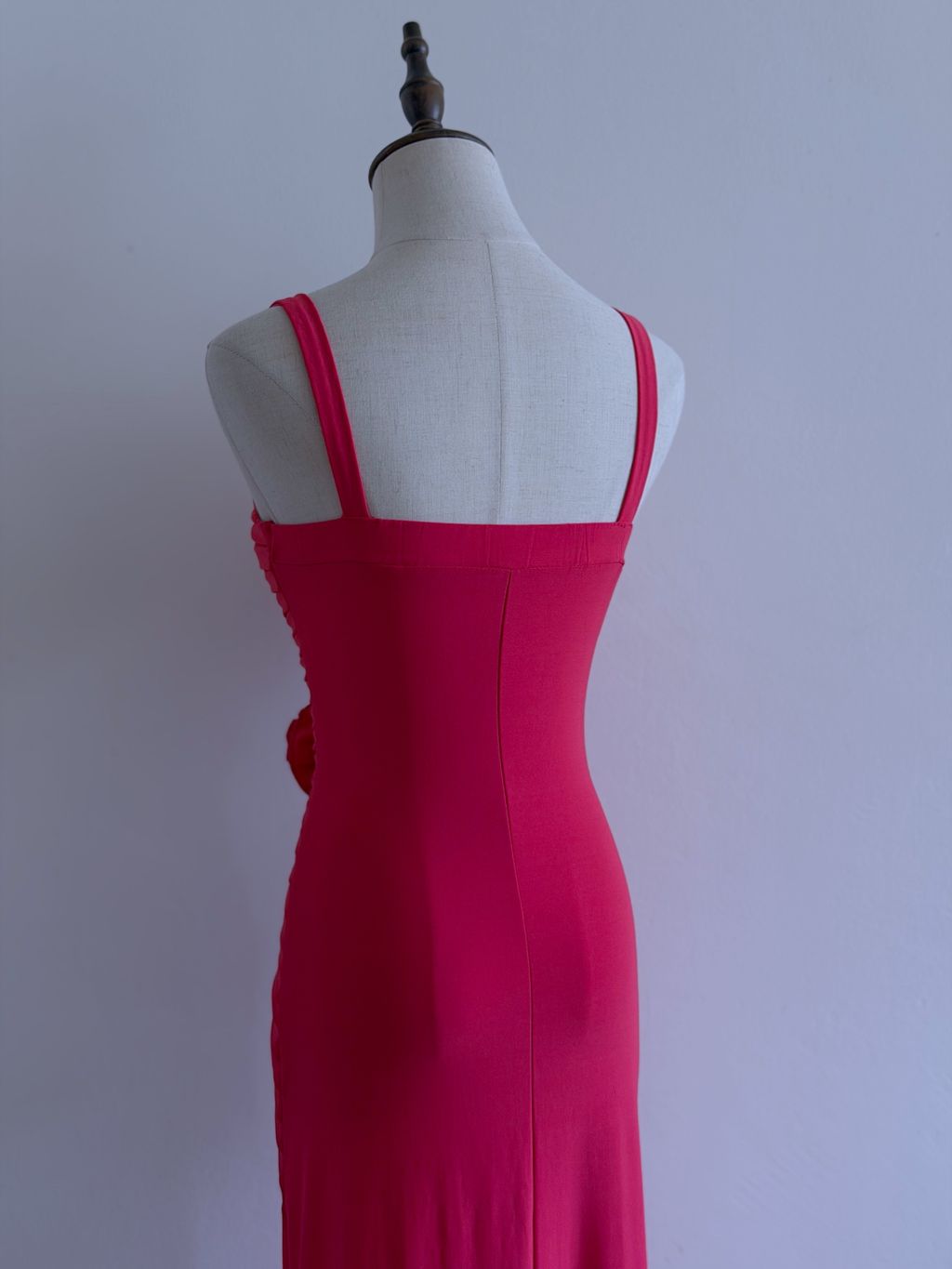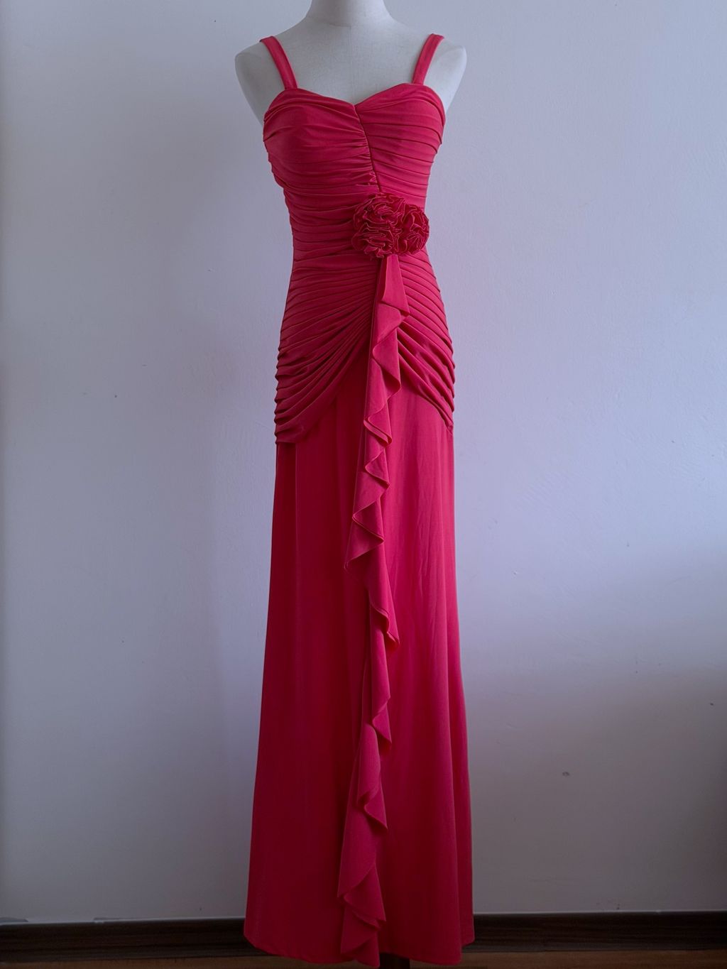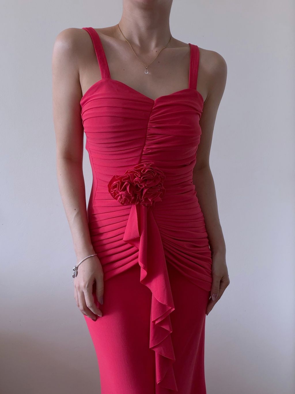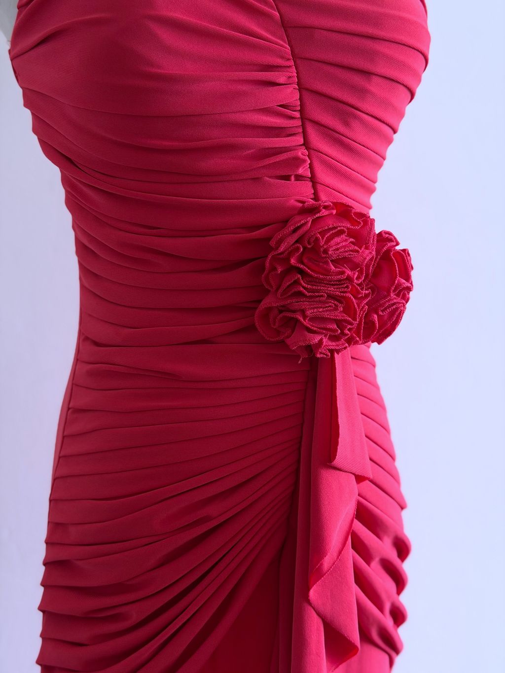 A romantic vision in coral, this evening dress exudes timeless vintage elegance with delicate, feminine detailing. The bodice is thoughtfully crafted with soft gathers and intricate pleating, enhanced by 3D rosettes that add texture and charm.