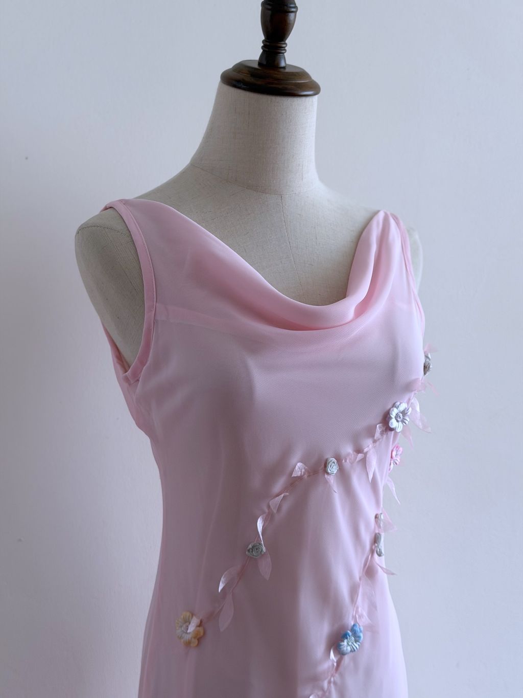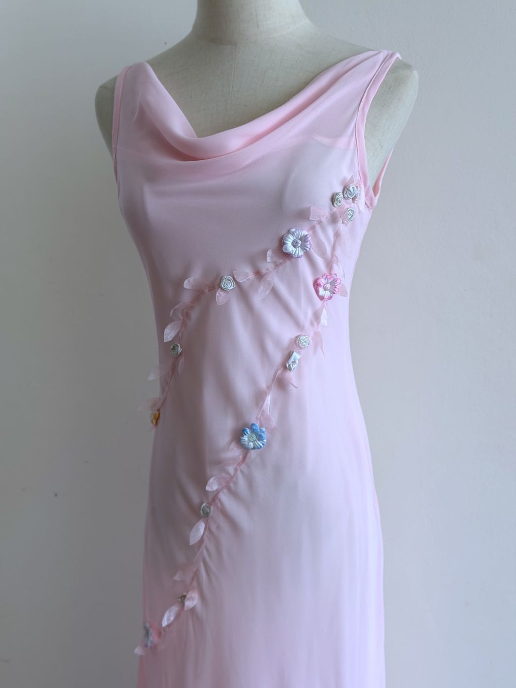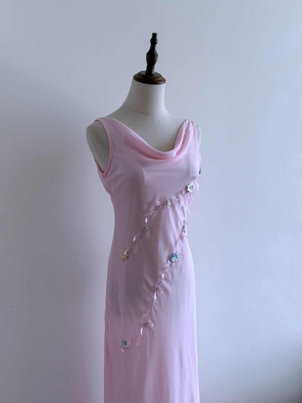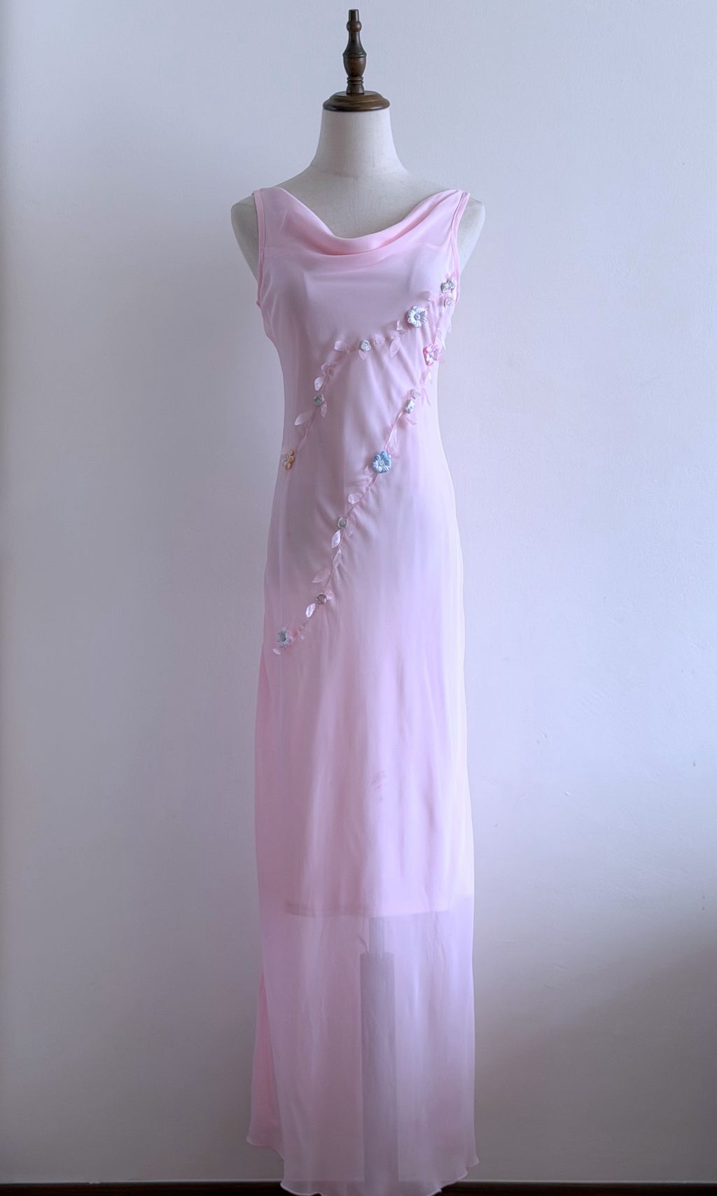 Softly ethereal and delicately feminine, this romantic cowl neck dress features a lightweight, sheer outer layer in gentle baby pink, flowing effortlessly over a fully lined silhouette. A diagonal line of small floral appliqués adds a subtle, poetic touch, enhancing the airy elegance of the drape. Perfectly balanced between whimsy and sophistication, it embodies timeless romance in every detail.
