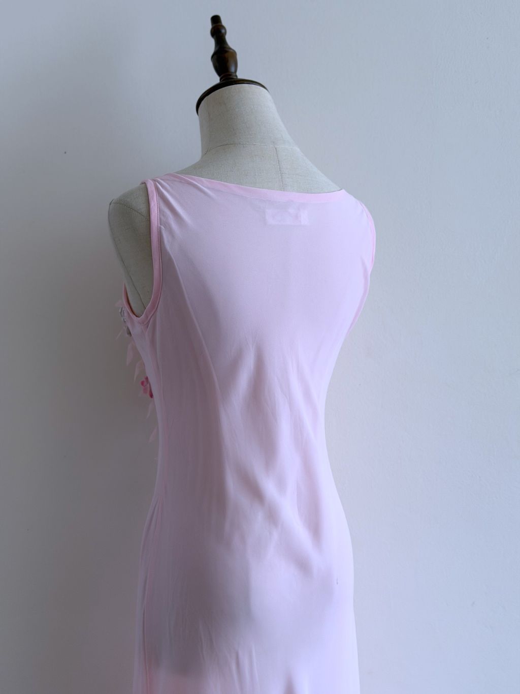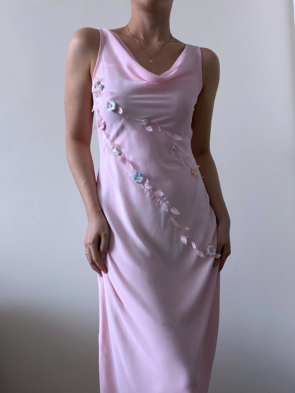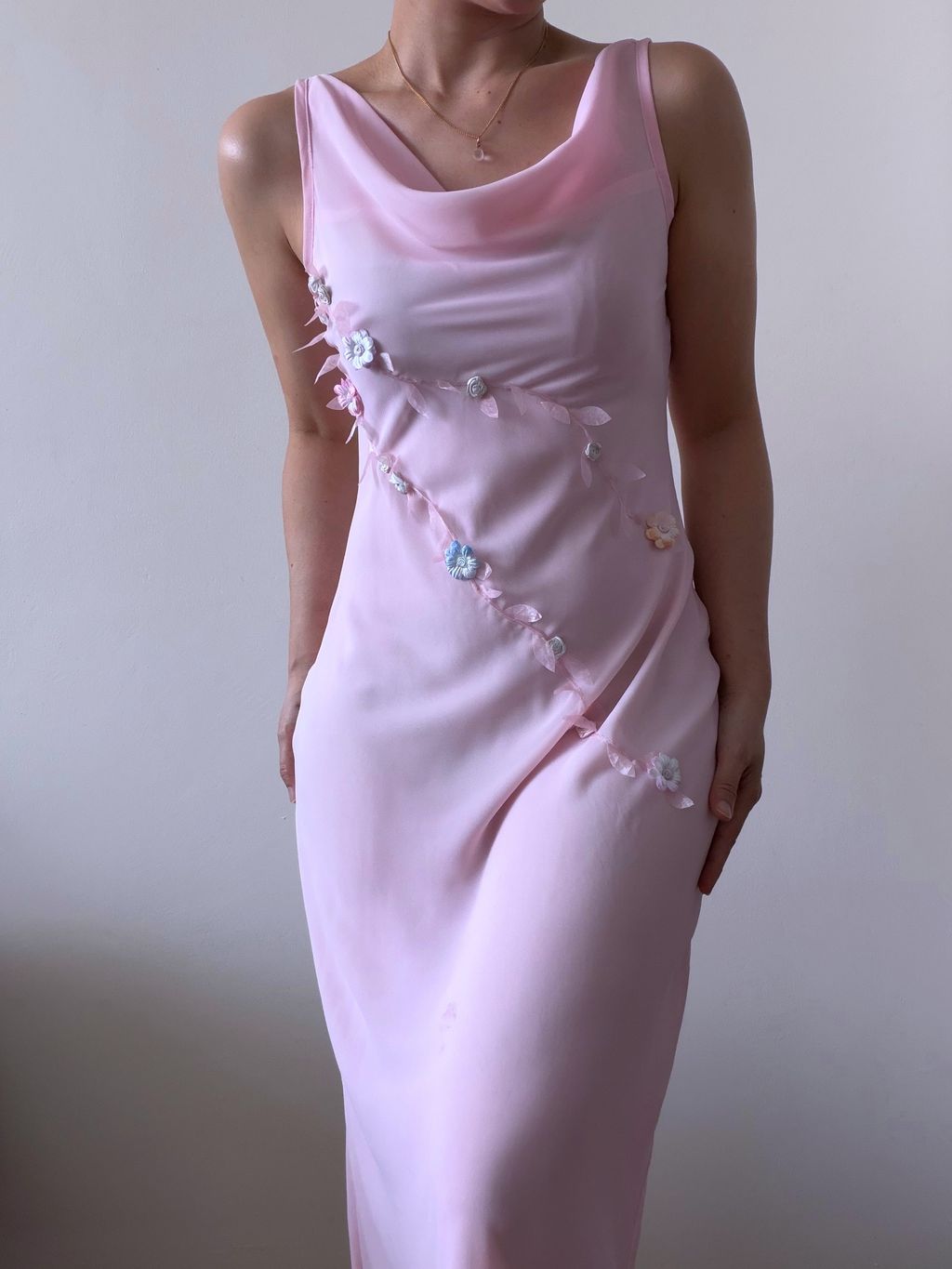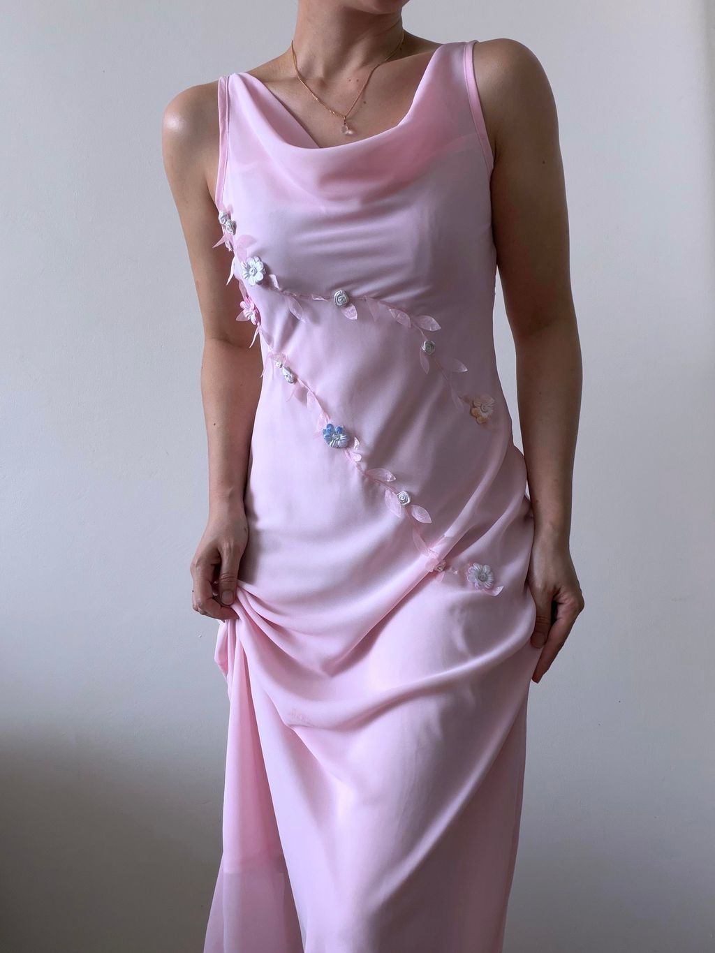 Softly ethereal and delicately feminine, this romantic cowl neck dress features a lightweight, sheer outer layer in gentle baby pink, flowing effortlessly over a fully lined silhouette. A diagonal line of small floral appliqués adds a subtle, poetic touch, enhancing the airy elegance of the drape. Perfectly balanced between whimsy and sophistication, it embodies timeless romance in every detail.