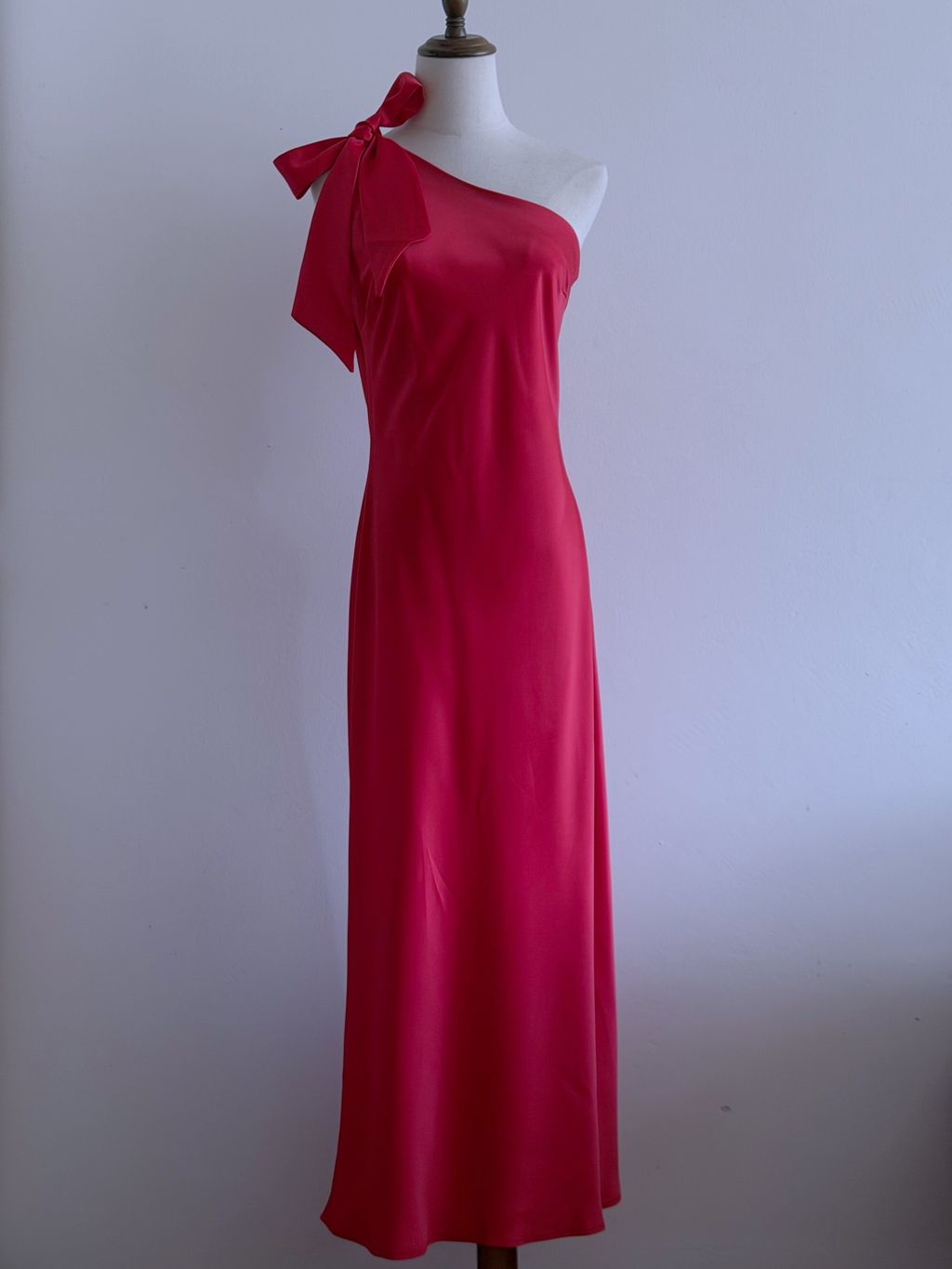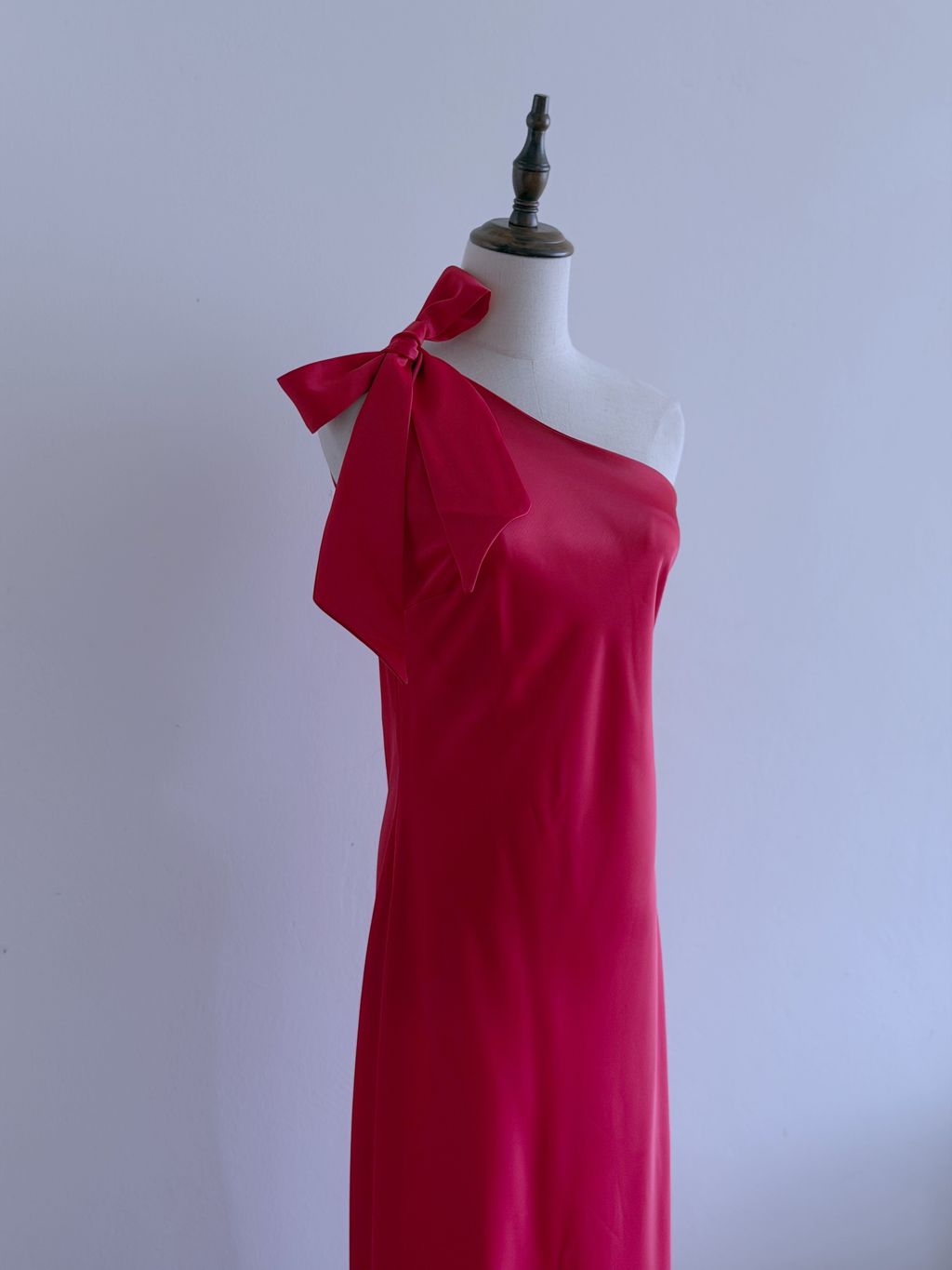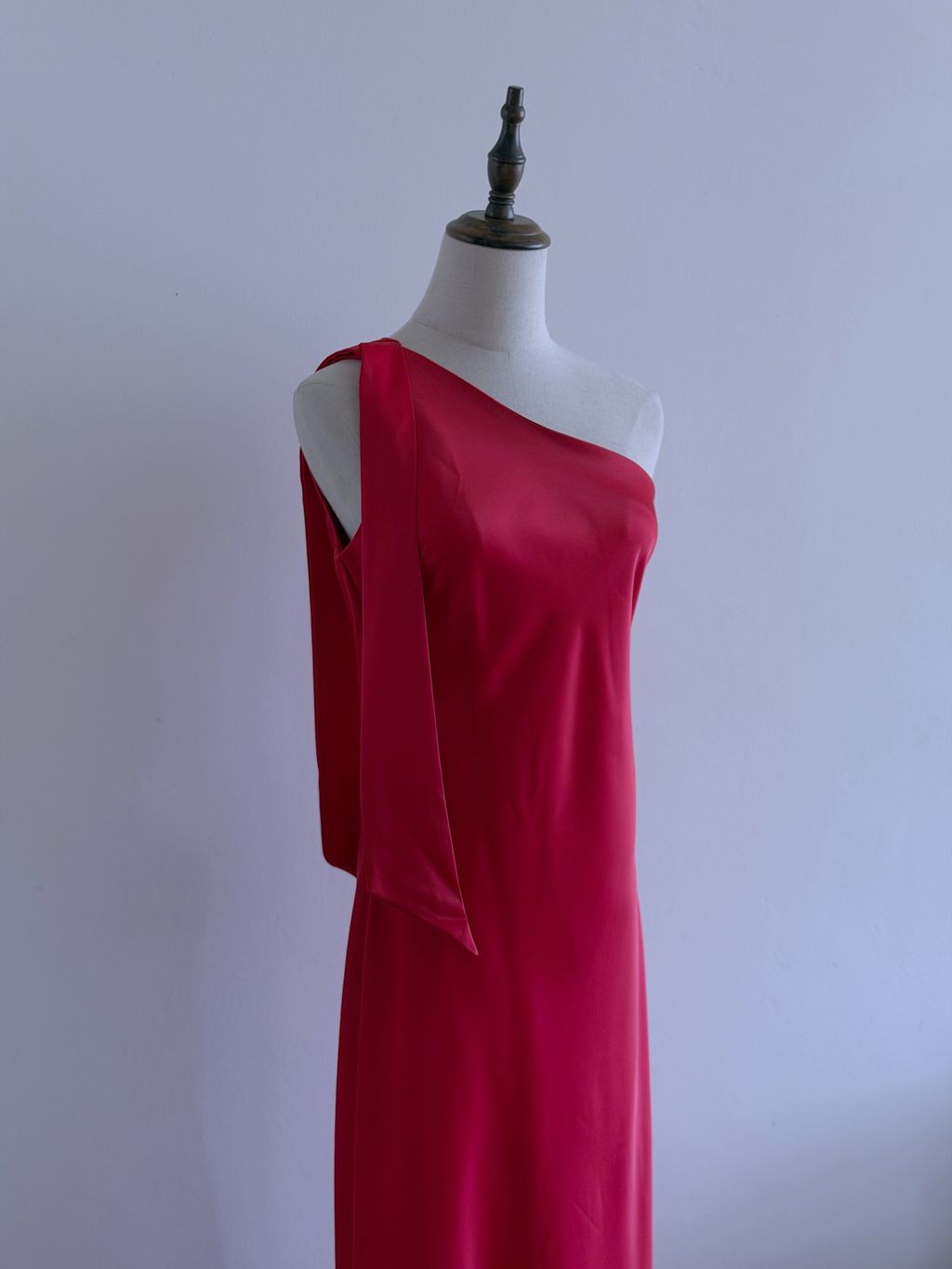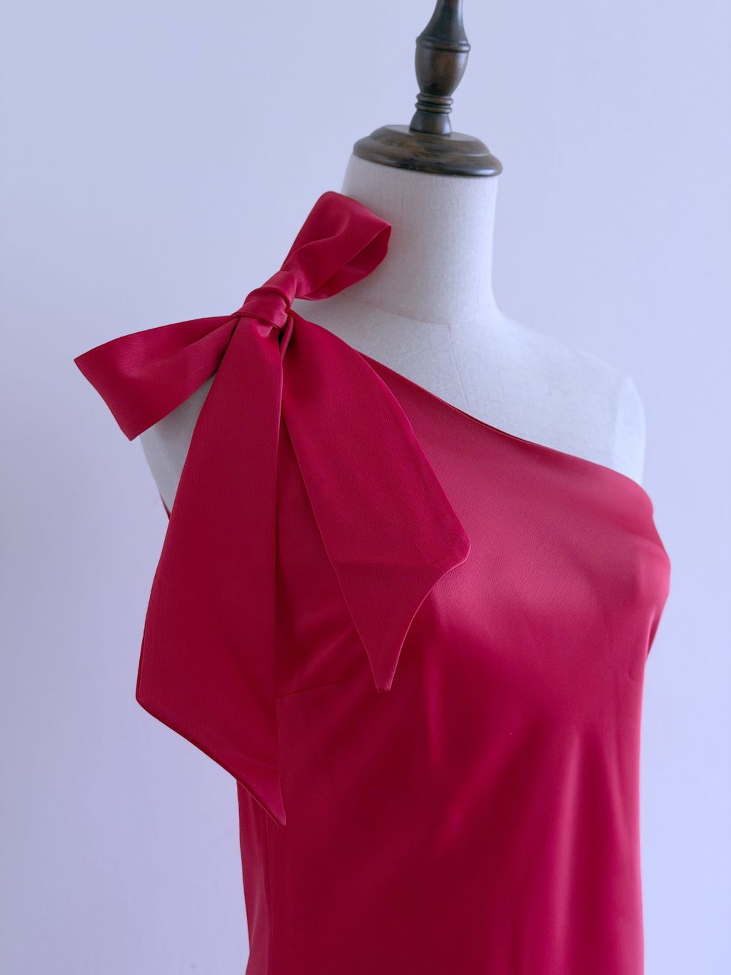 A striking statement of vintage-inspired elegance, this gown features an asymmetrical one-shoulder neckline that exudes modern sophistication. The satin shoulder strap can be styled into a bow or knot, offering a playful, customizable detail, while the lustrous satin fabric drapes beautifully across the body.