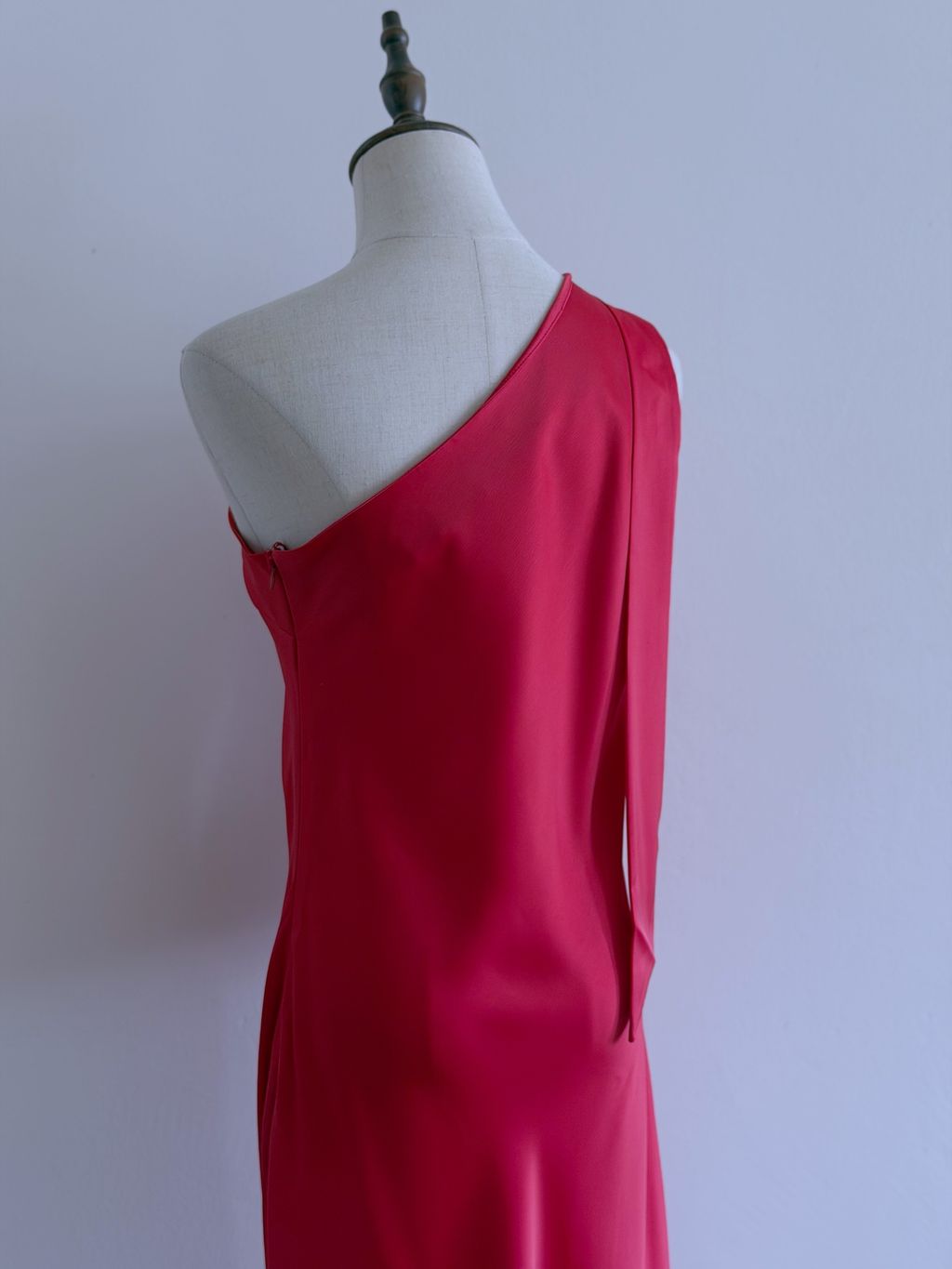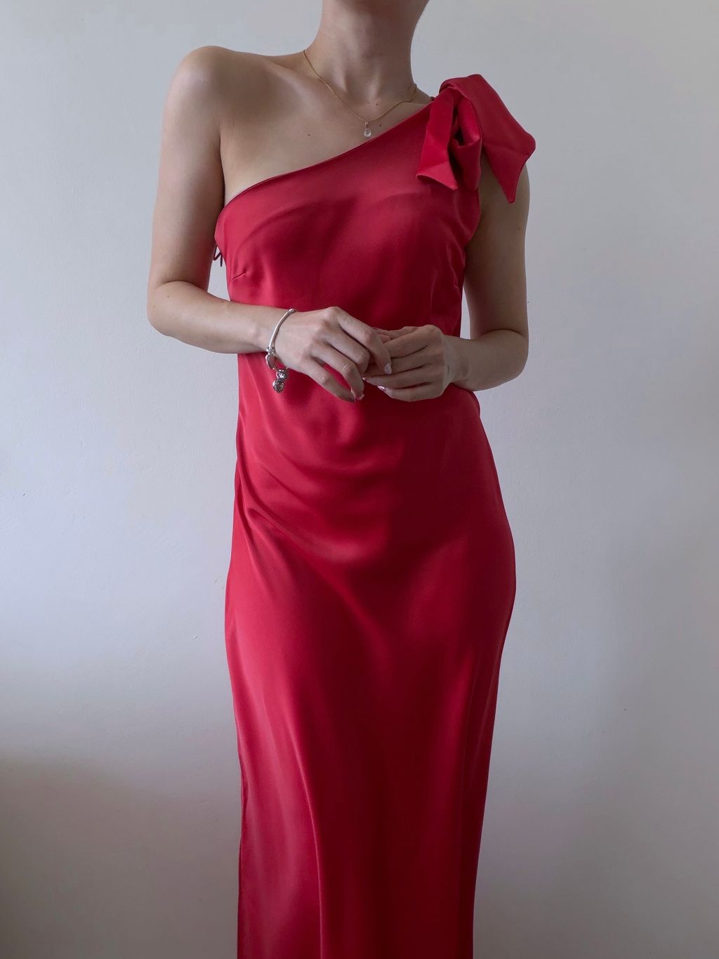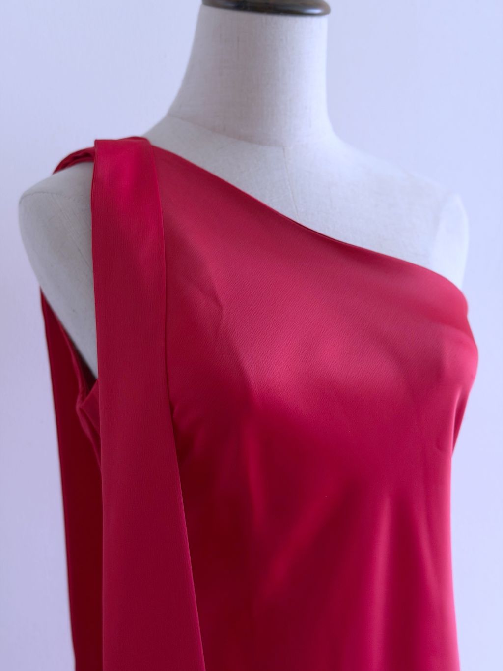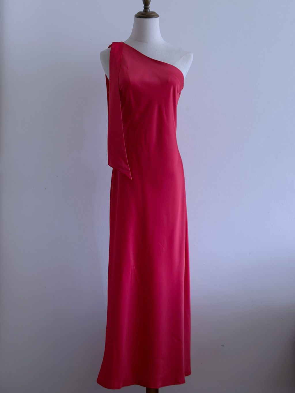 A striking statement of vintage-inspired elegance, this gown features an asymmetrical one-shoulder neckline that exudes modern sophistication. The satin shoulder strap can be styled into a bow or knot, offering a playful, customizable detail, while the lustrous satin fabric drapes beautifully across the body.