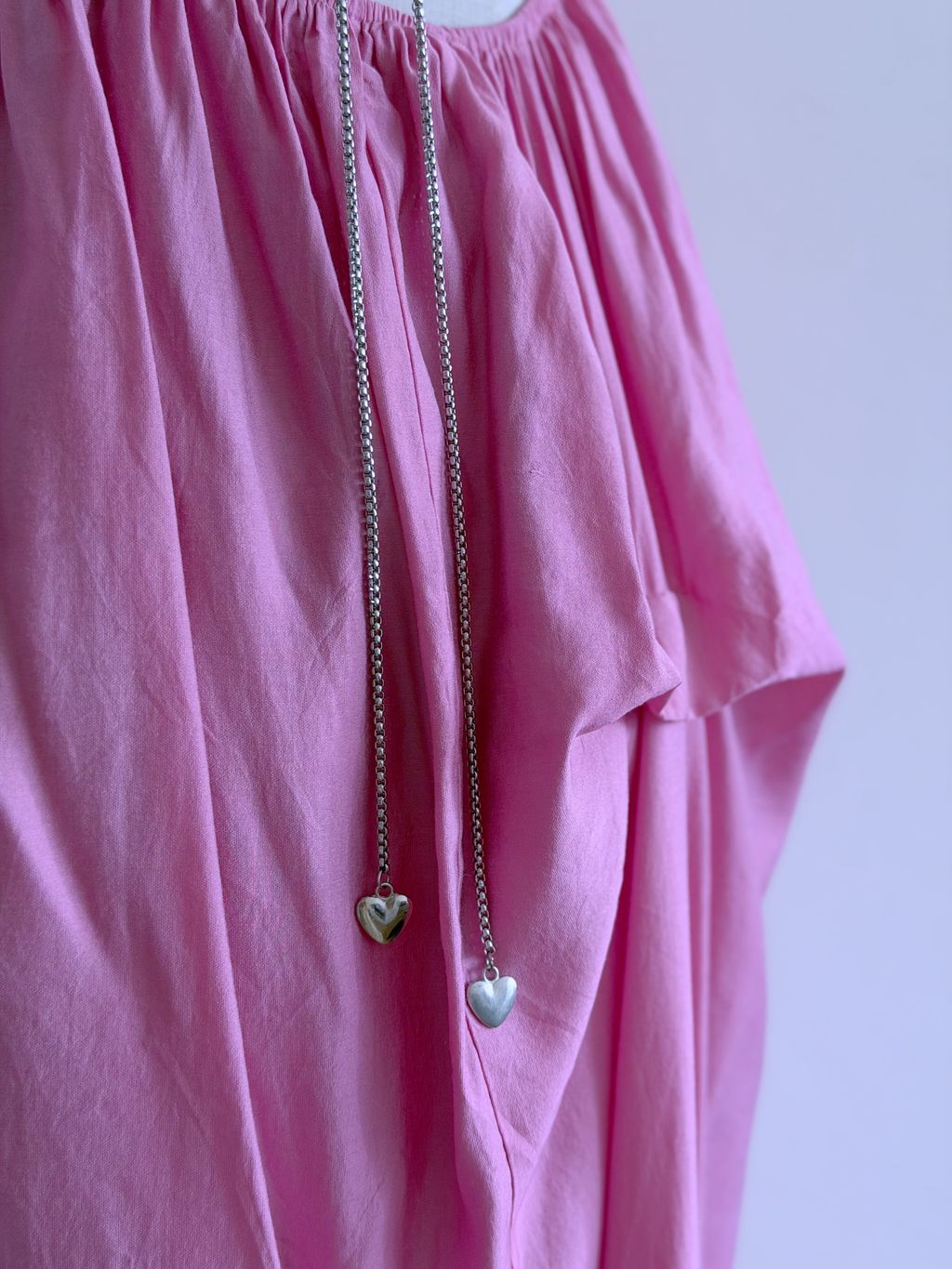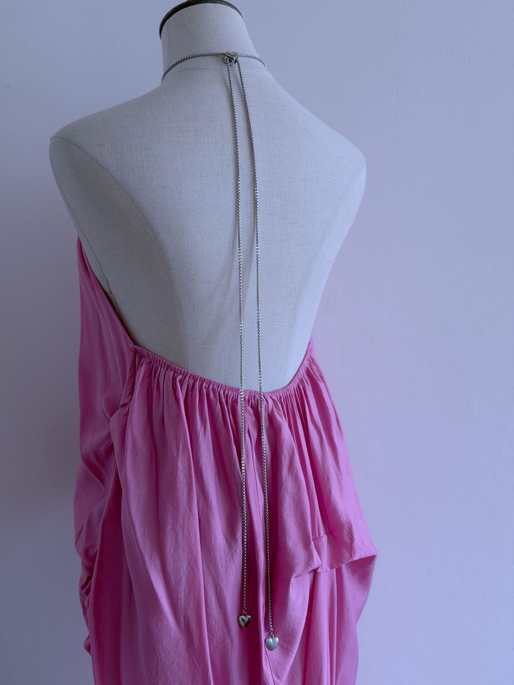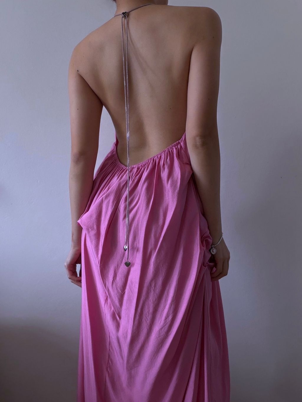 A dreamy statement of vintage romance, this pink maxi dress features a distinctive draped, voluminous silhouette that floats effortlessly with every movement. The backless design is delicately accented with chain ties adorned with tiny heart charms, adding a whimsical and feminine touch.
