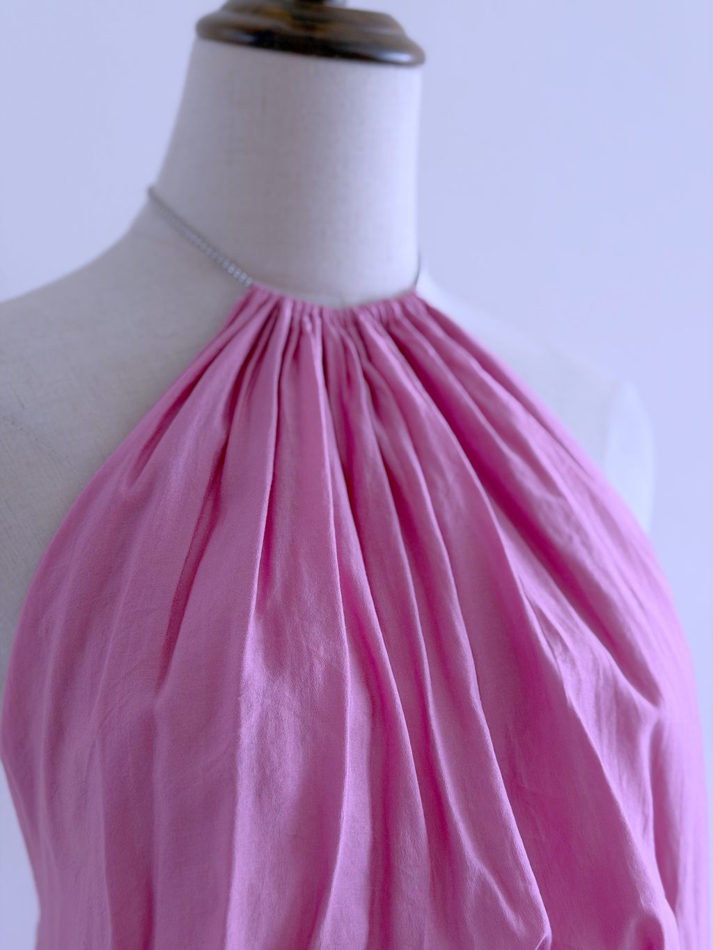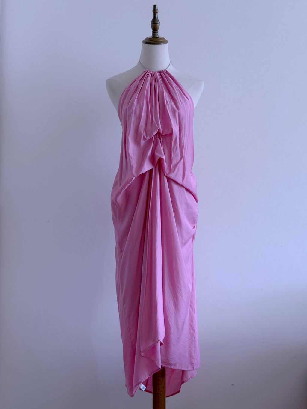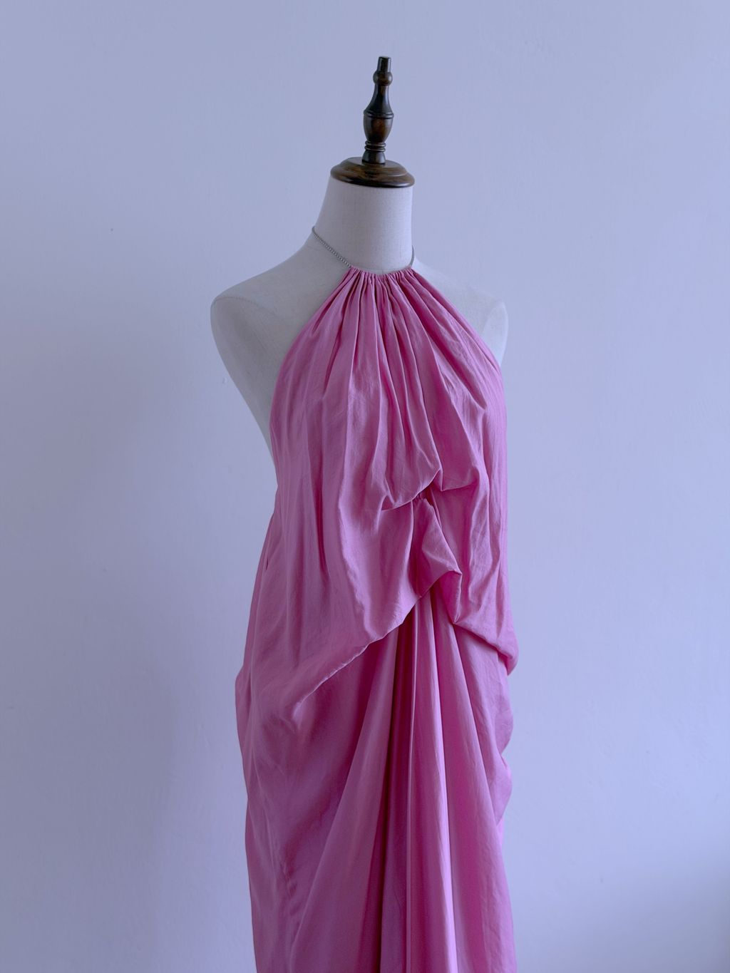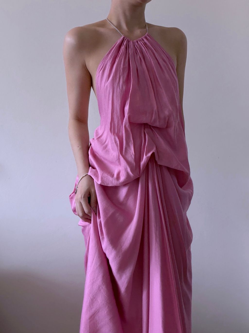 A dreamy statement of vintage romance, this pink maxi dress features a distinctive draped, voluminous silhouette that floats effortlessly with every movement. The backless design is delicately accented with chain ties adorned with tiny heart charms, adding a whimsical and feminine touch.