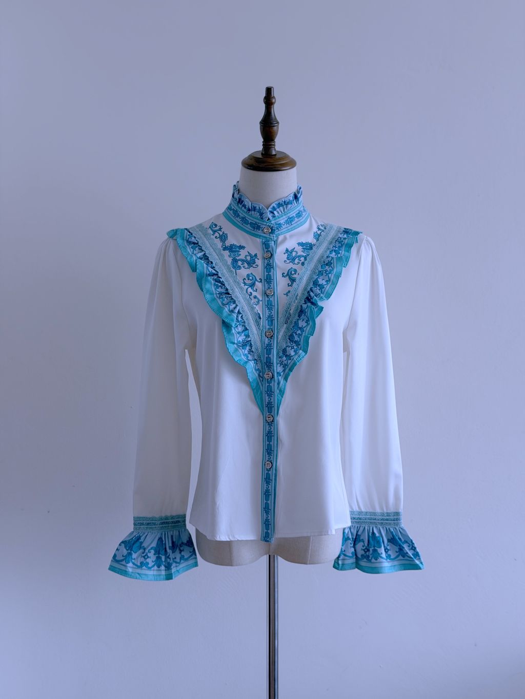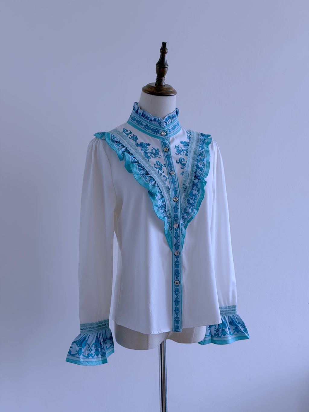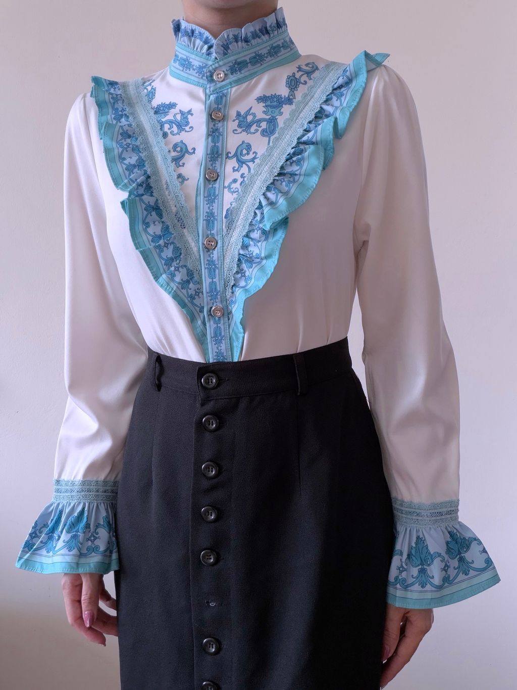 A vibrant nod to vintage flair, this eye-catching blouse commands attention with a bold turquoise blue pattern damask print that pops against a classic silhouette. The chest features a distinctive shaped ruffle, mirrored on the matching cuffs, adding playful texture and dynamic movement.