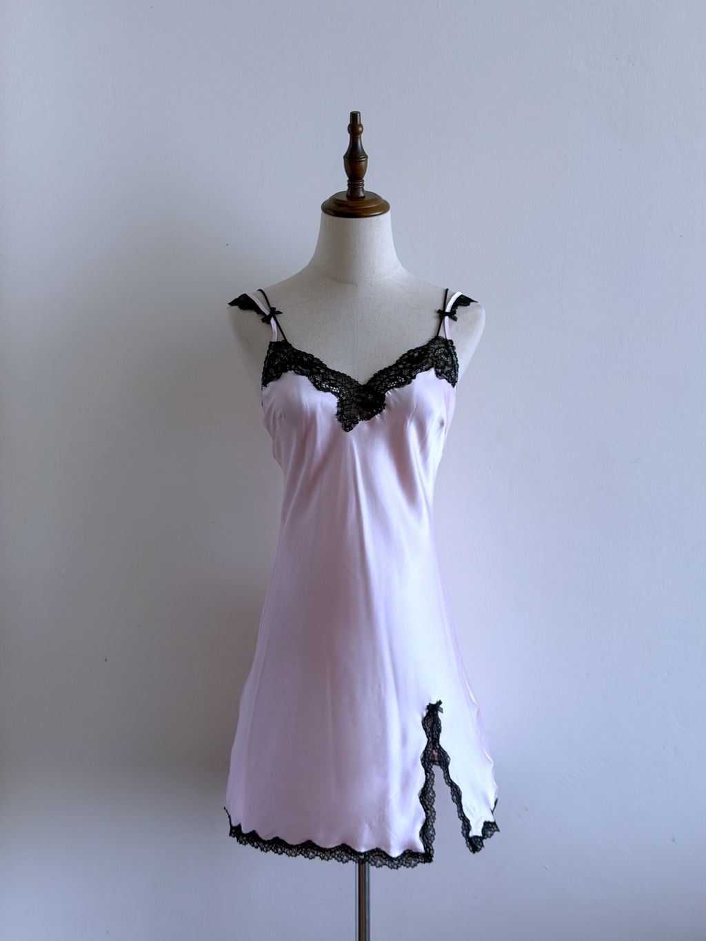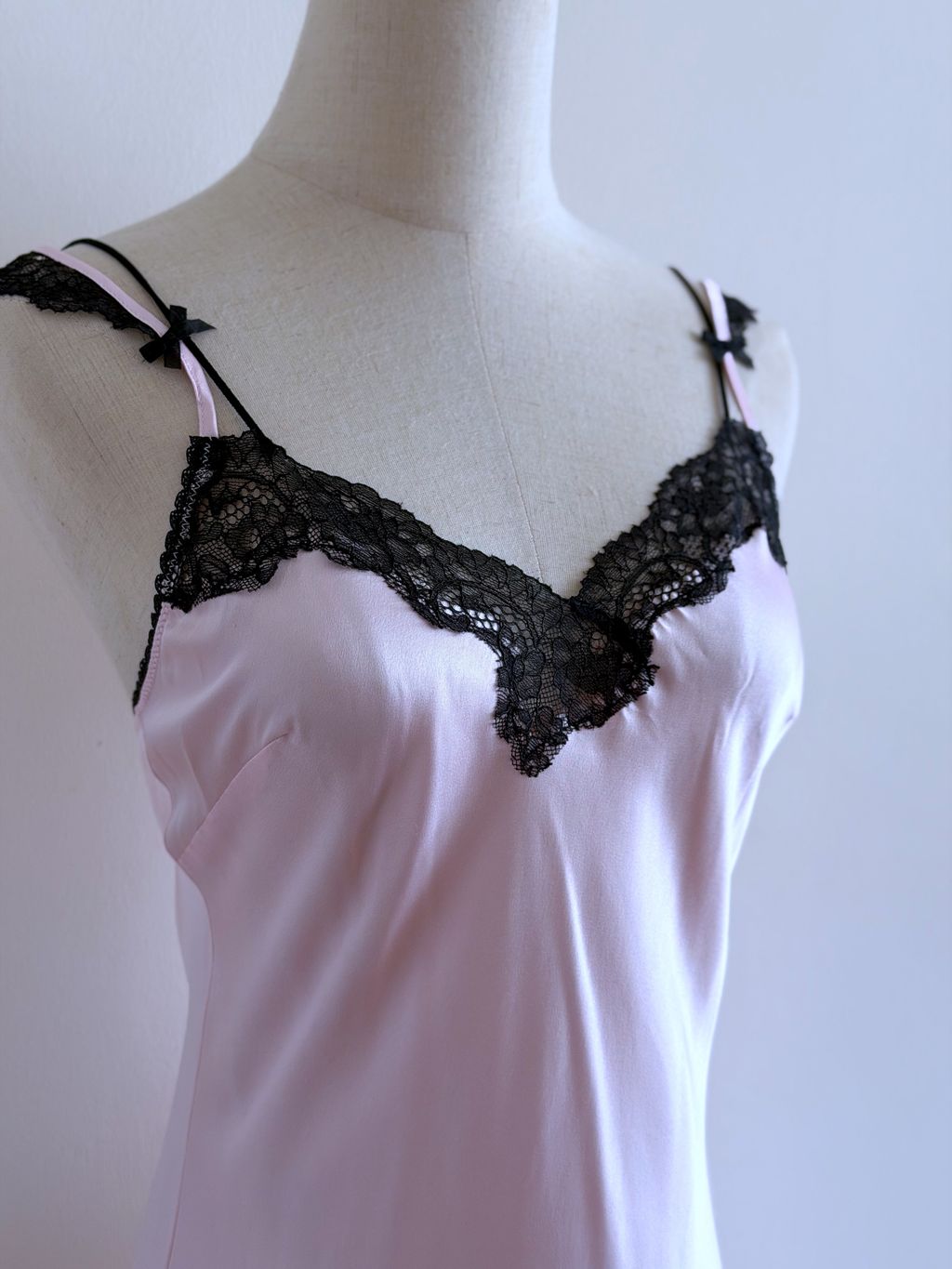 The pale blush base contrasts beautifully with jet-black detailing, creating a dreamy yet striking silhouette. The lace spaghetti straps and delicate black lace trim along the deep V-neckline frame the décolletage with quiet elegance, while the side slit adds a subtle touch of allure.