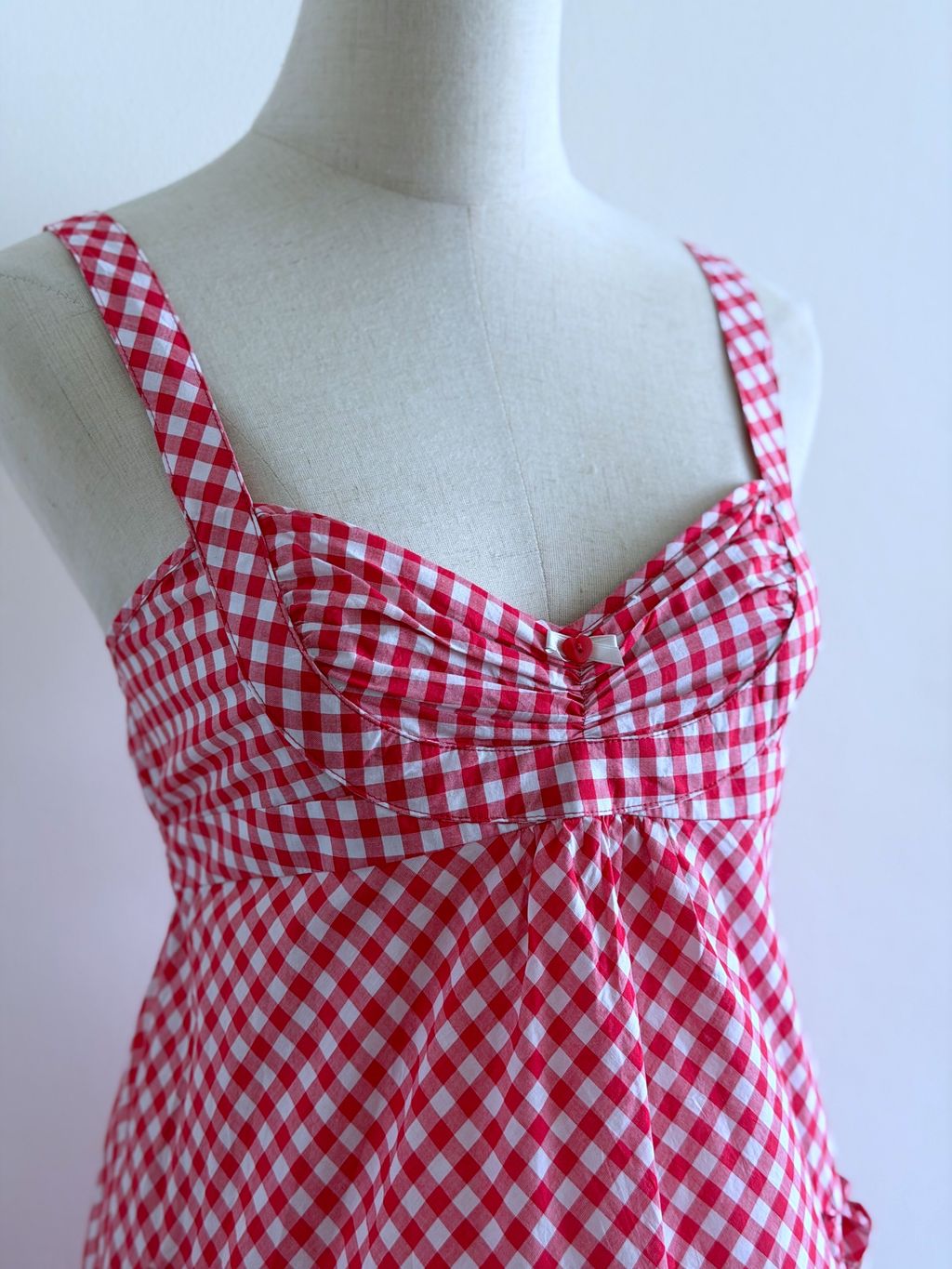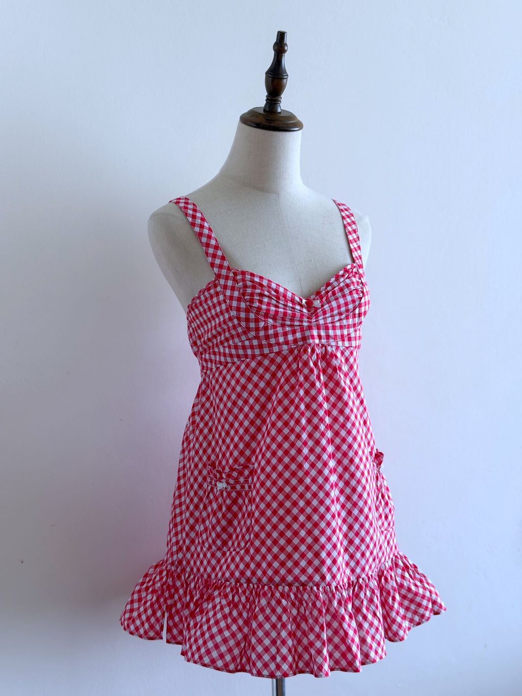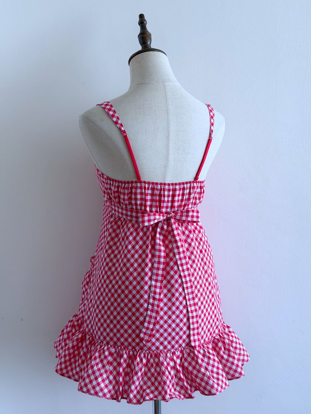 A sweet daydream in red and white gingham, this babydoll mini dress by Victoria’s Secret evokes playful coquette charm with its empire waist and ruffled hem that dances lightly over the thighs.