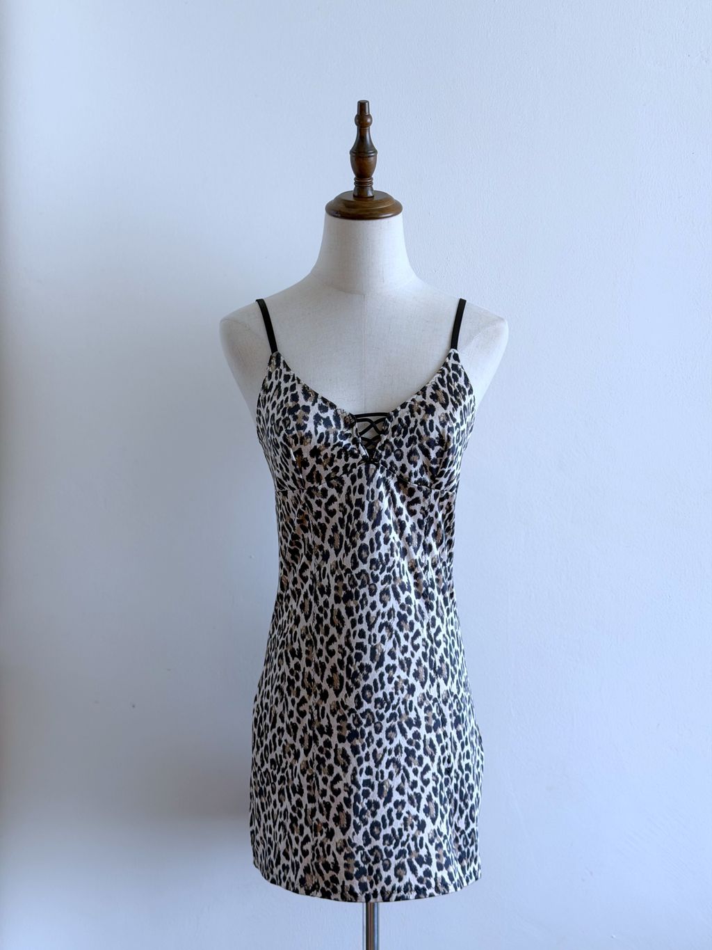 The V-neckline is enhanced with a delicate lace-up detail at the center, while thin adjustable black straps cross elegantly at the back. Black lace trim along the neckline and hem adds a romantic, feminine touch, balancing the wild print with soft sophistication.