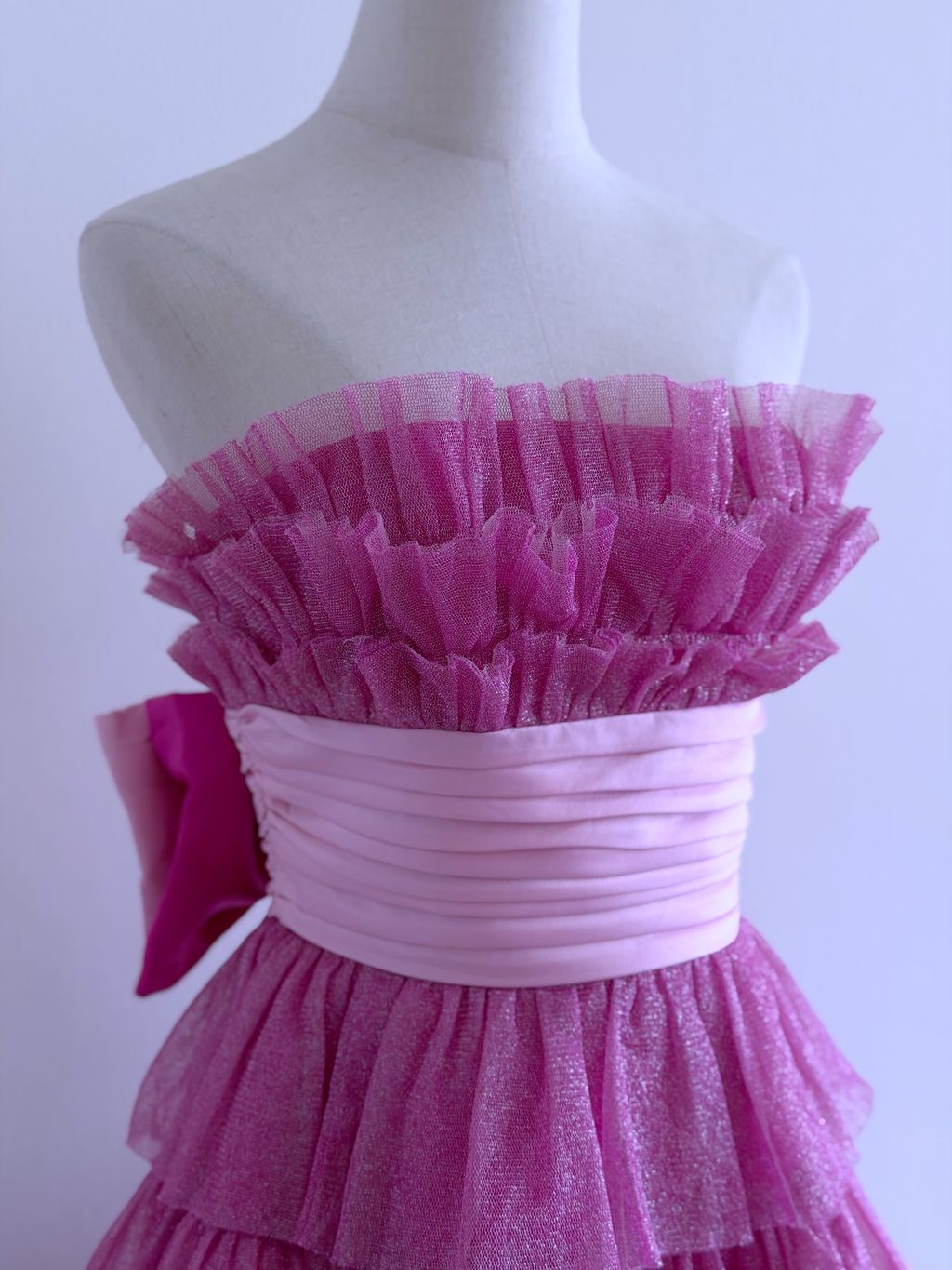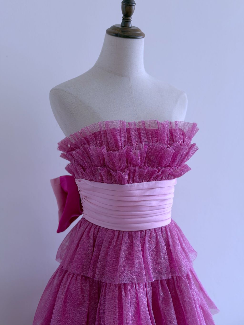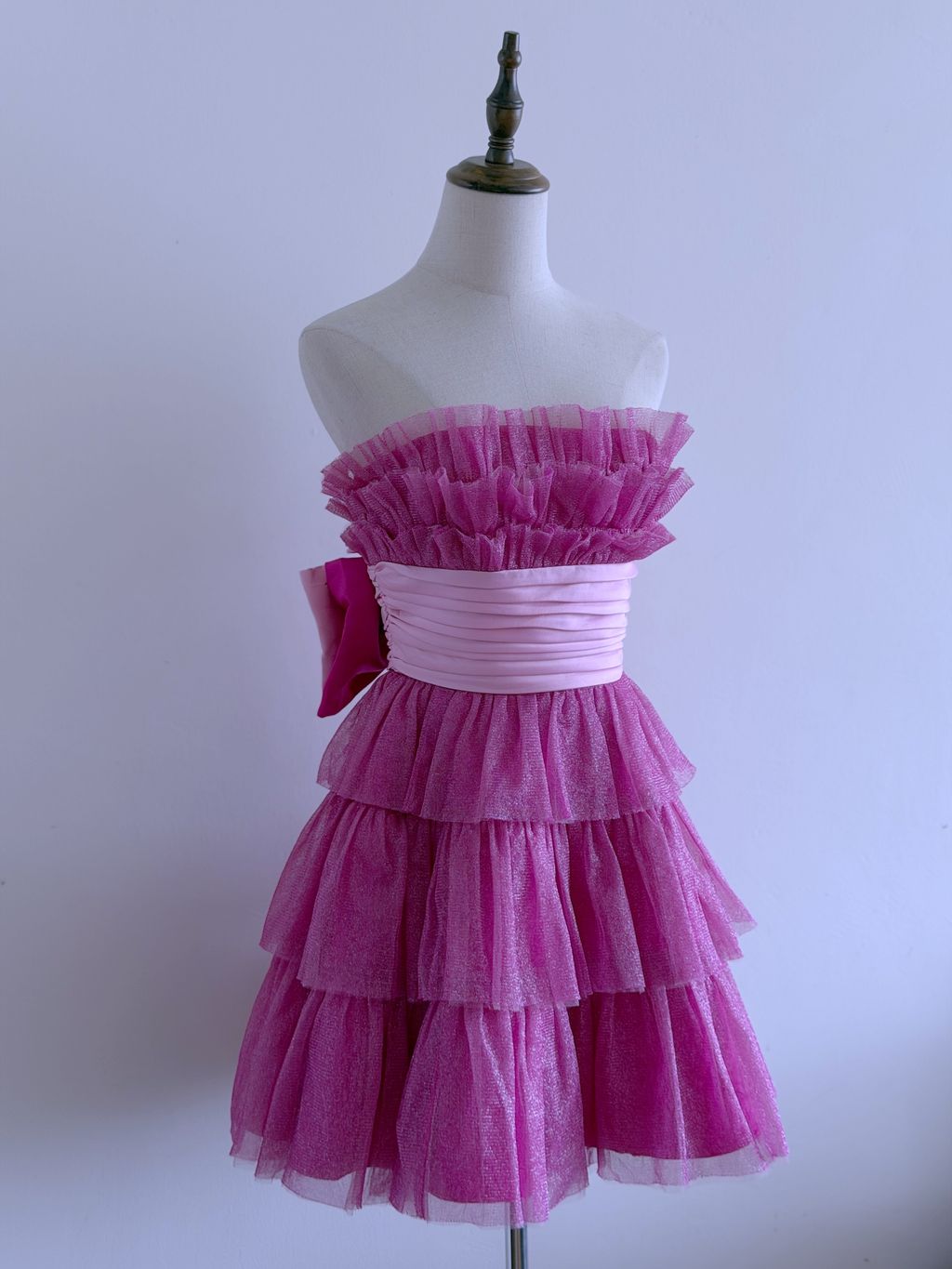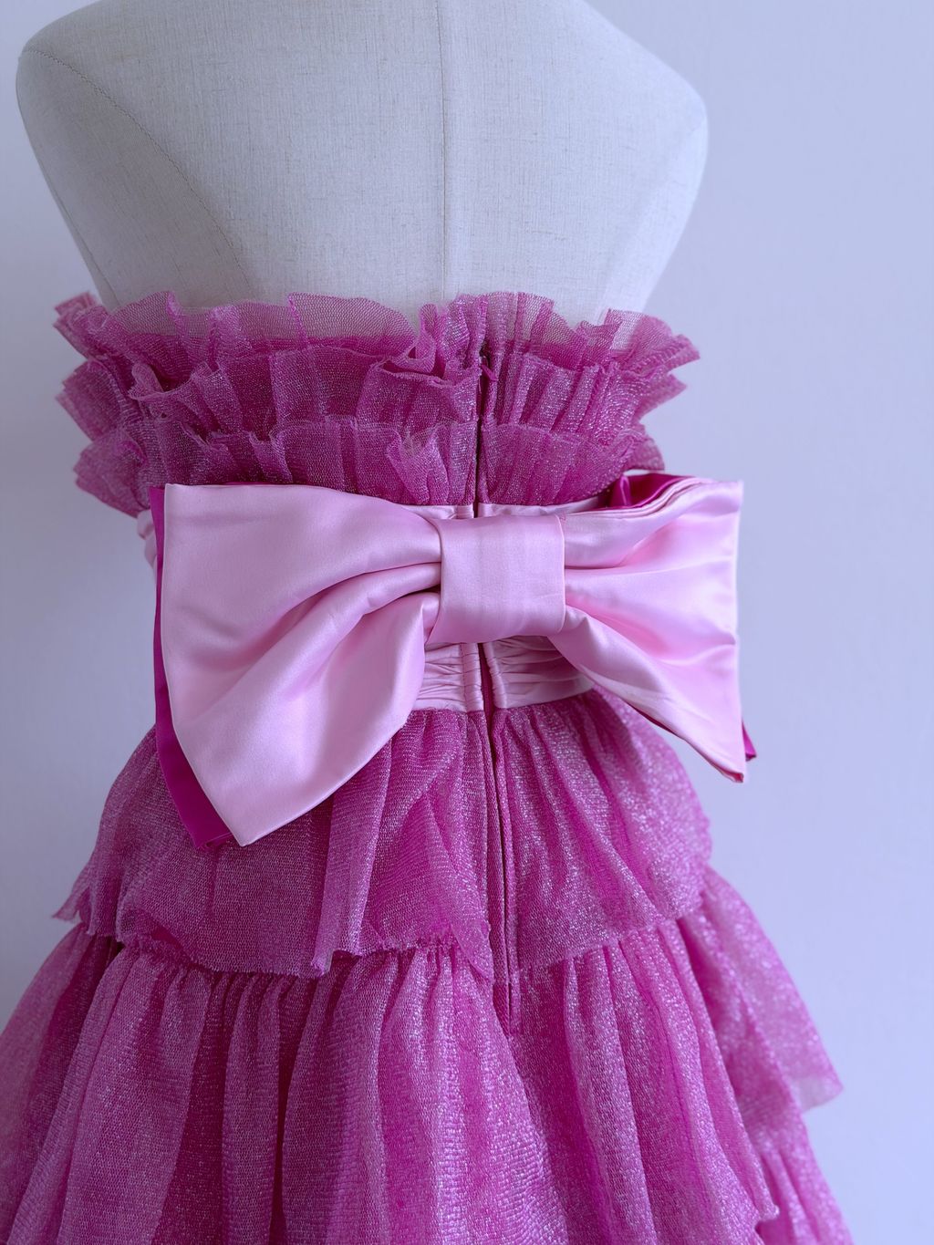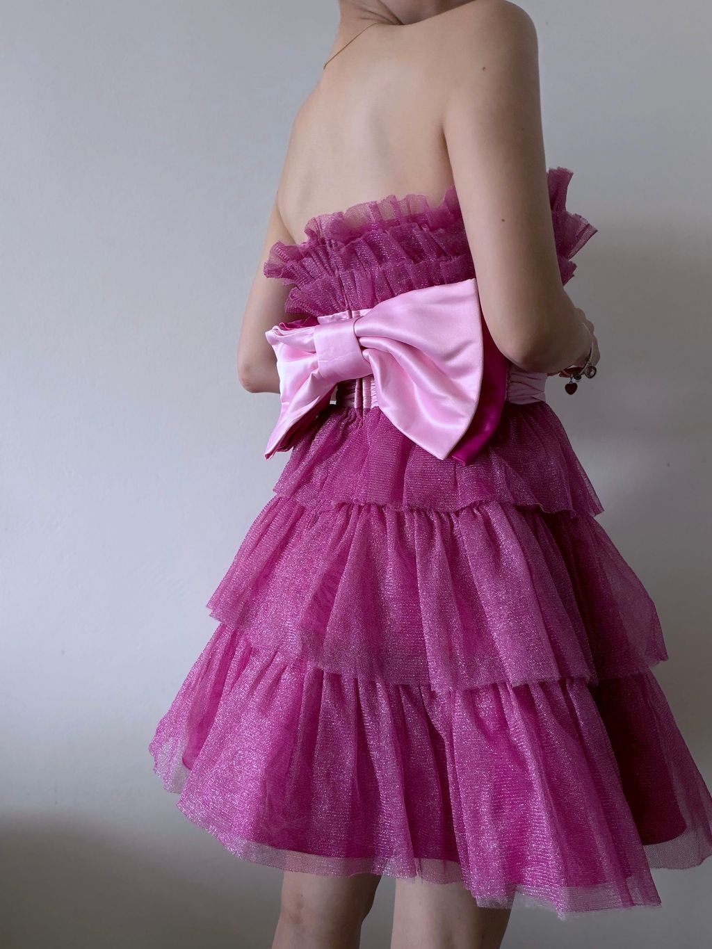 A whimsical nod to early 2000s glamour, this 2008 Betsey Johnson evening dress captures playful, party-ready charm with its voluminous tiered tulle “cupcake” silhouette. The strapless mini design is cinched at the waist with a wide pleated satin band, finished with a large, statement bow at the back for a dramatic, flirty touch.