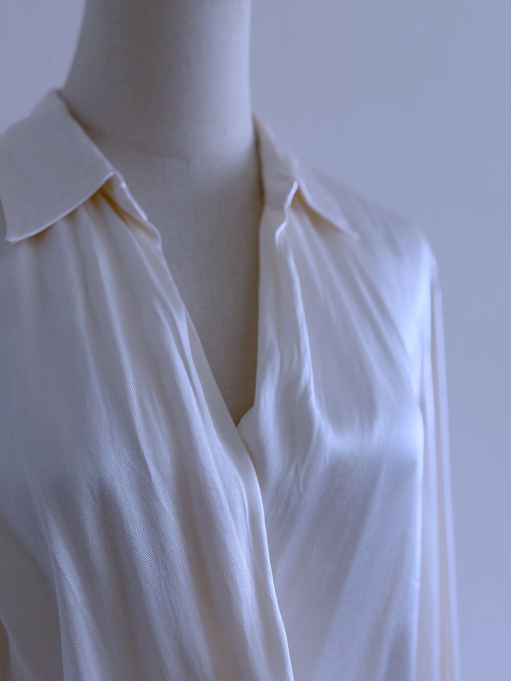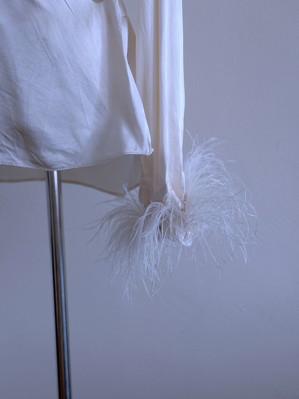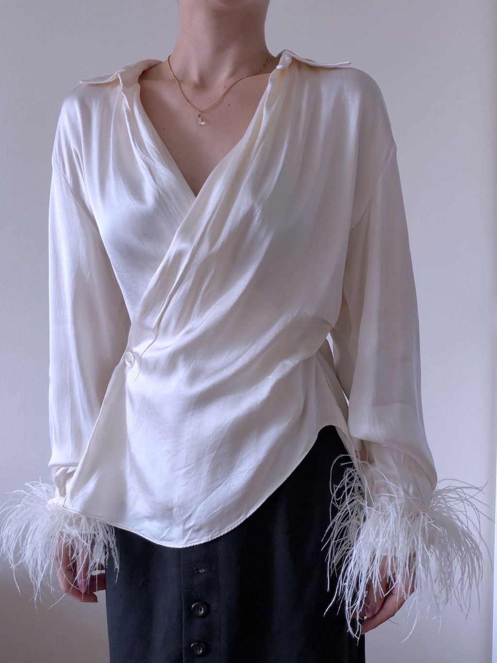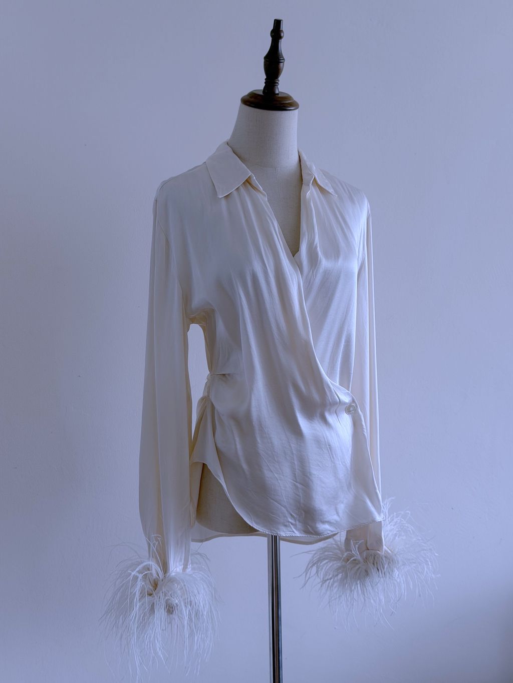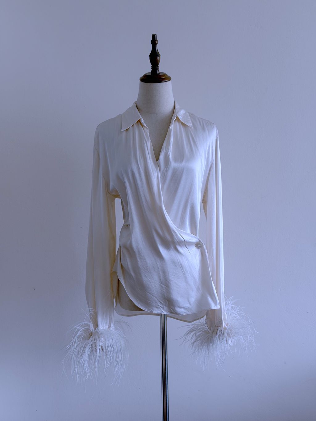 A statement of refined vintage elegance, this long-sleeved wrap blouse is crafted from a fluid, lustrous satin-blend fabric that drapes beautifully over the body. The surplice V-neckline creates a flattering, feminine silhouette, while the distinctive detachable real feather-trimmed cuffs add an unexpected touch of drama and luxury.