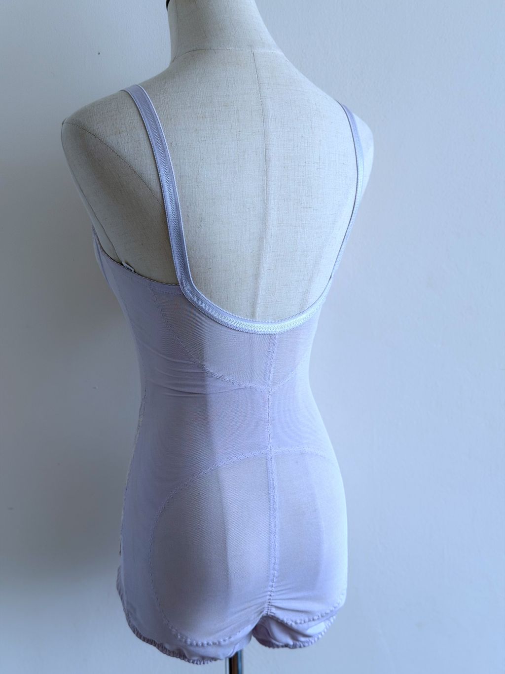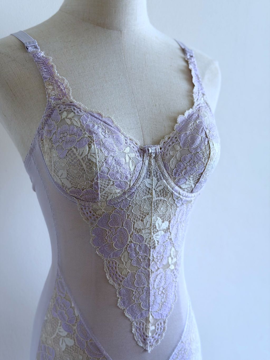 A whisper of lavender and lace, this Fidelia lace bodysuit rests on a soft, smooth lavender base fabric, wrapped in intricate white lace overlays that bloom across the bust, abdomen, and hips. The combination feels tender, ethereal, and beautifully romantic.