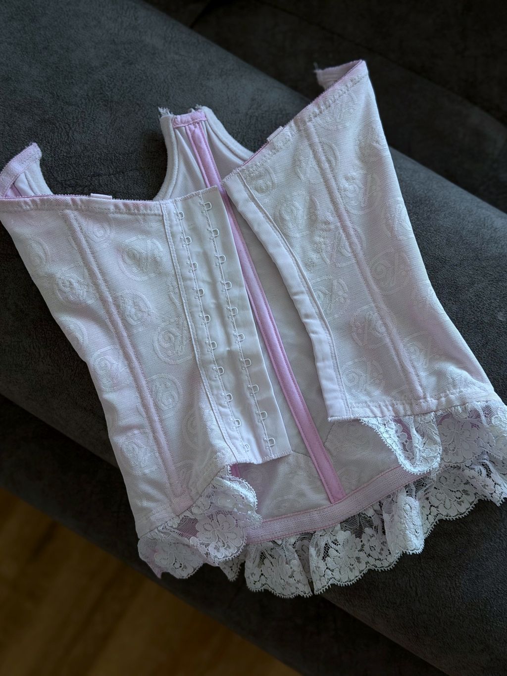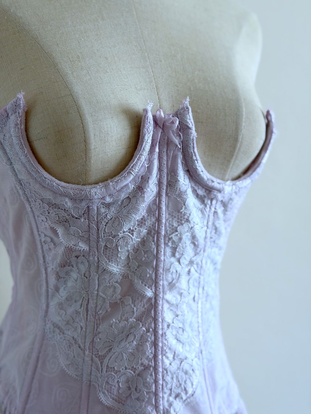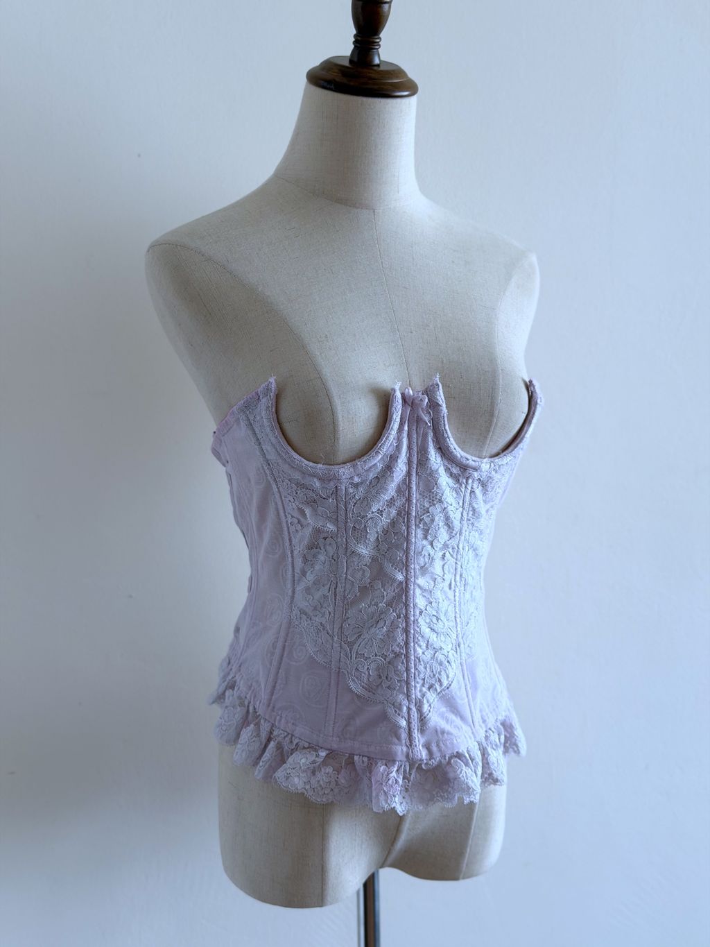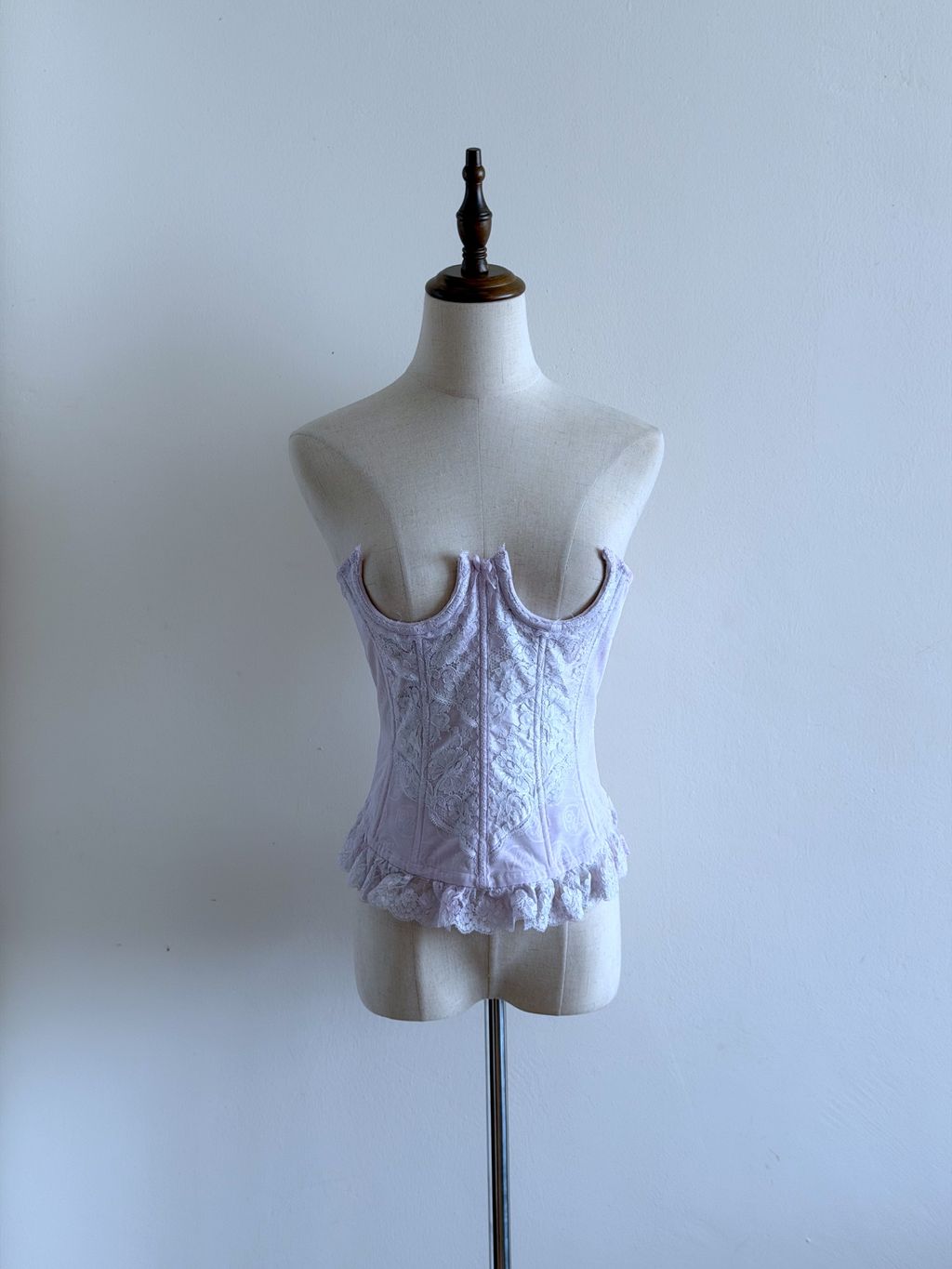A soft breath of lilac wrapped in vintage charm, this corset-style bustier is a delicate dream in light purple, veiled with a white lace overlay that feels like morning light drifting through sheer curtains.