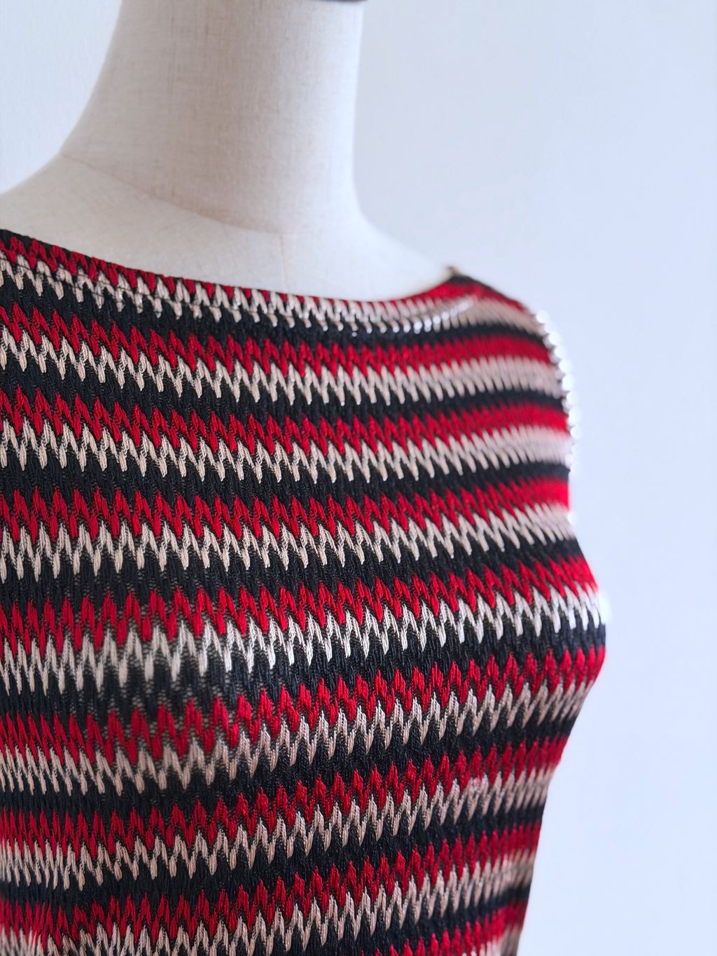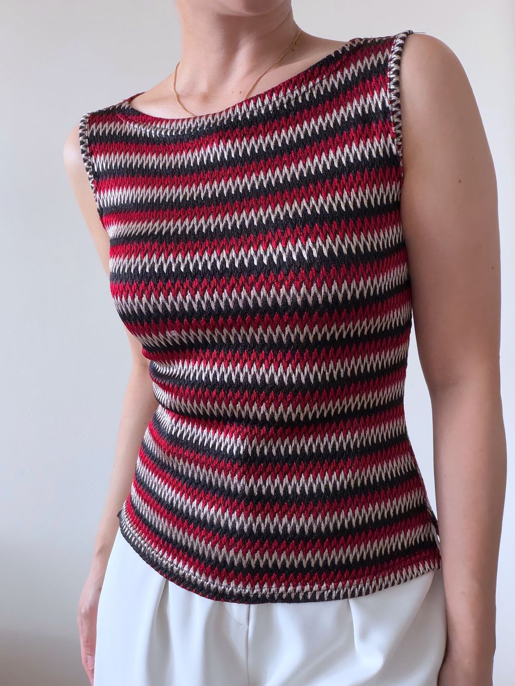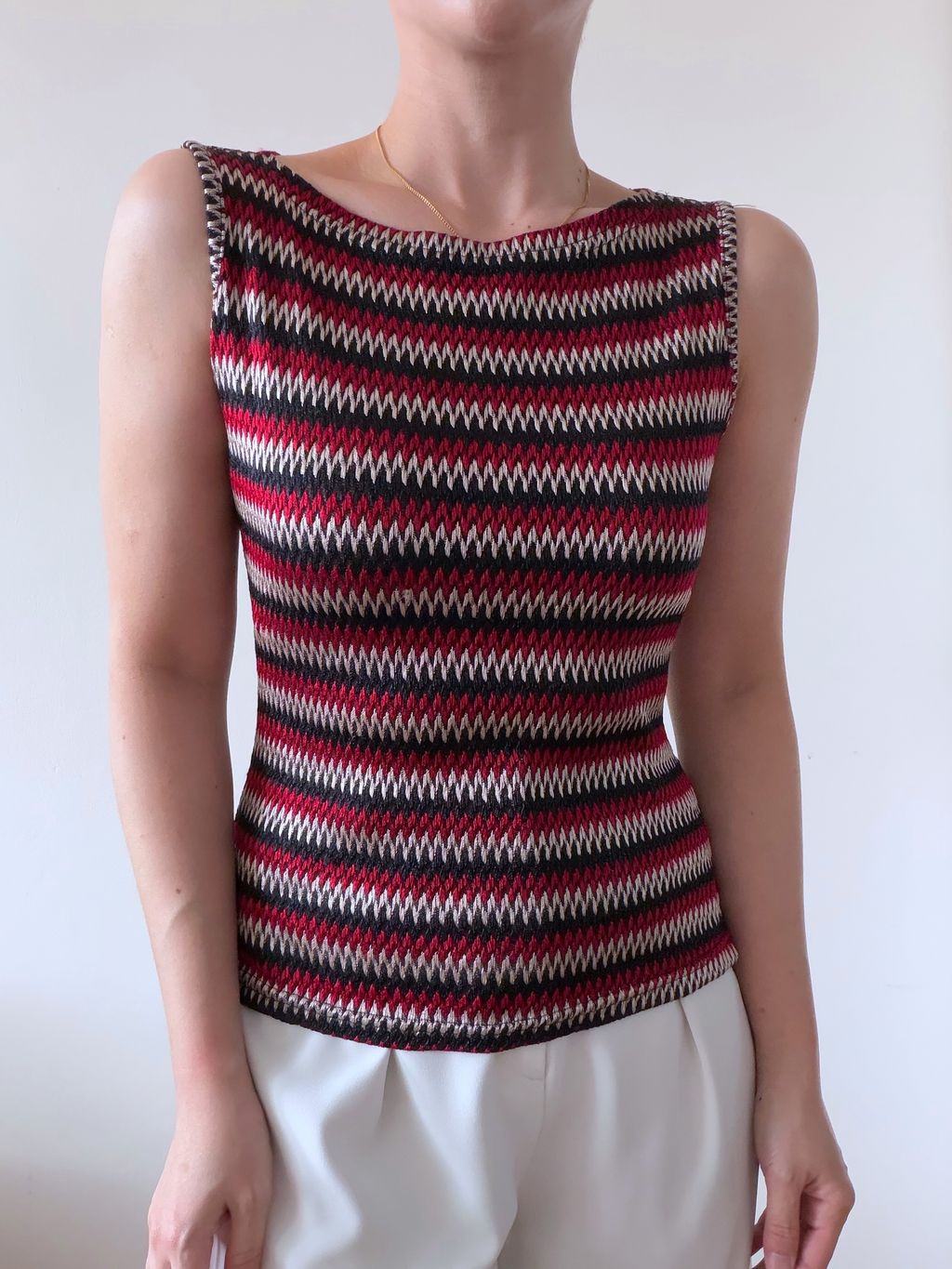 A beautifully 1960s textured vintage find from A. Byer, featuring a sleeveless silhouette and intricate crochet knitwork. The chevron zig-zag pattern adds rhythm and dimension, creating a playful balance between structure and softness. Effortlessly versatile, perfect for layering or wearing on its own in warm