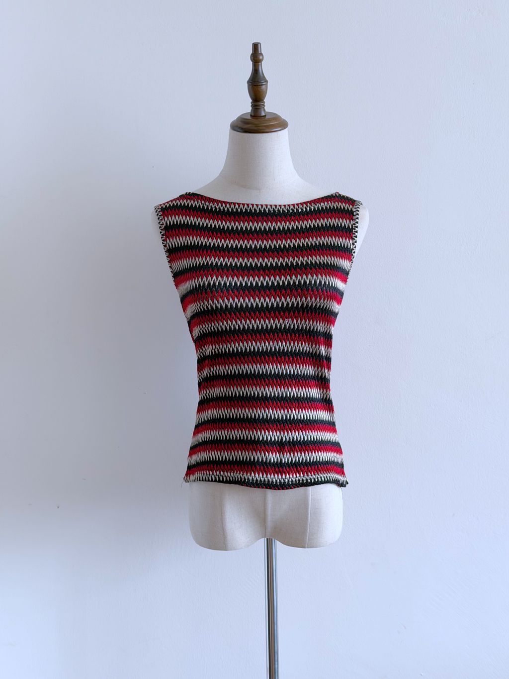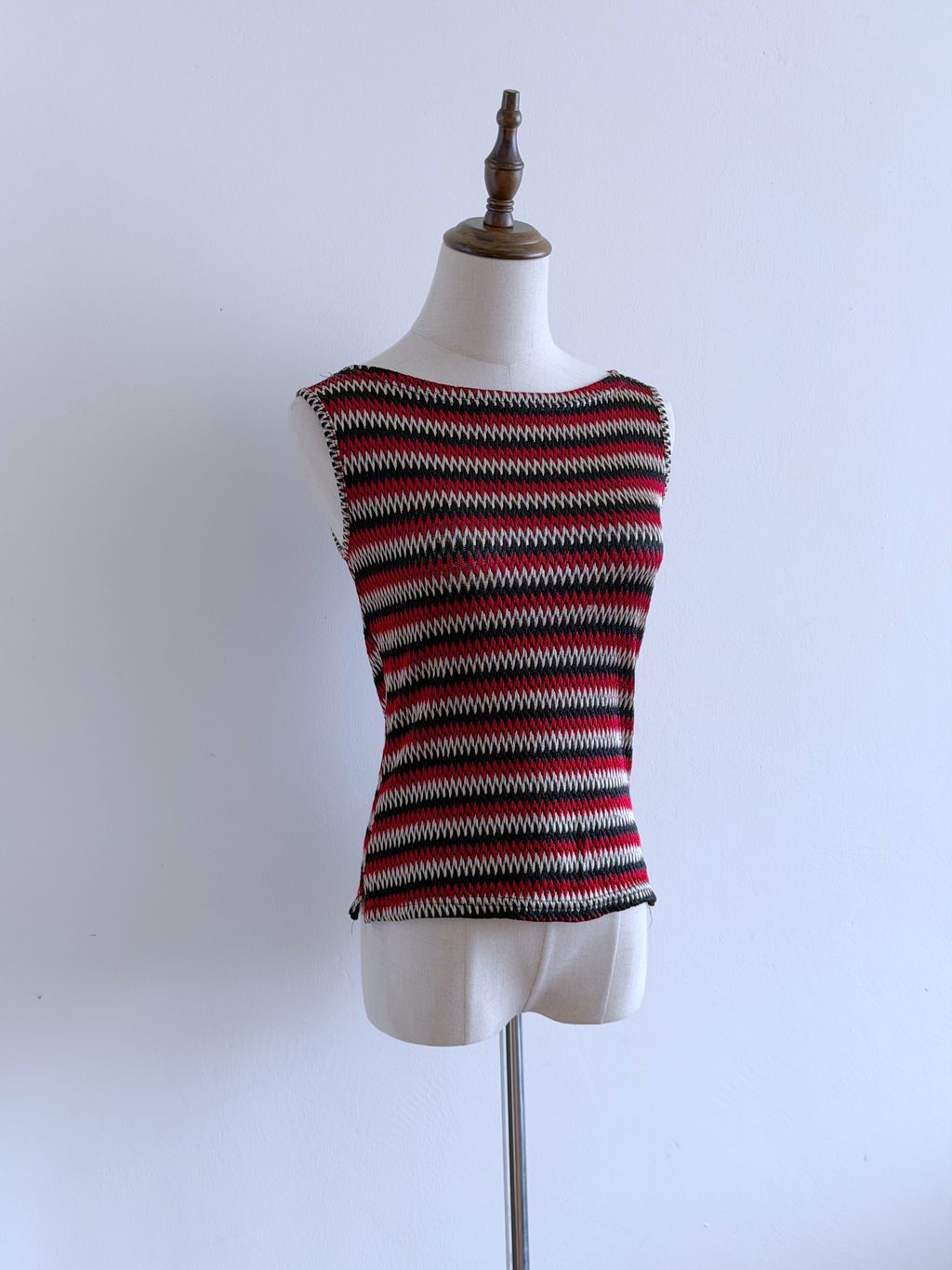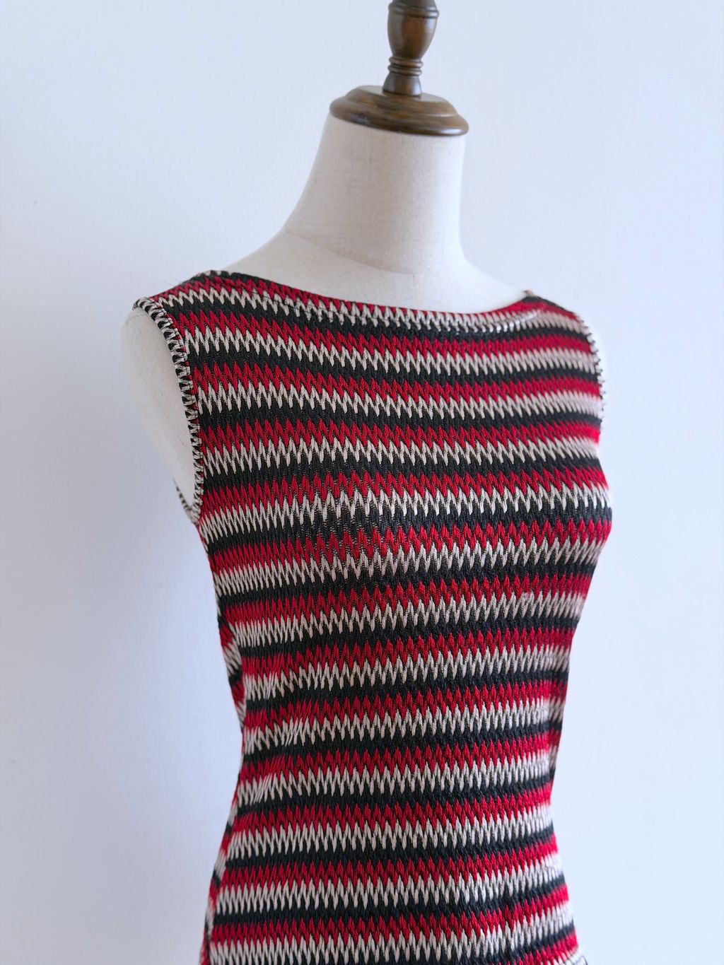 A beautifully 1960s textured vintage find from A. Byer, featuring a sleeveless silhouette and intricate crochet knitwork. The chevron zig-zag pattern adds rhythm and dimension, creating a playful balance between structure and softness. Effortlessly versatile, perfect for layering or wearing on its own in warm