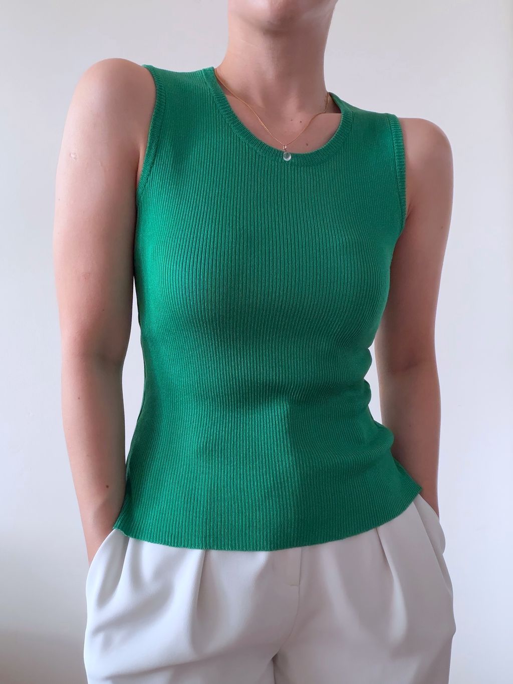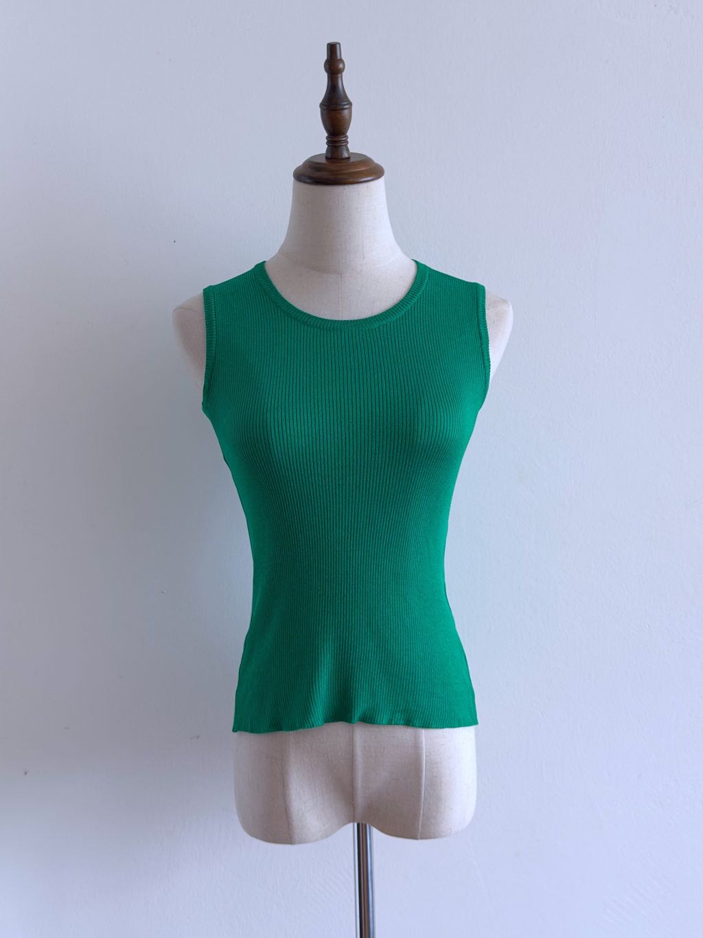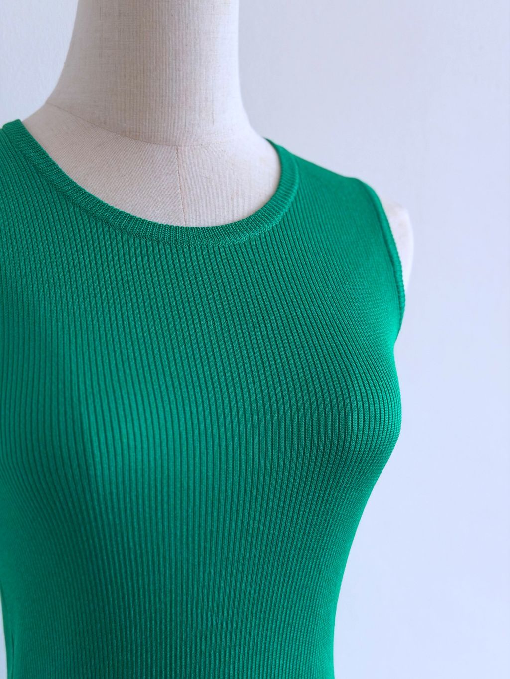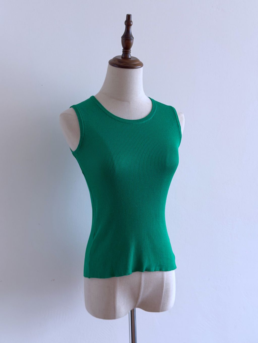 A timeless essential with a touch of vintage ease. Soft ribbed knit, this sleeveless tank features a classic round neckline and a flattering, body-skimming fit. The muted green tone brings a fresh yet grounded charm, perfect worn alone or layered under tailoring