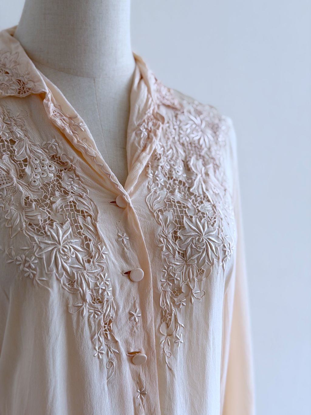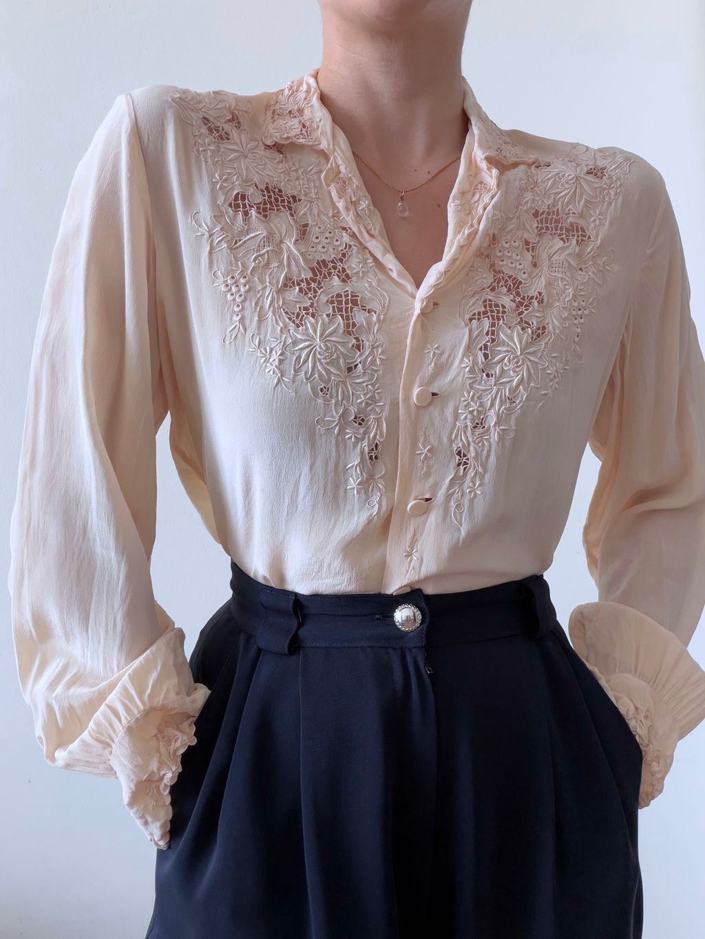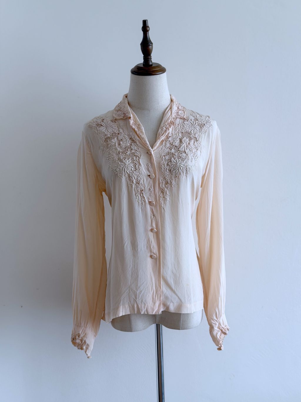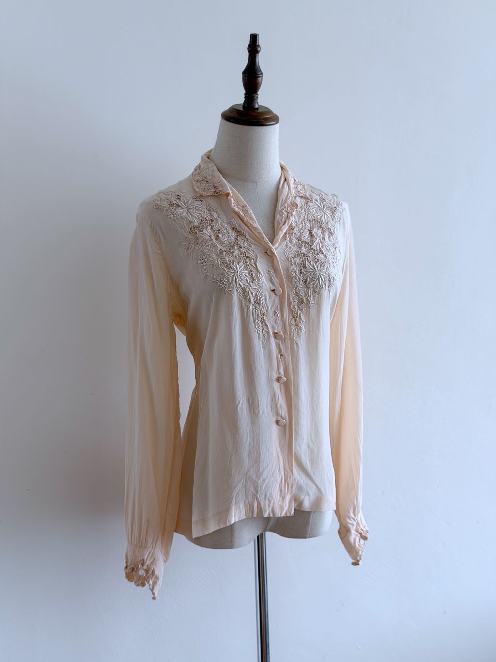 Steeped in 1940s elegance, this vintage pure silk blouse is adorned with intricate hand-embroidered florals gracing the collar, front, and cuffs. Softly lustrous with a refined drape, it carries the quiet charm of old-world craftsmanship.