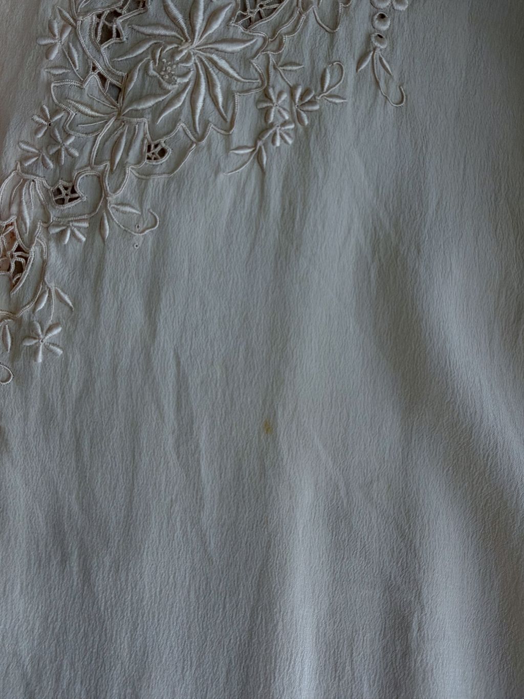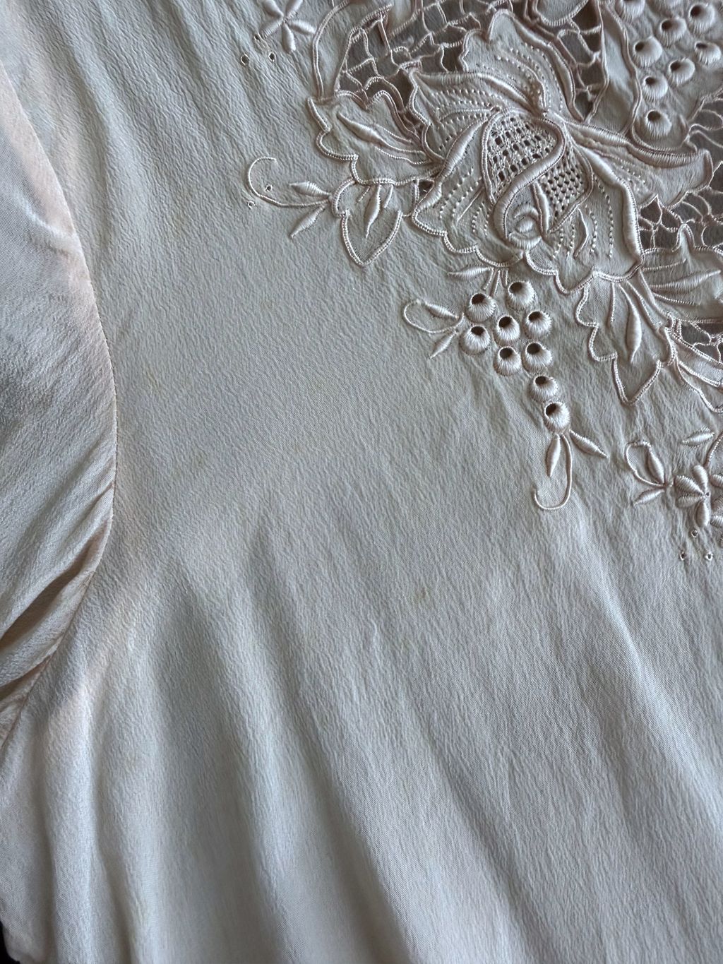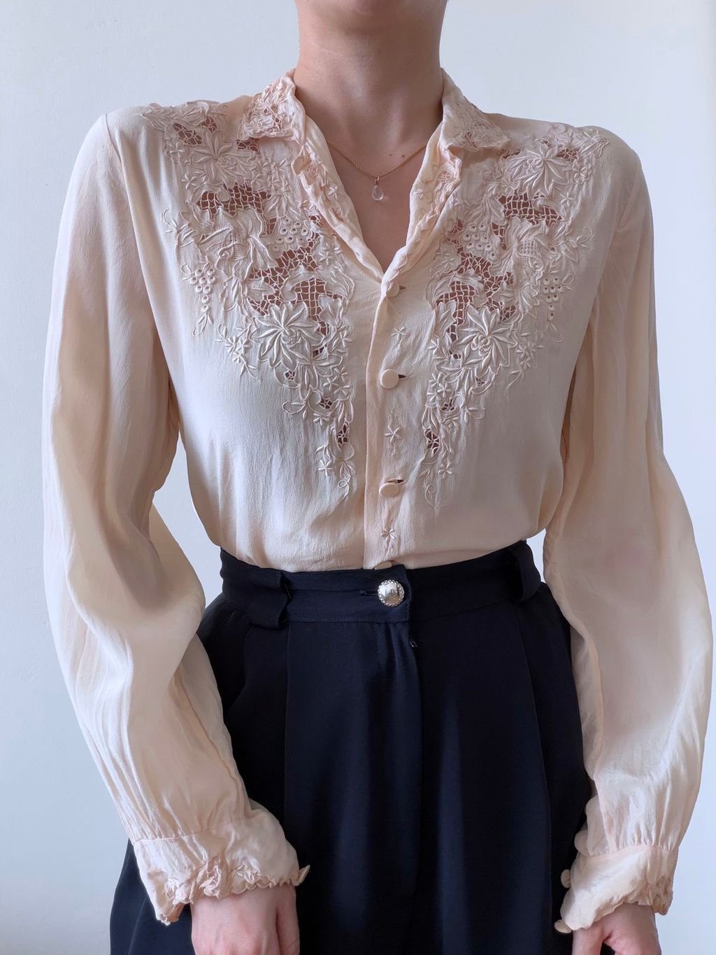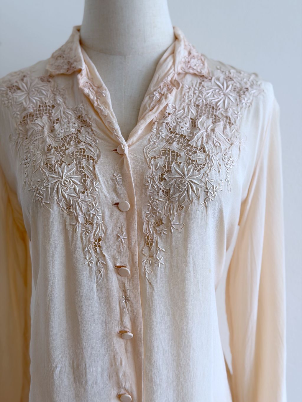 Steeped in 1940s elegance, this vintage pure silk blouse is adorned with intricate hand-embroidered florals gracing the collar, front, and cuffs. Softly lustrous with a refined drape, it carries the quiet charm of old-world craftsmanship.