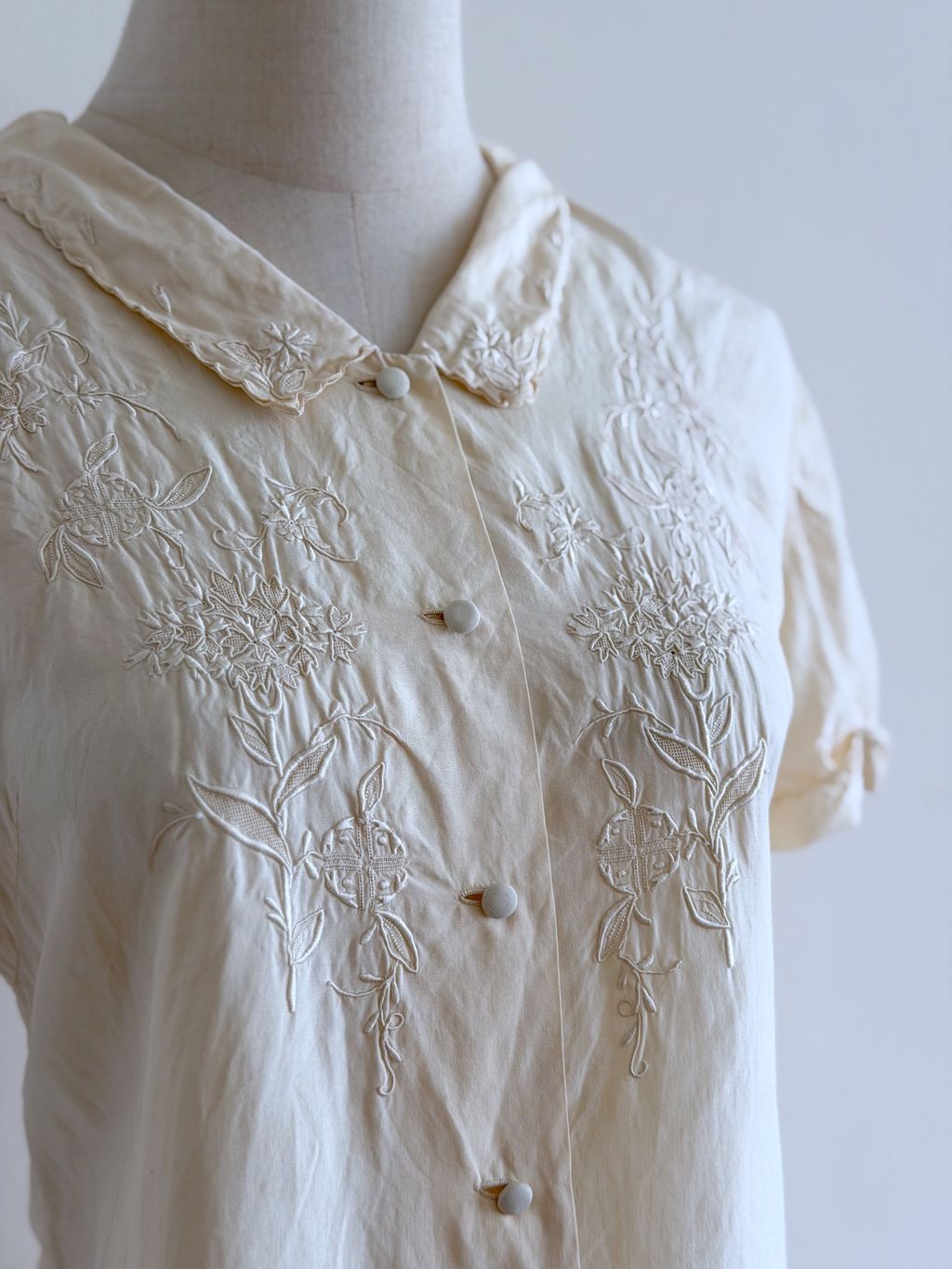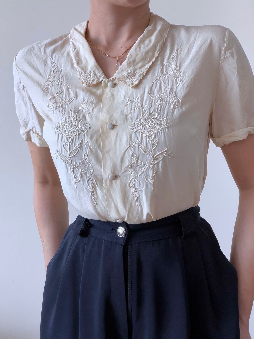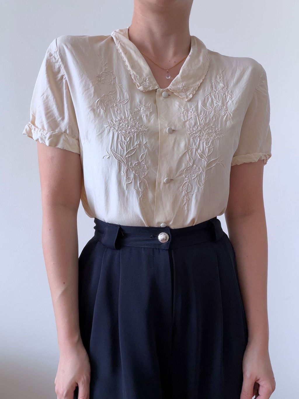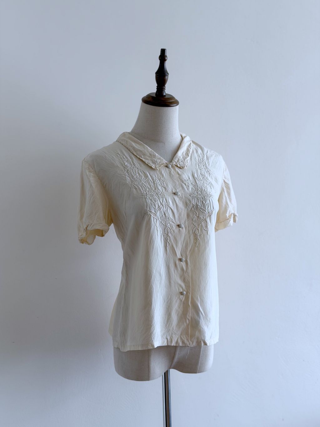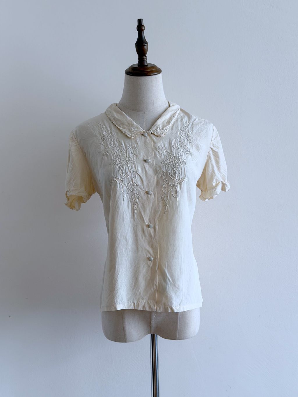 Evoking the quiet grace of the 1930s and 40s, this vintage ivory blouse is crafted from pure silk and adorned with delicate hand embroidery in soft floral motifs. The Peter Pan collar features scalloped edges and intricate stitching, while the fitted silhouette flatters with understated poise. Every detail feels intentional, a piece that embodies timeless femininity and gentle refinement.