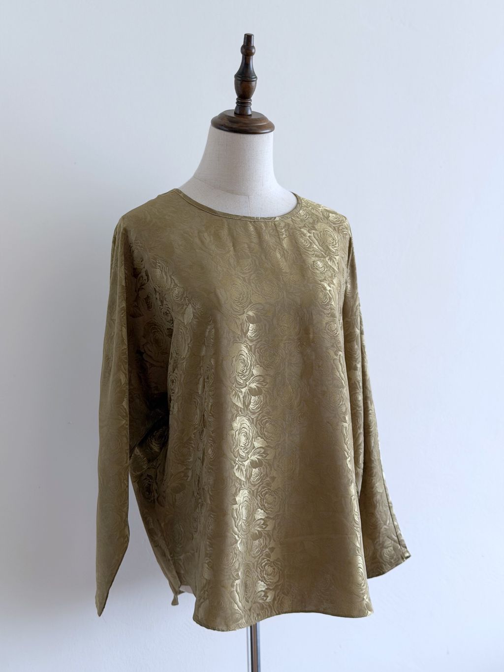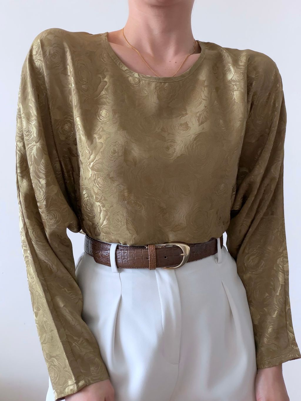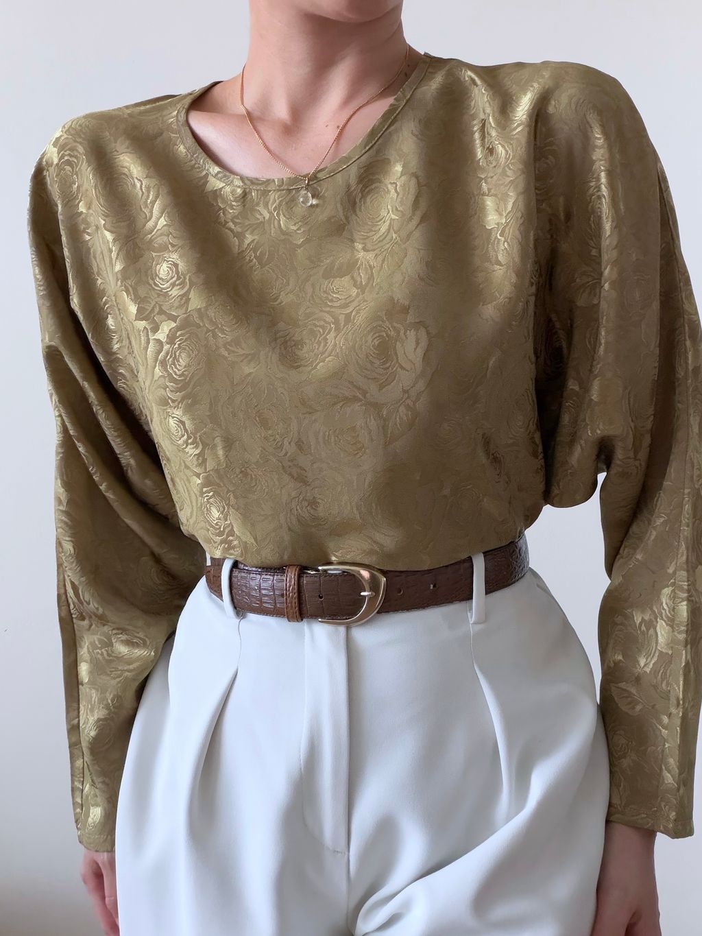 Bathed in soft shades of olive and gold, this vintage jacquard blouse shimmers with a raised rose pattern that catches the light in quiet elegance. The dolman sleeves and loose, flowing silhouette drape beautifully, evoking the effortless glamour of 80s femininity.
