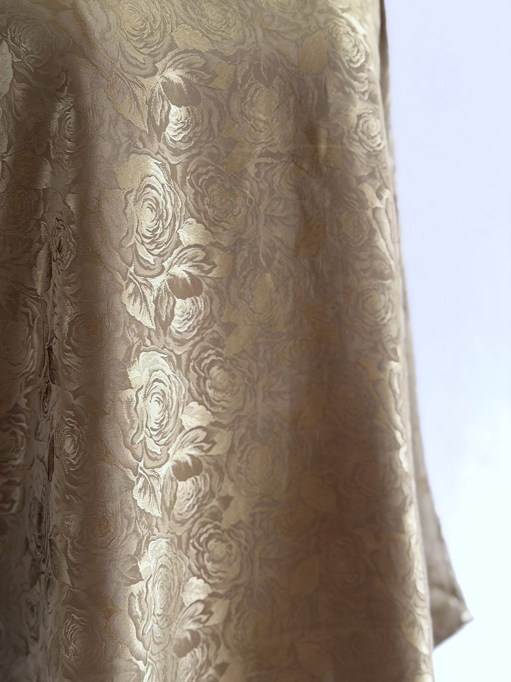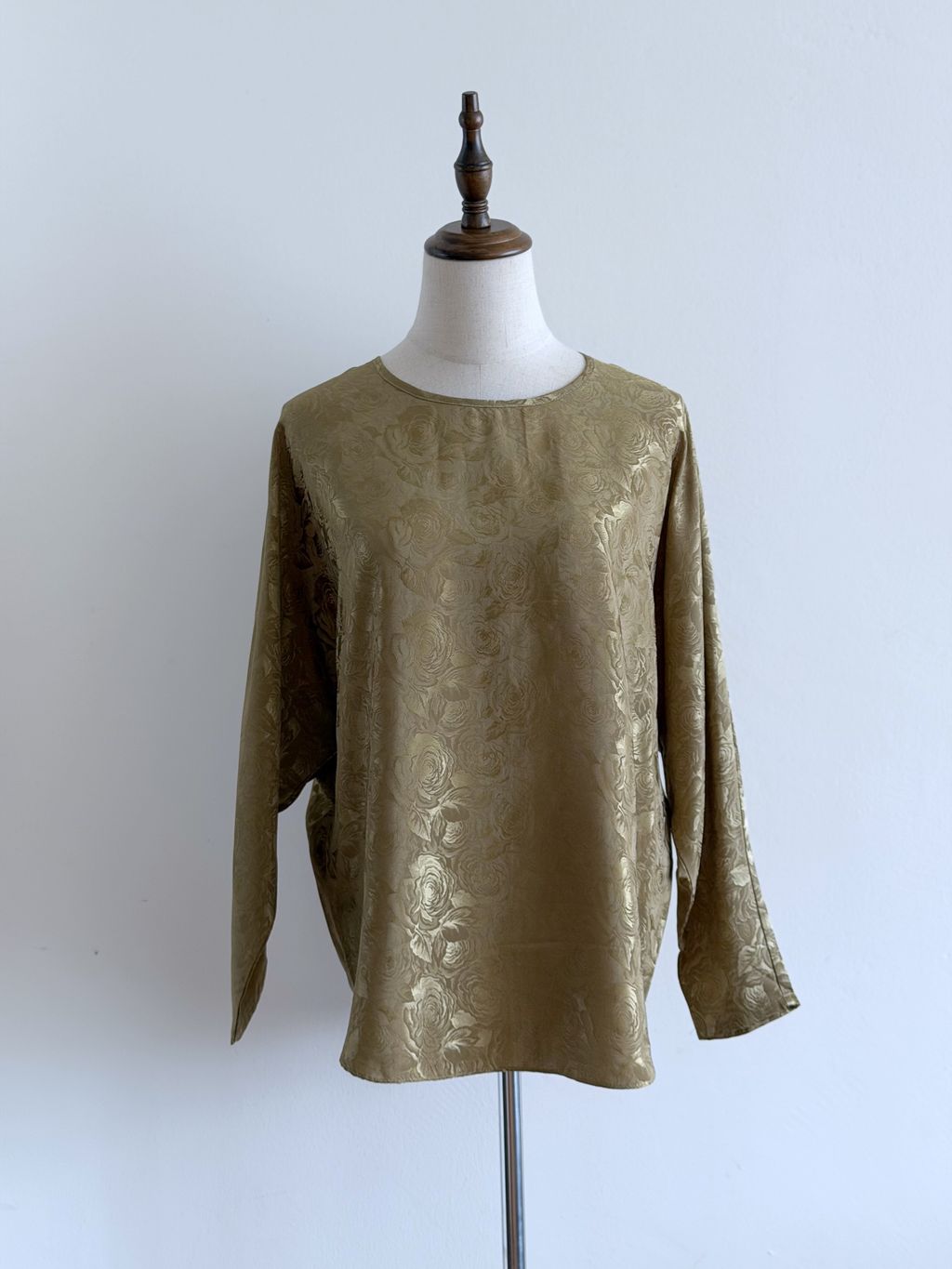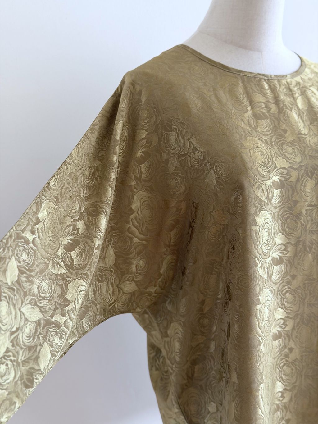 Bathed in soft shades of olive and gold, this vintage jacquard blouse shimmers with a raised rose pattern that catches the light in quiet elegance. The dolman sleeves and loose, flowing silhouette drape beautifully, evoking the effortless glamour of 80s femininity.