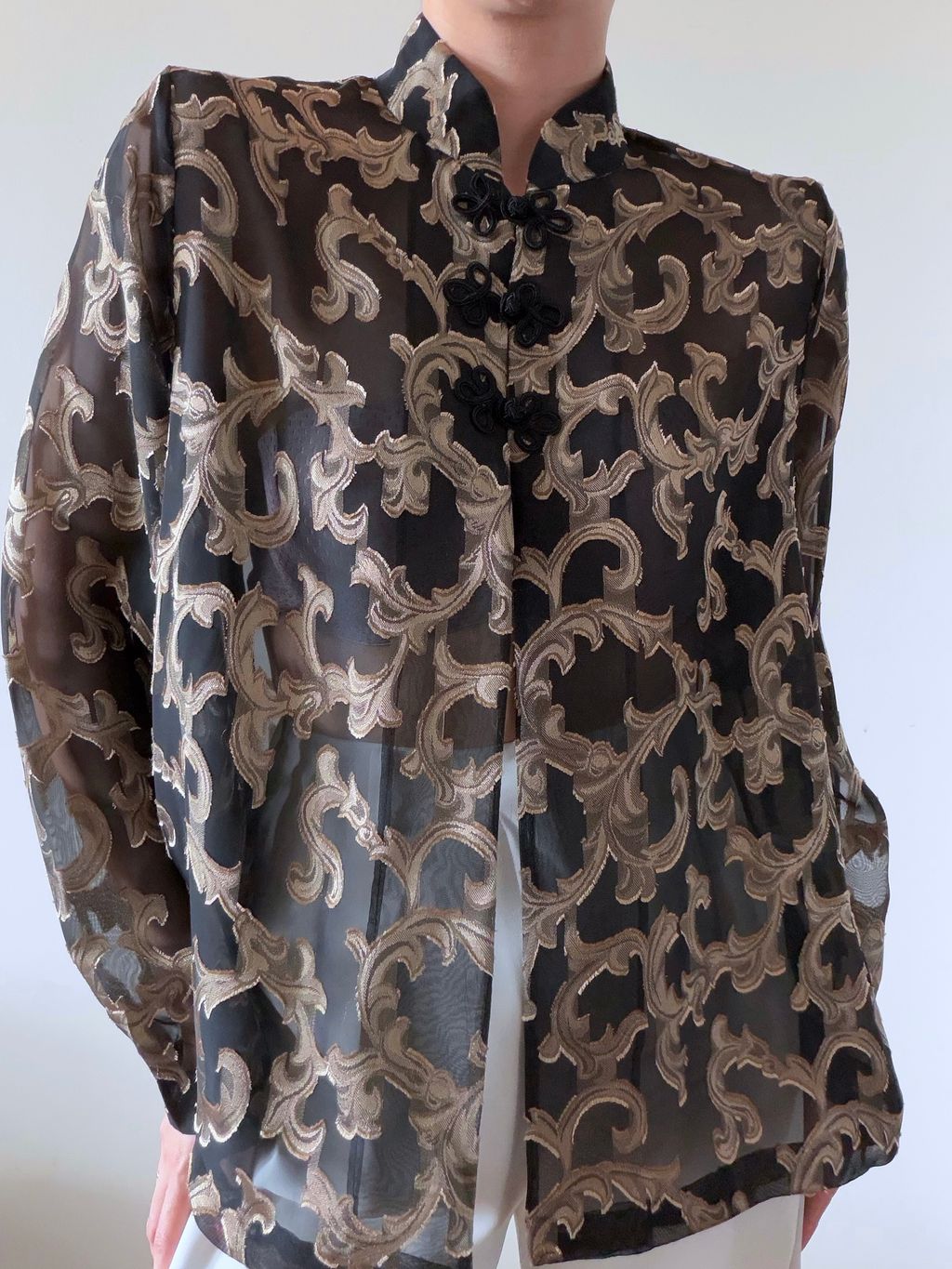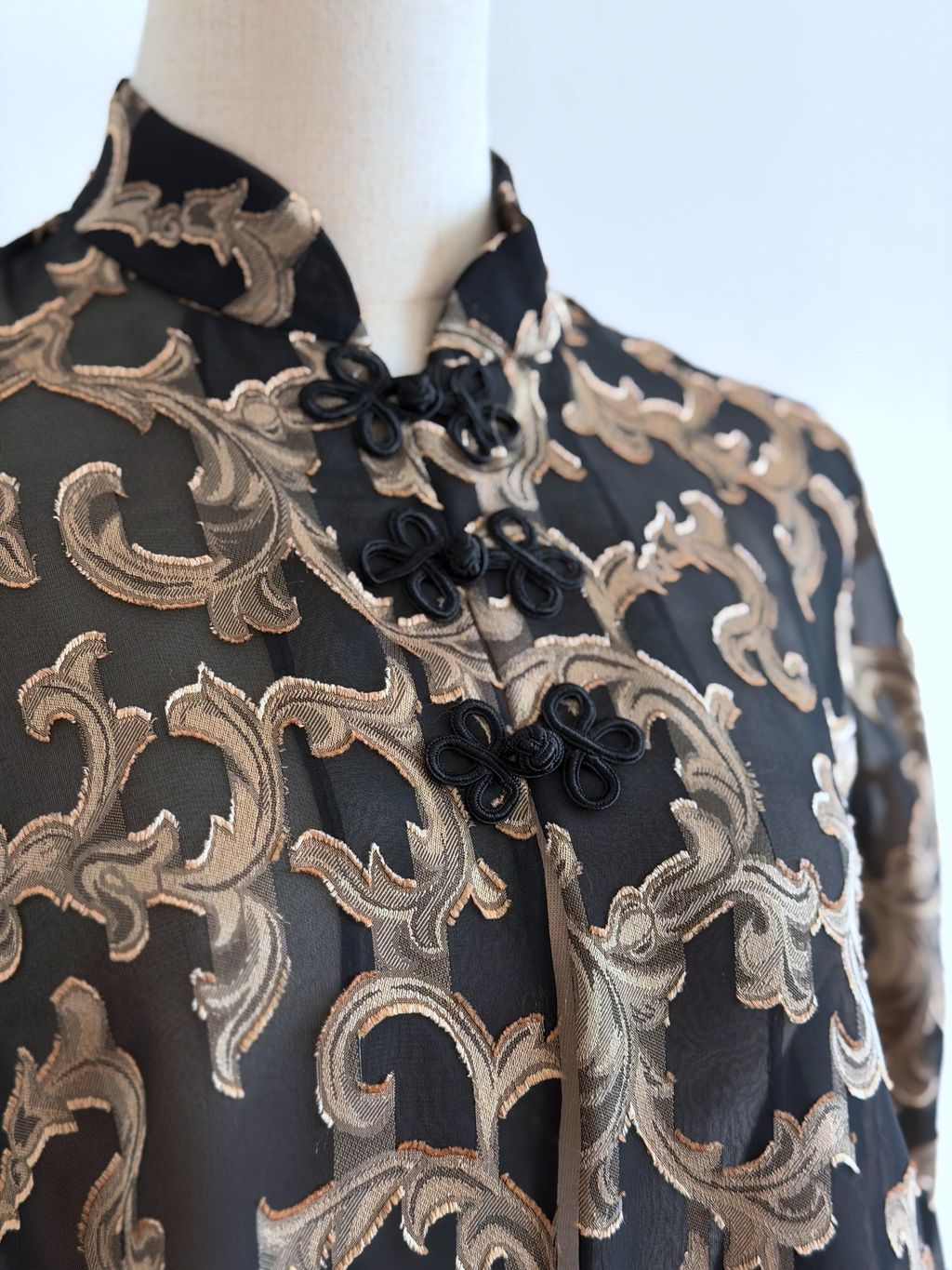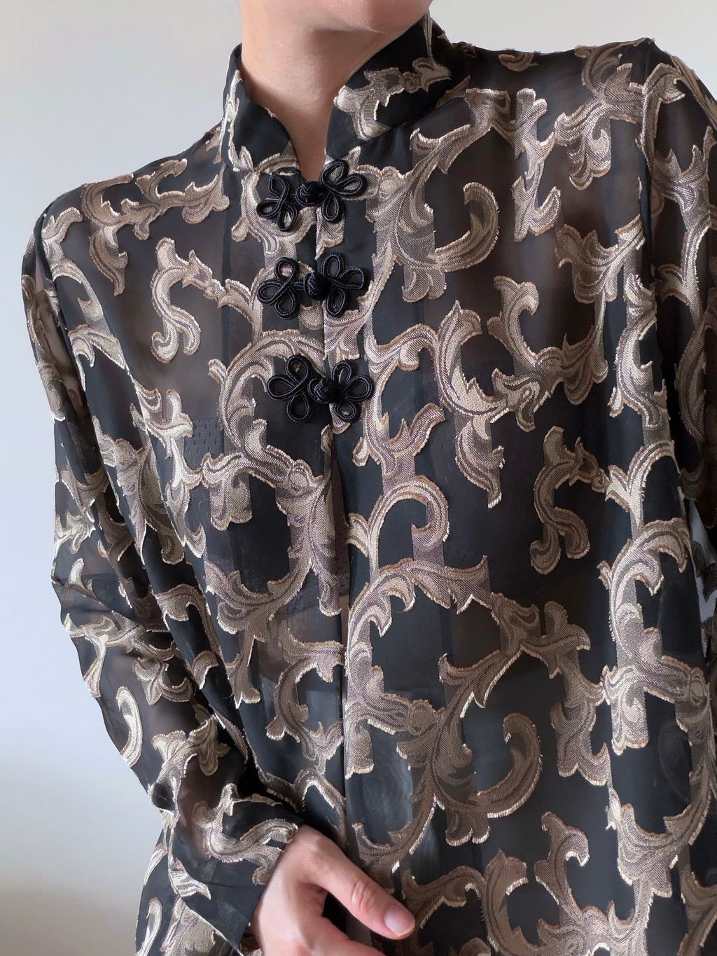 A nod to vintage oriental elegance, this blouse features a refined mandarin collar and three delicate frog closures at the front, it drapes open like a soft cape, catching light with every movement. Light yet opulent, it drapes with quiet allure, balancing tradition and modern femininity in one luminous piece.