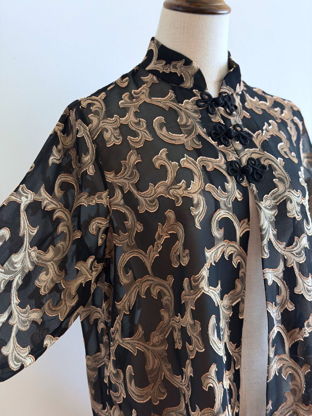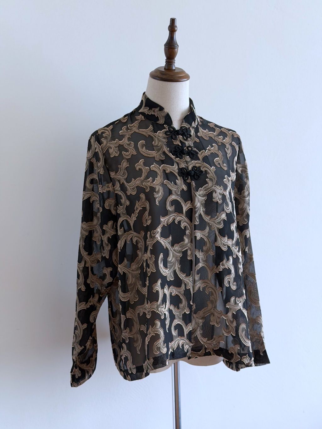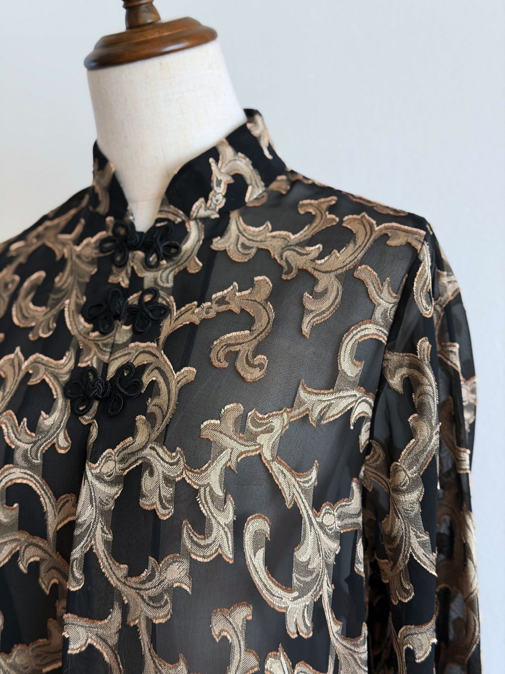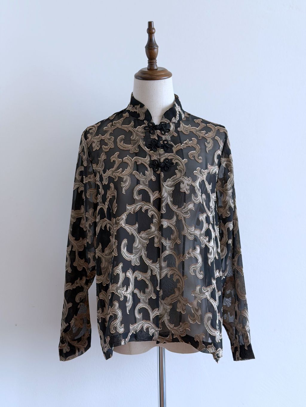 A nod to vintage oriental elegance, this blouse features a refined mandarin collar and three delicate frog closures at the front, it drapes open like a soft cape, catching light with every movement. Light yet opulent, it drapes with quiet allure, balancing tradition and modern femininity in one luminous piece.