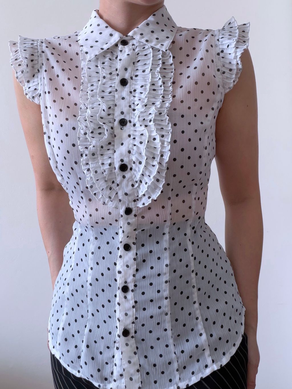 Playful parisian yet poised, this vintage sleeveless blouse features a cascading jabot ruffle front framed by a soft bib collar. Semi-sheer with a gently stretchy waist at the back, it flatters the form while keeping a light, feminine drape.