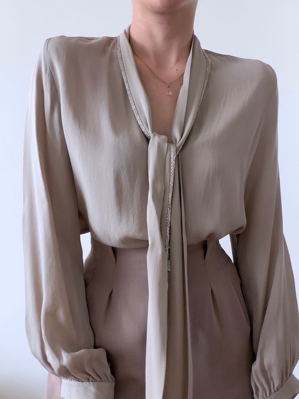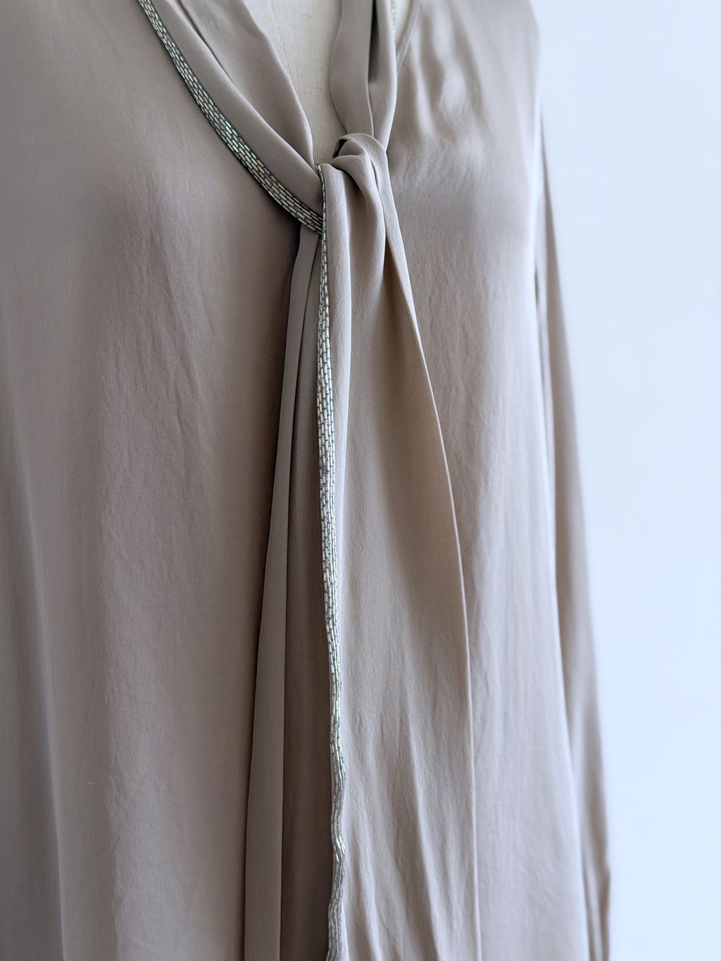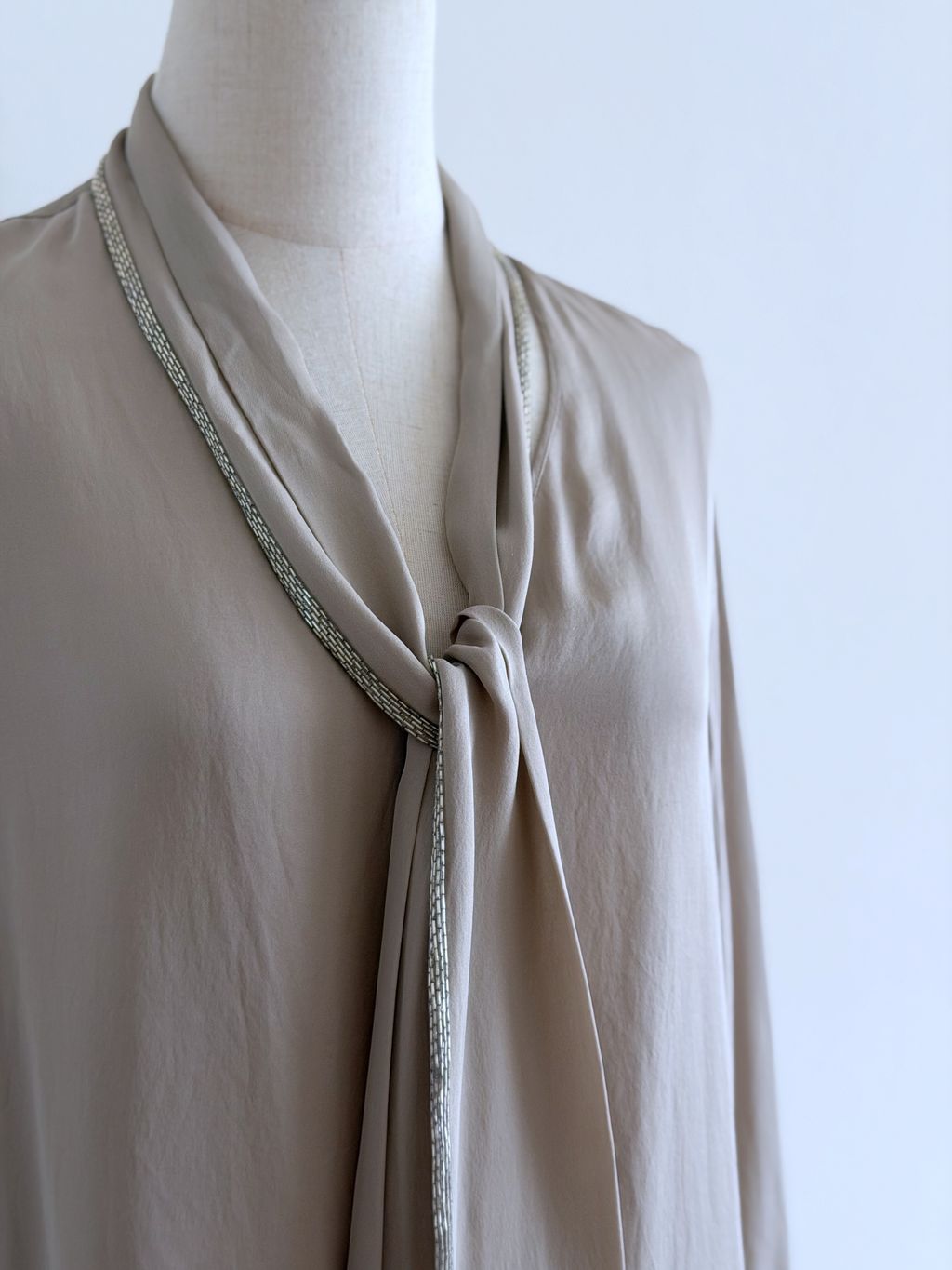 A rare Ralph Lauren Black Label piece, La Palma embodies understated luxury in pure silk. The fluid taupe satin drapes effortlessly, while the elegant pussybow glimmers with four rows of hand-sewn pewter bugle beads. Refined yet distinctive, it evokes the quiet sophistication of modern couture