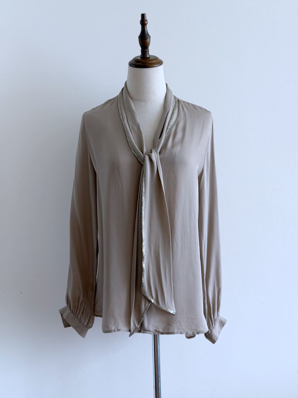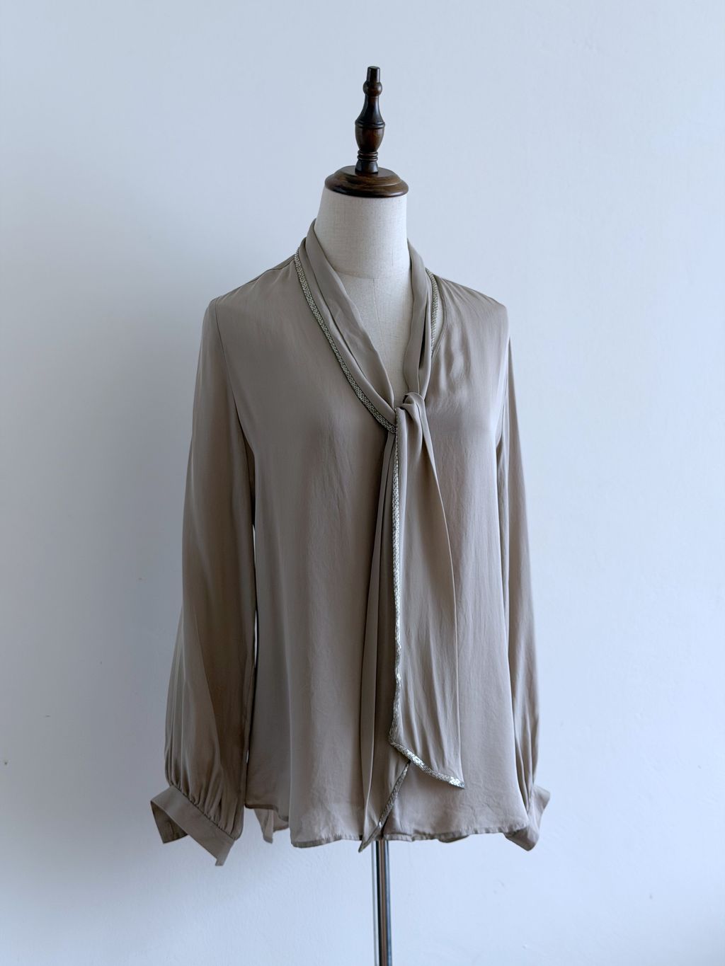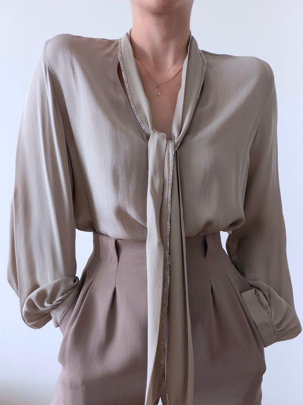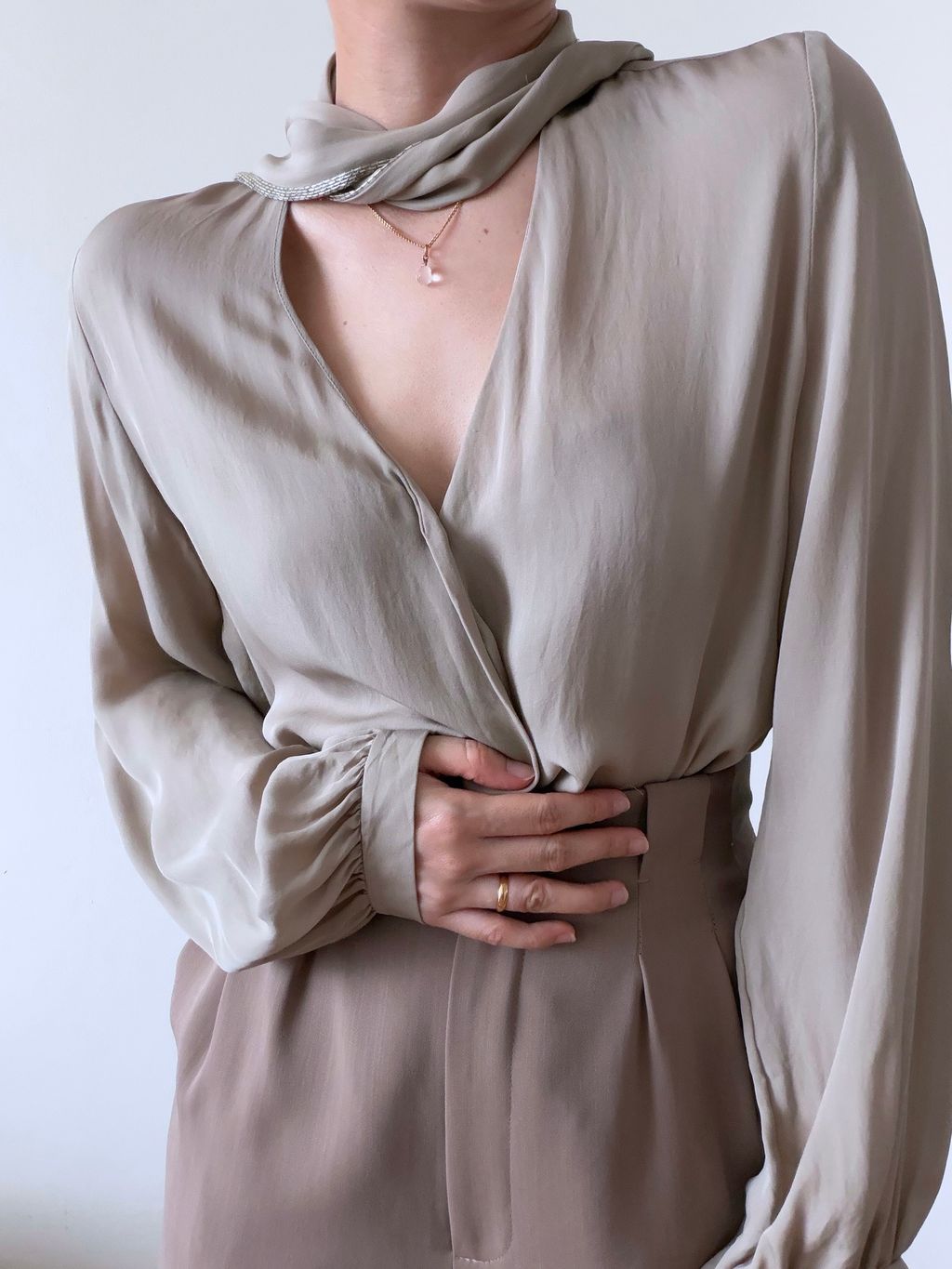 A rare Ralph Lauren Black Label piece, La Palma embodies understated luxury in pure silk. The fluid taupe satin drapes effortlessly, while the elegant pussybow glimmers with four rows of hand-sewn pewter bugle beads. Refined yet distinctive, it evokes the quiet sophistication of modern couture