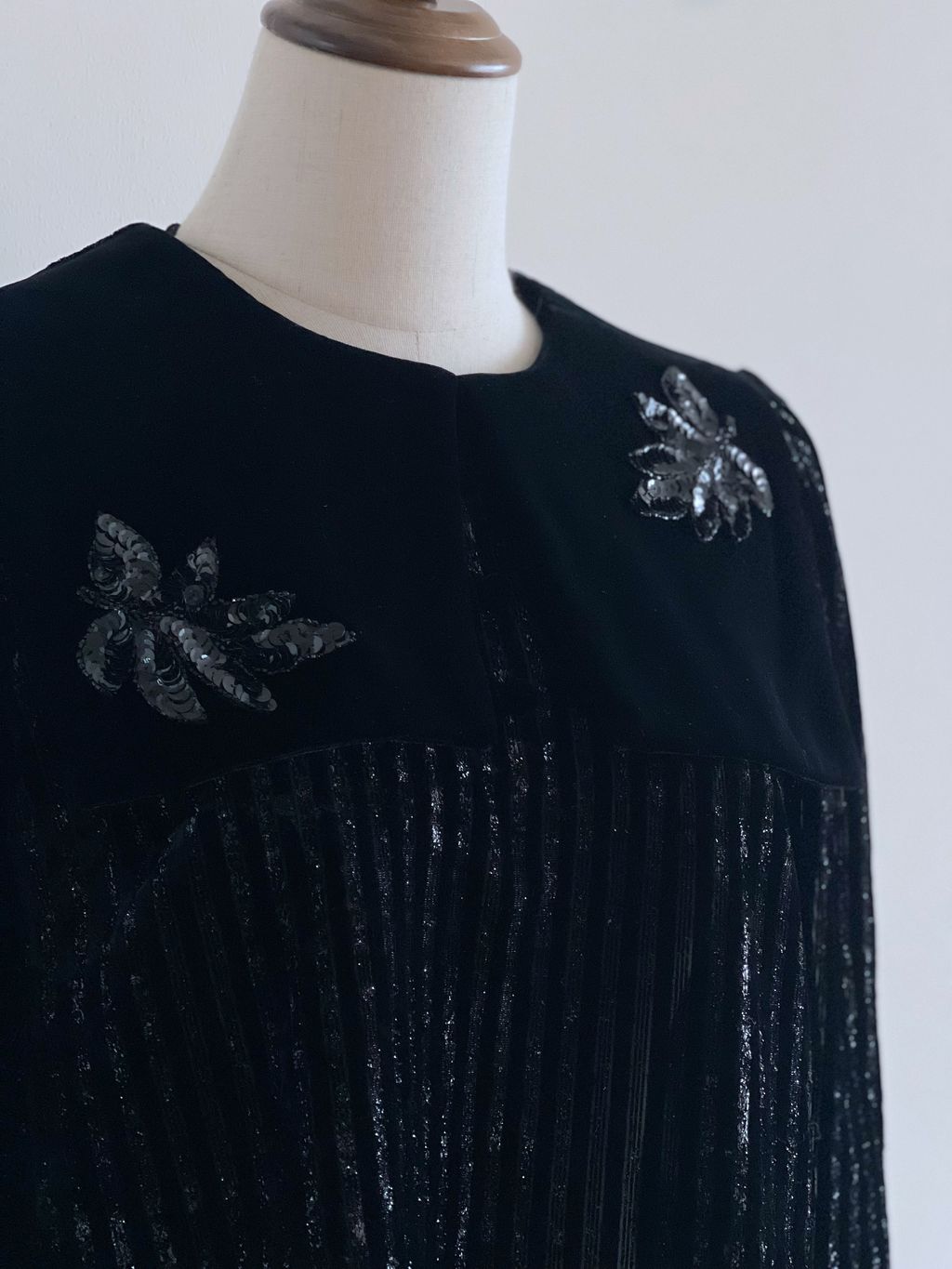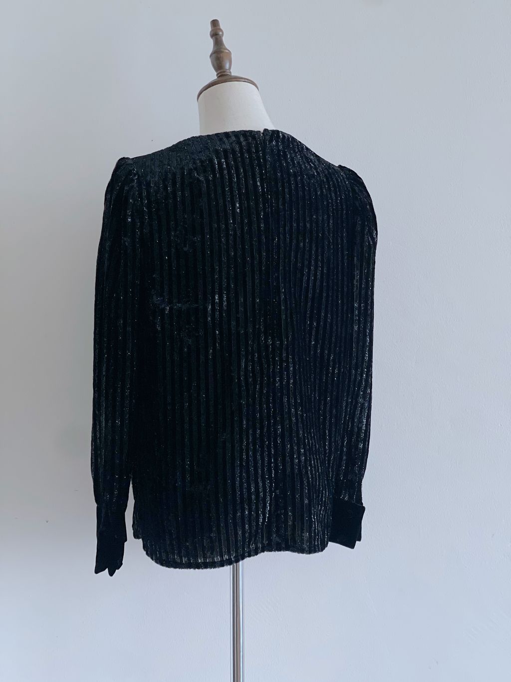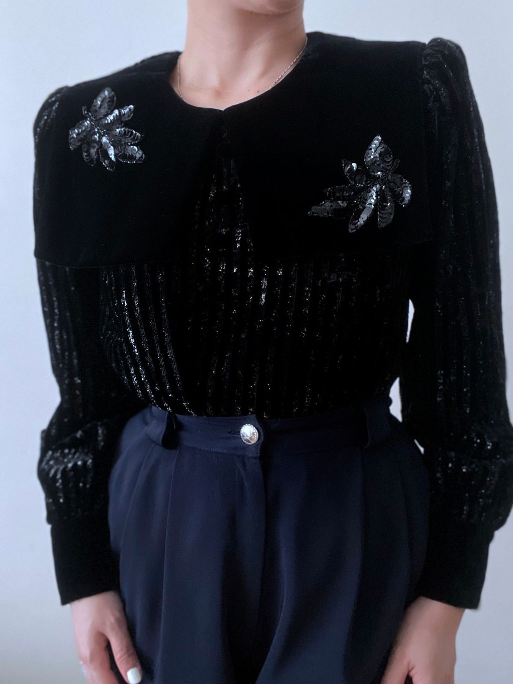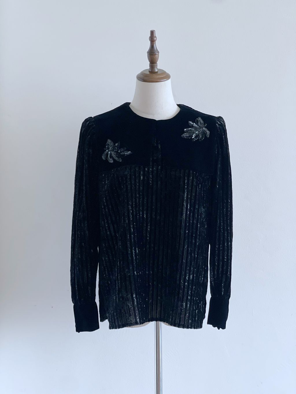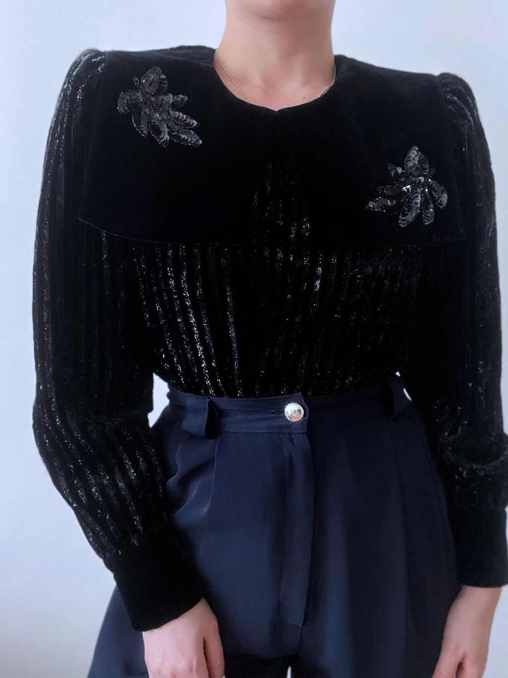 Lush and luminous, this vintage noir velvet blouse channels the opulence of 80s and 90s eveningwear. Designed in a relaxed silhouette, it features a plush velvet Puritan collar and glistening sequin and beaded embellishments arranged in vertical stripes—catching the light with every movement. Rich in texture and softly dramatic, this piece adds a touch of vintage glamour to any dressy ensemble. Perfect for after-dark elegance or elevated occasions.