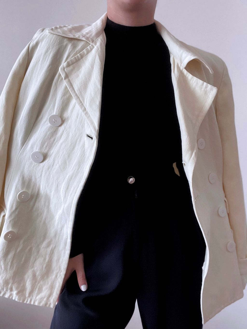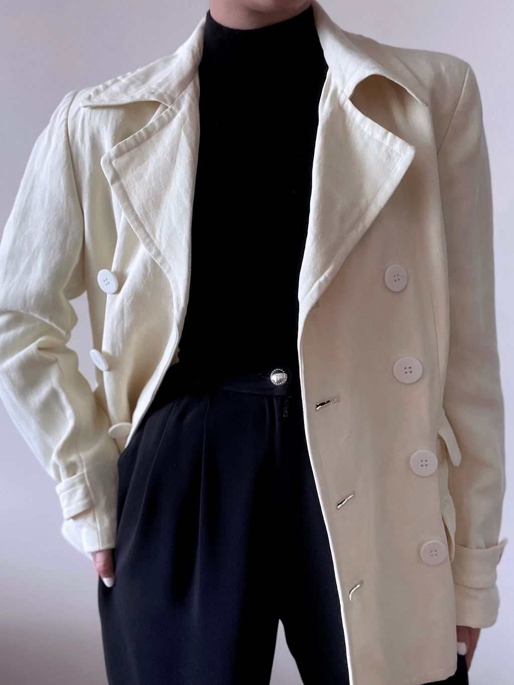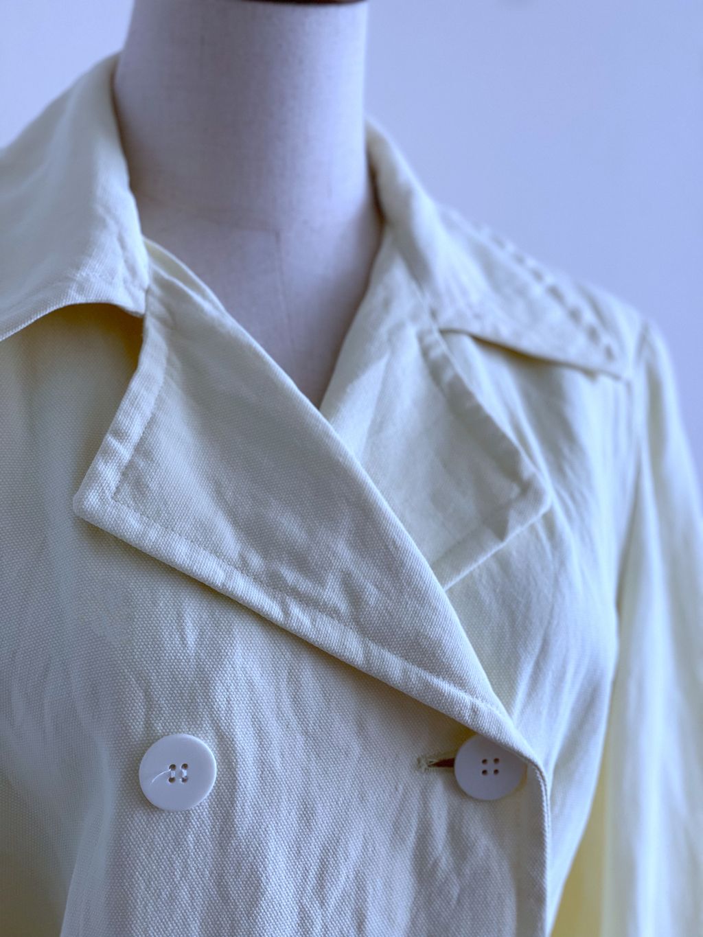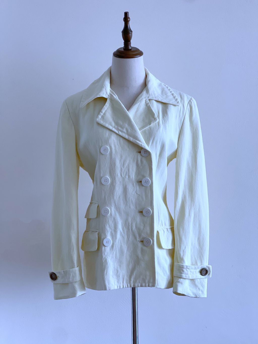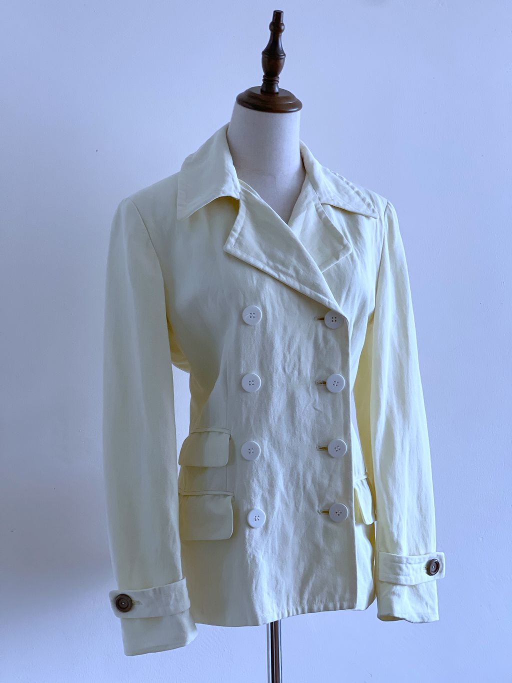 A 1990s vintage DKNY double-breasted coat, tailored in a pastel yellow linen-rayon blend that feels both light and structured. Its design echoes the sharpness of a pea coat with the elegance of a shortened trench, featuring a wide lapel collar and large rectangular flap pockets that balance style with utility. Finished with decorative cuff buttons, this piece embodies the sleek minimalism of 90s outerwear while offering a fresh, modern pastel hue.