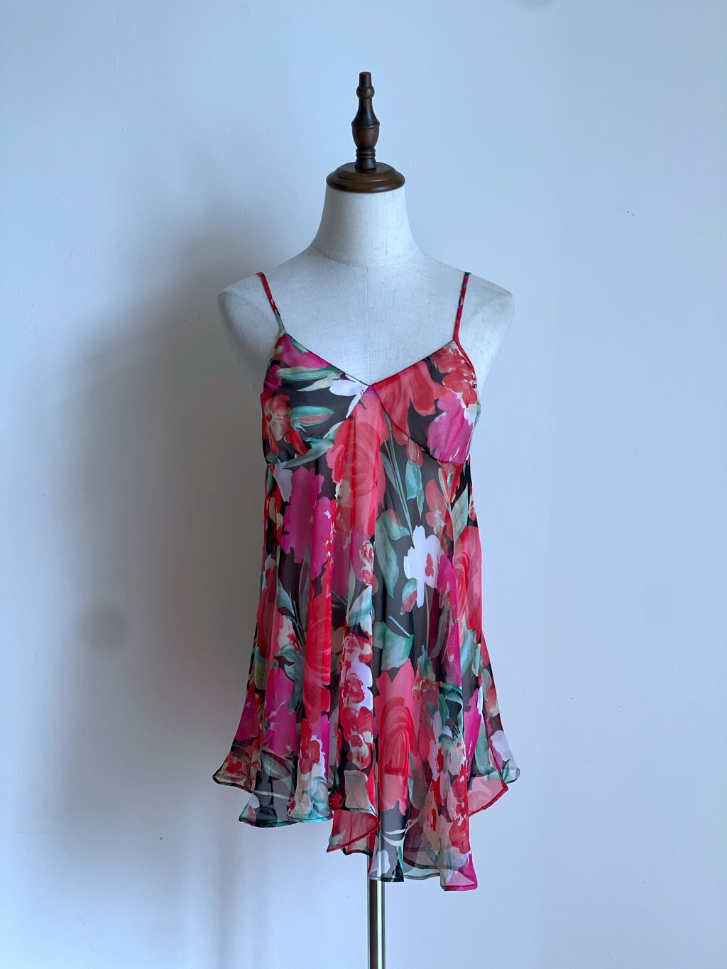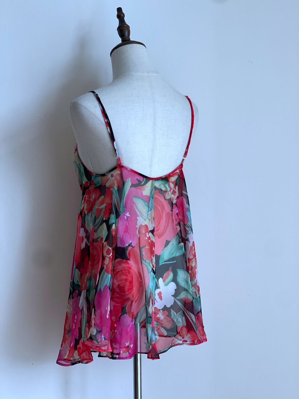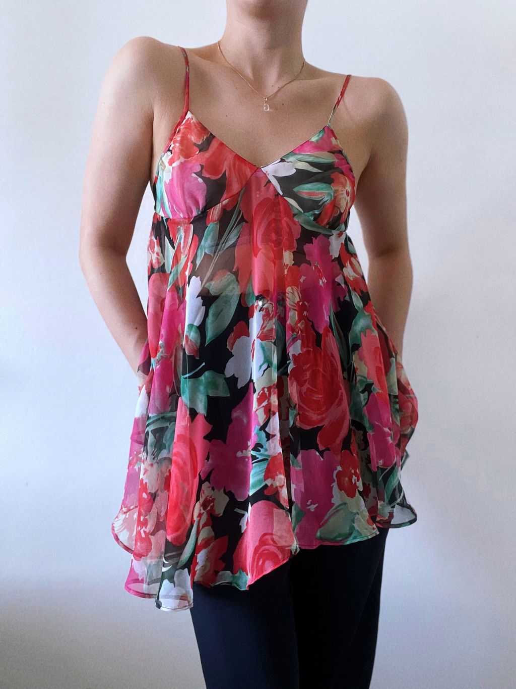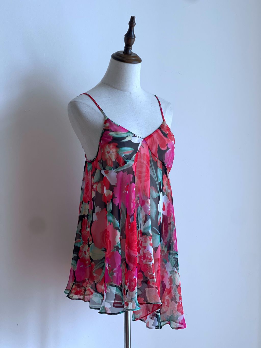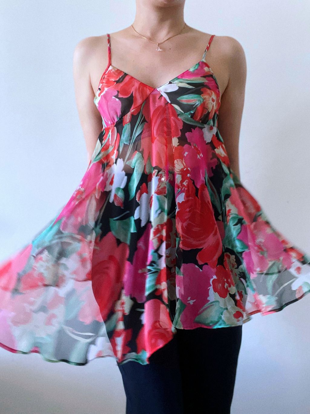 Step into timeless femininity with this vintage Victoria’s Secret mini slip, a coveted piece from the iconic gold tag era. Crafted in a lightweight, airy fabric, this slip features a delicate floral print that flutters with every movement, evoking effortless romance. The adjustable straps offer a customizable fit. Perfect as intimate loungewear or styled as a vintage-inspired layering piece.