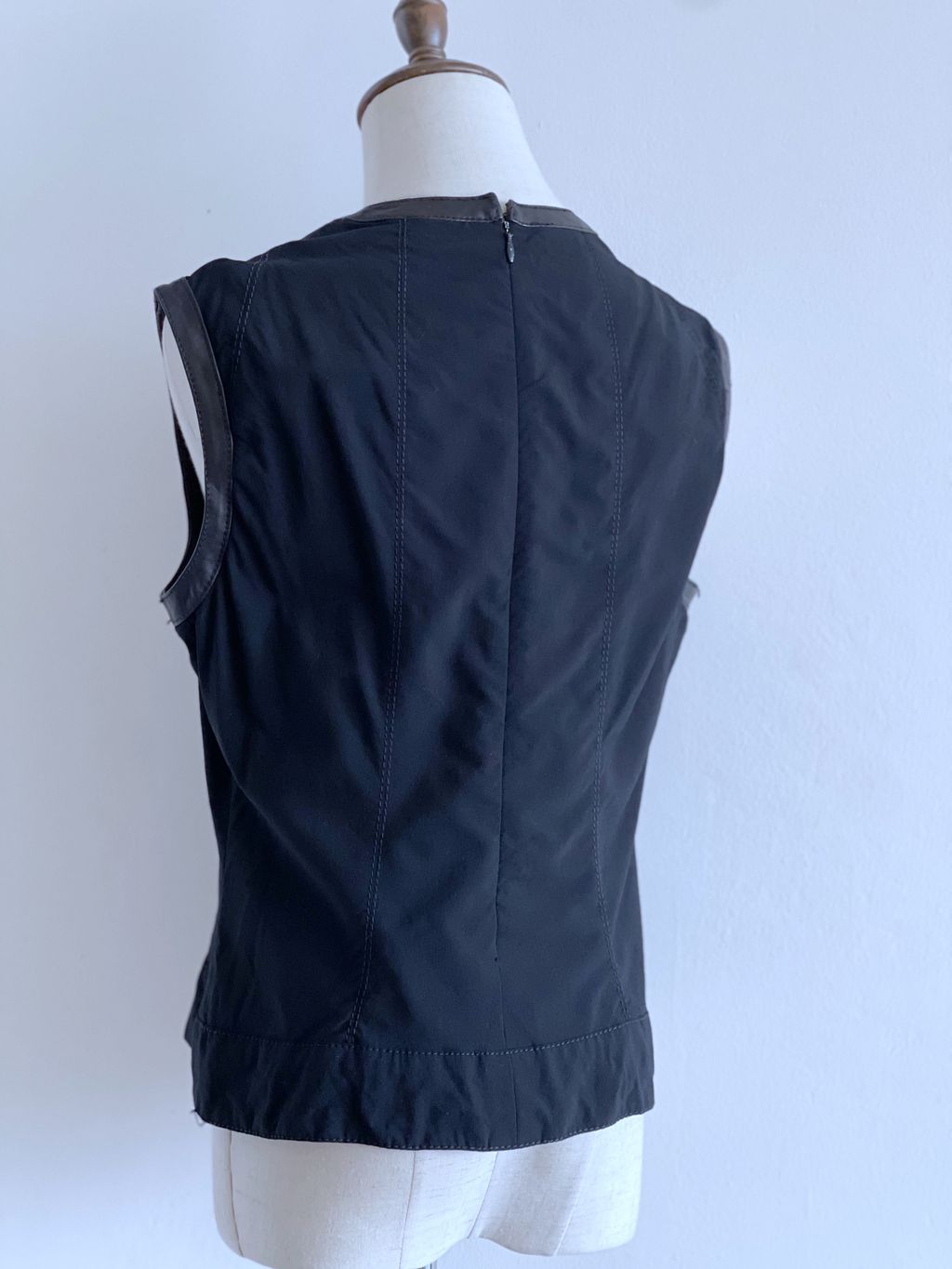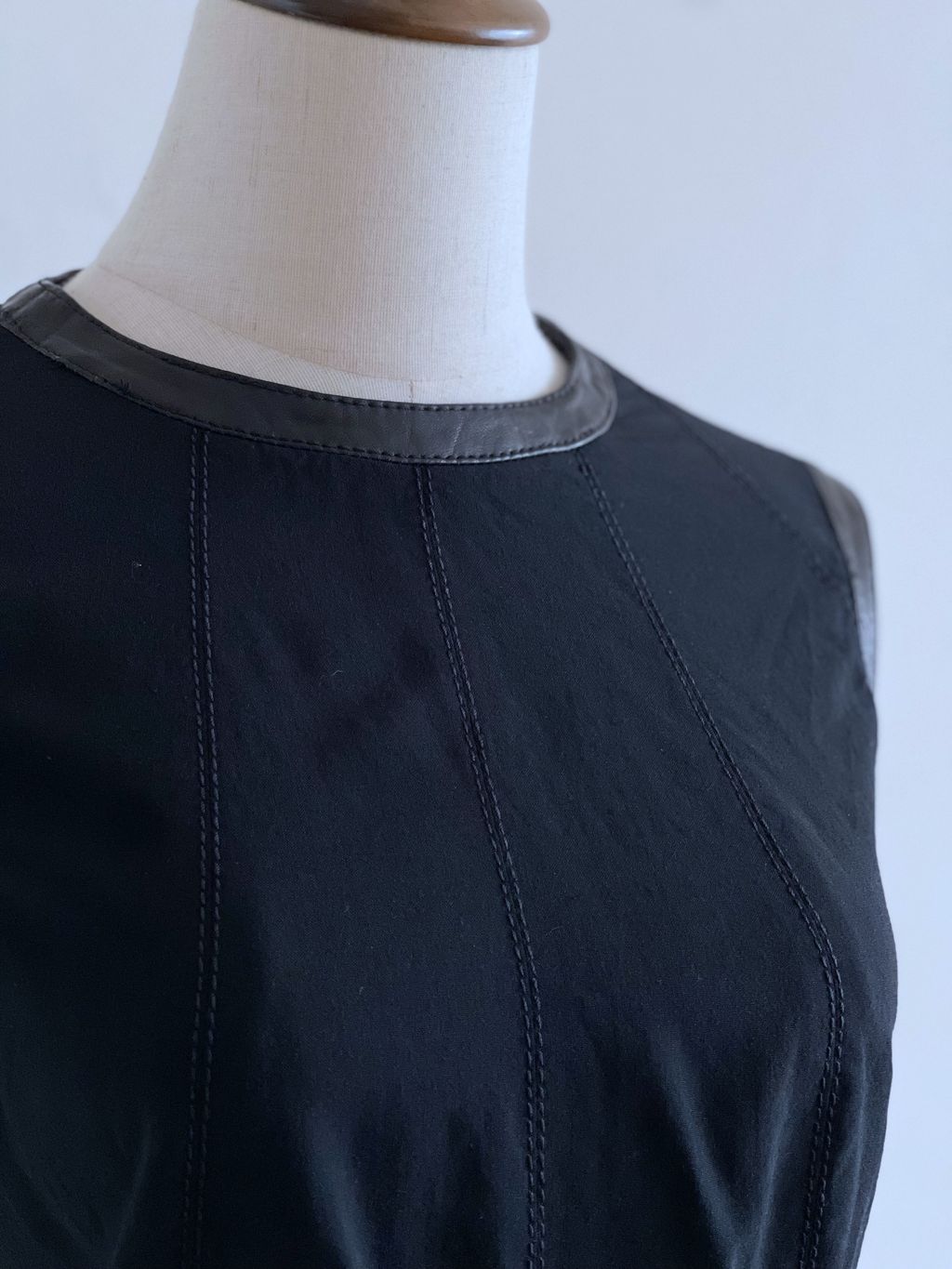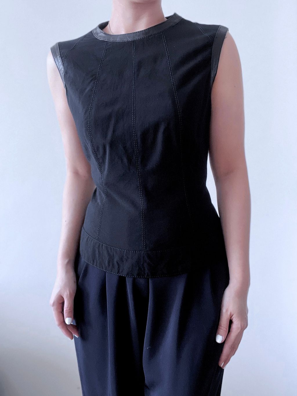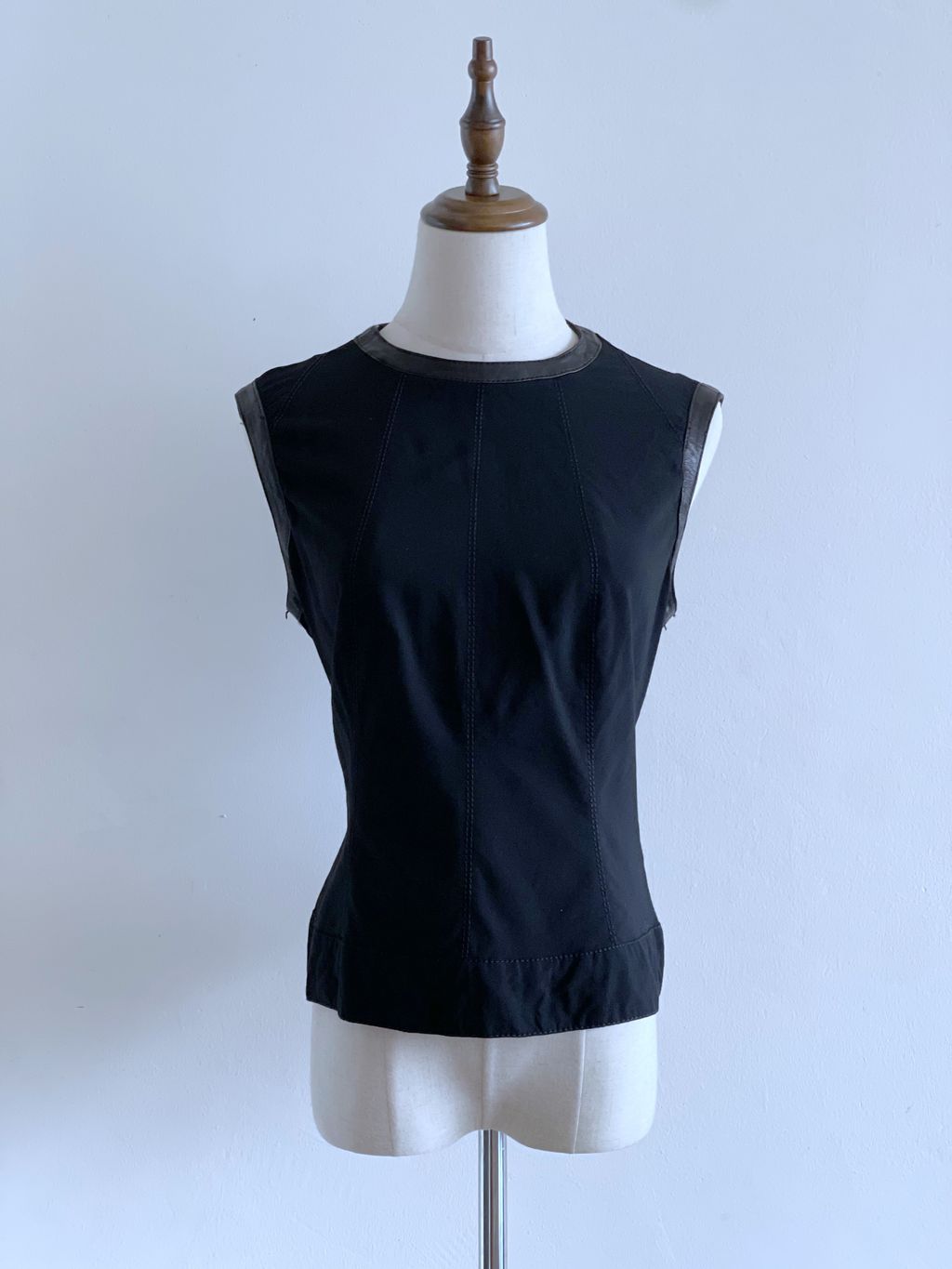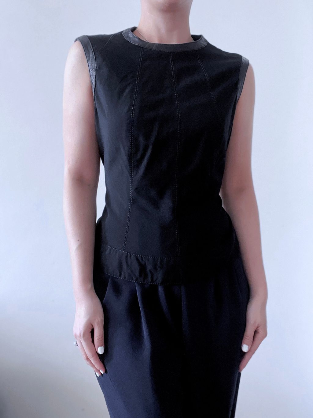 A striking vintage 90s DKNY top that embodies sleek minimalism and heroine-chic allure. Crafted in a fitted sleeveless silhouette, it features a high rounded neckline framed with pure leather trim along the collar and armholes. A concealed back zipper completes the design, lending structure to its streamlined form. Effortlessly modern yet timelessly 90s, this piece channels the iconic edge of the era—perfect for elevating both day-to-night styling.