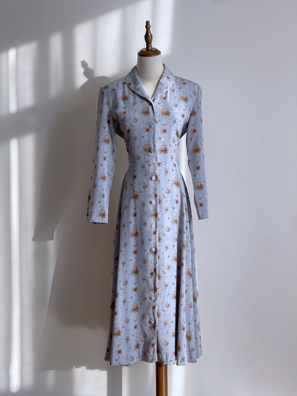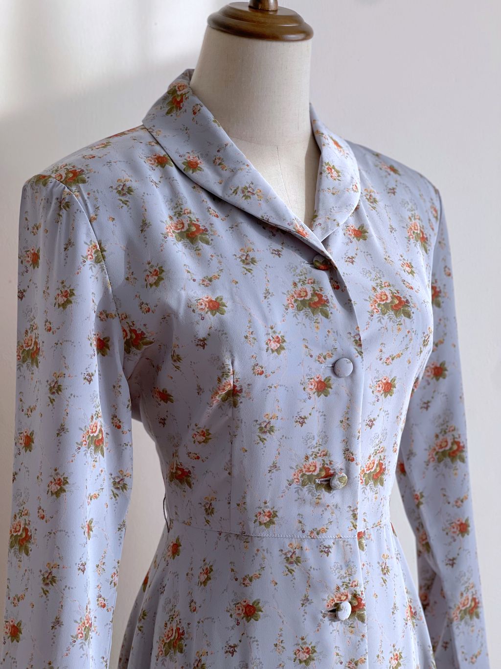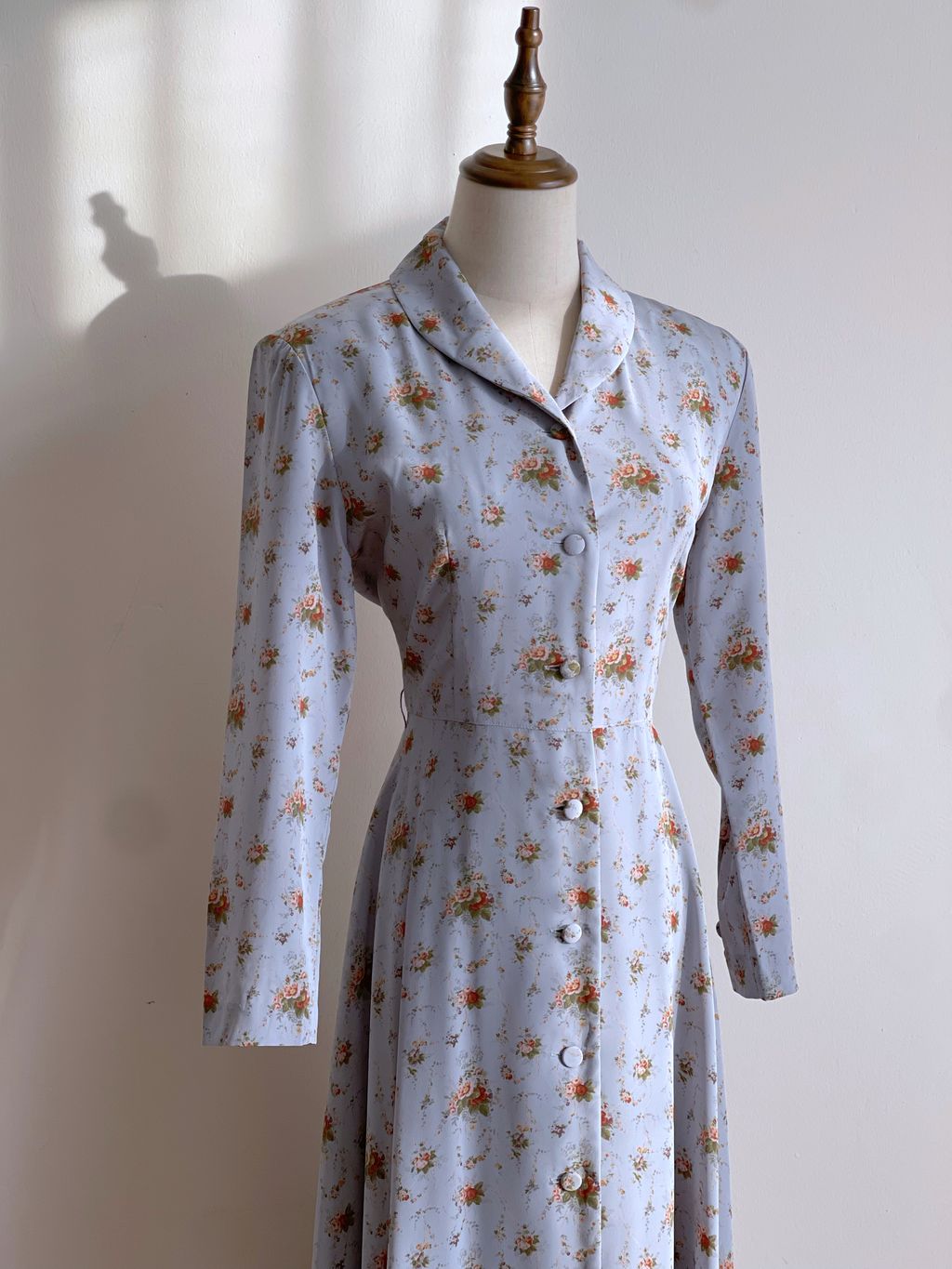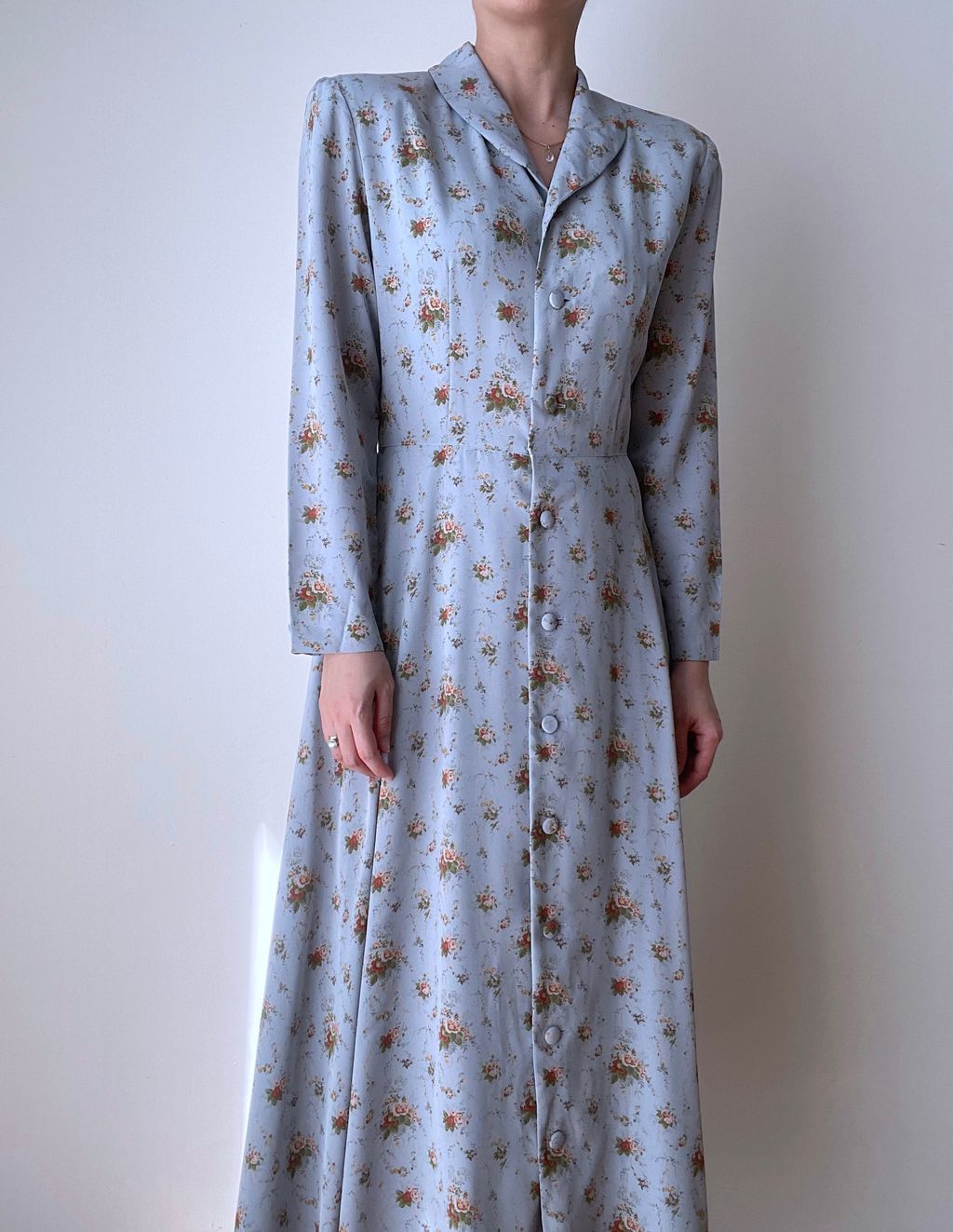 Romantic 90s vintage floral dress / shawl collar / full lining / fabricated buttons / shoulder pads