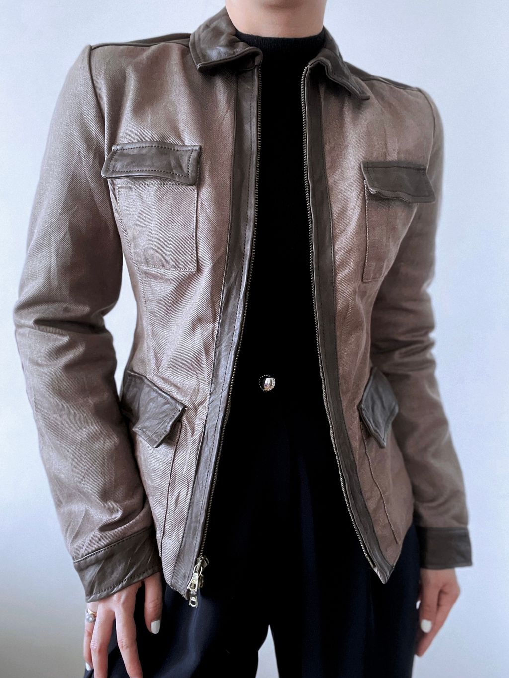 A pure Italian leather jacket, crafted in supple hide with meticulous attention to detail. Designed with a collared neckline, it features two chest pockets, two lower pockets, and refined leather trims that emphasize its craftsmanship. A functional zipper allows for cinching at the waist, shaping a tailored silhouette that balances utility with elegance. A timeless piece of outerwear that embodies Italian luxury and enduring sophistication.