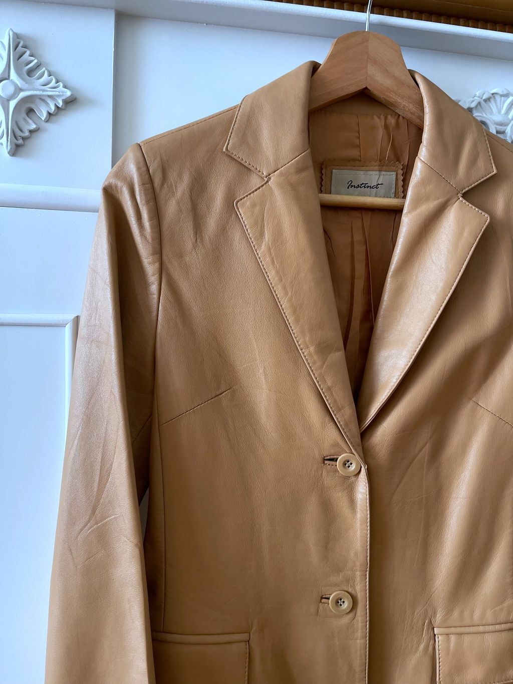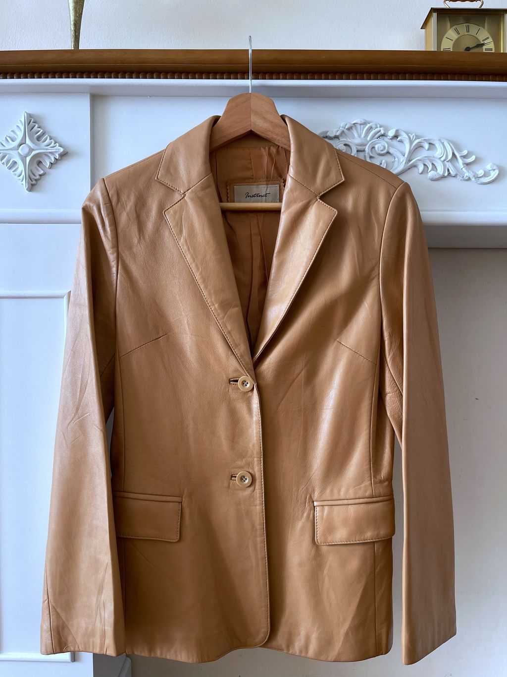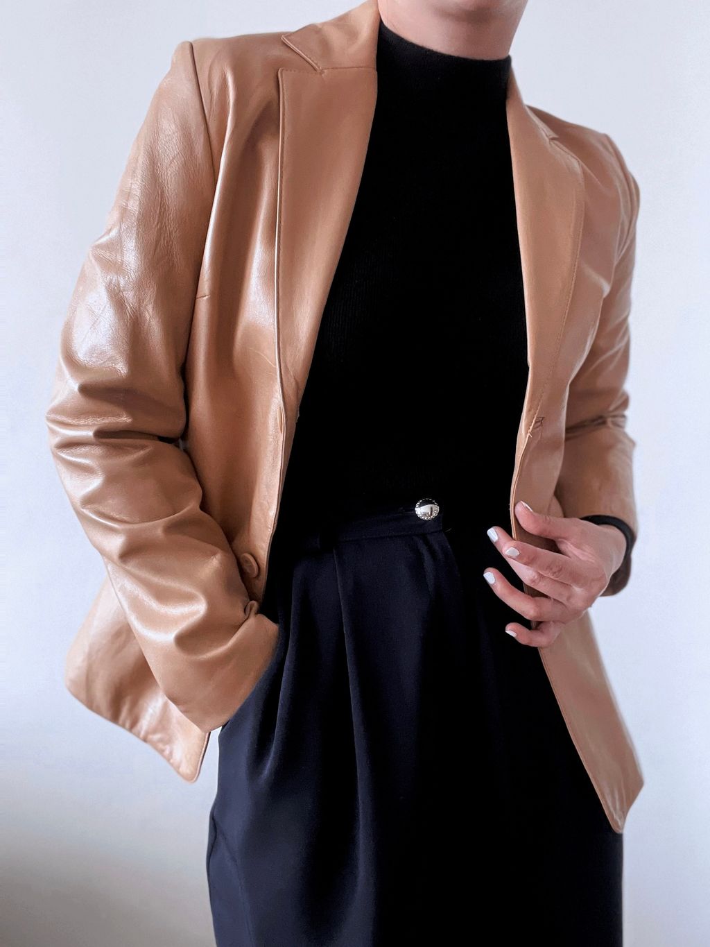 An Italian sheepskin leather jacket, crafted from supple, high-quality leather sourced directly from Italy. Designed with a tailored silhouette, it features a notched collar with sharp lapels and two front lower pockets that balance form with function. The smooth, structured finish channels effortless 90s cool—think Rachel Green off-duty chic—while embodying luxury craftsmanship and enduring style. An investment piece that blends timeless sophistication with iconic pop-culture allure.