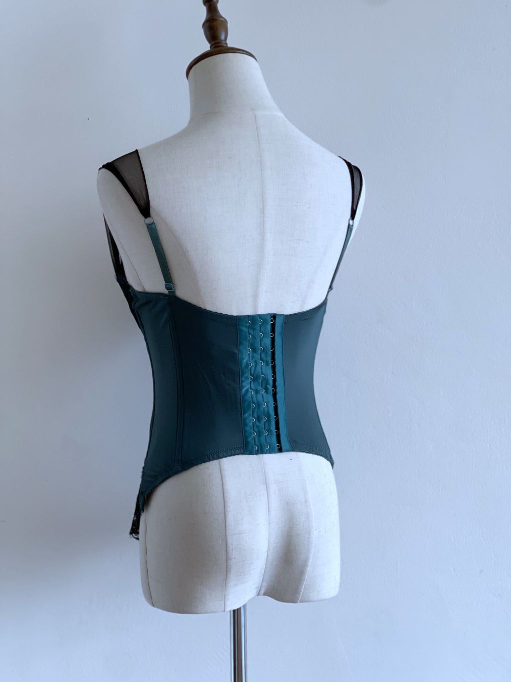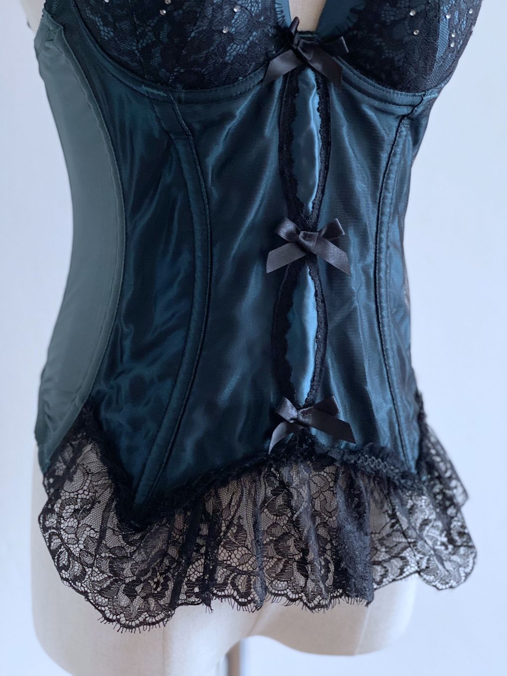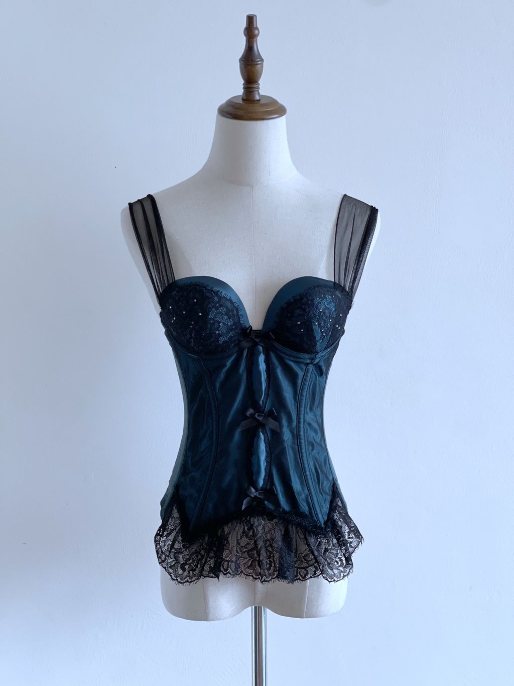 An enchanting Eblin corset top, exquisitely form-fitting with romantic lace trims, dainty bows, and delicately embellished cups. Designed with adjustable straps and a hook closure at the back, it offers both comfort and a personalized fit. Infused with lingerie allure, it captures a balance of structure and softness—shaping the silhouette while whispering femininity. A piece that transforms intimate details into outerwear elegance, perfect for styling with both vintage romance and modern edge.