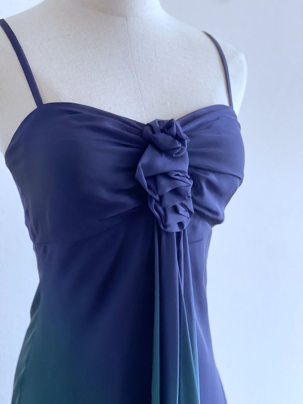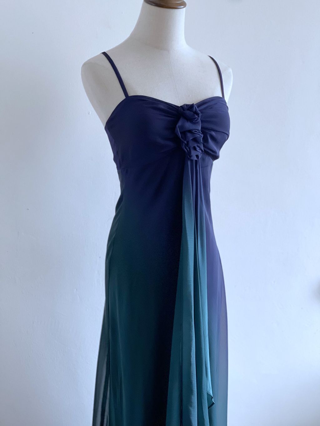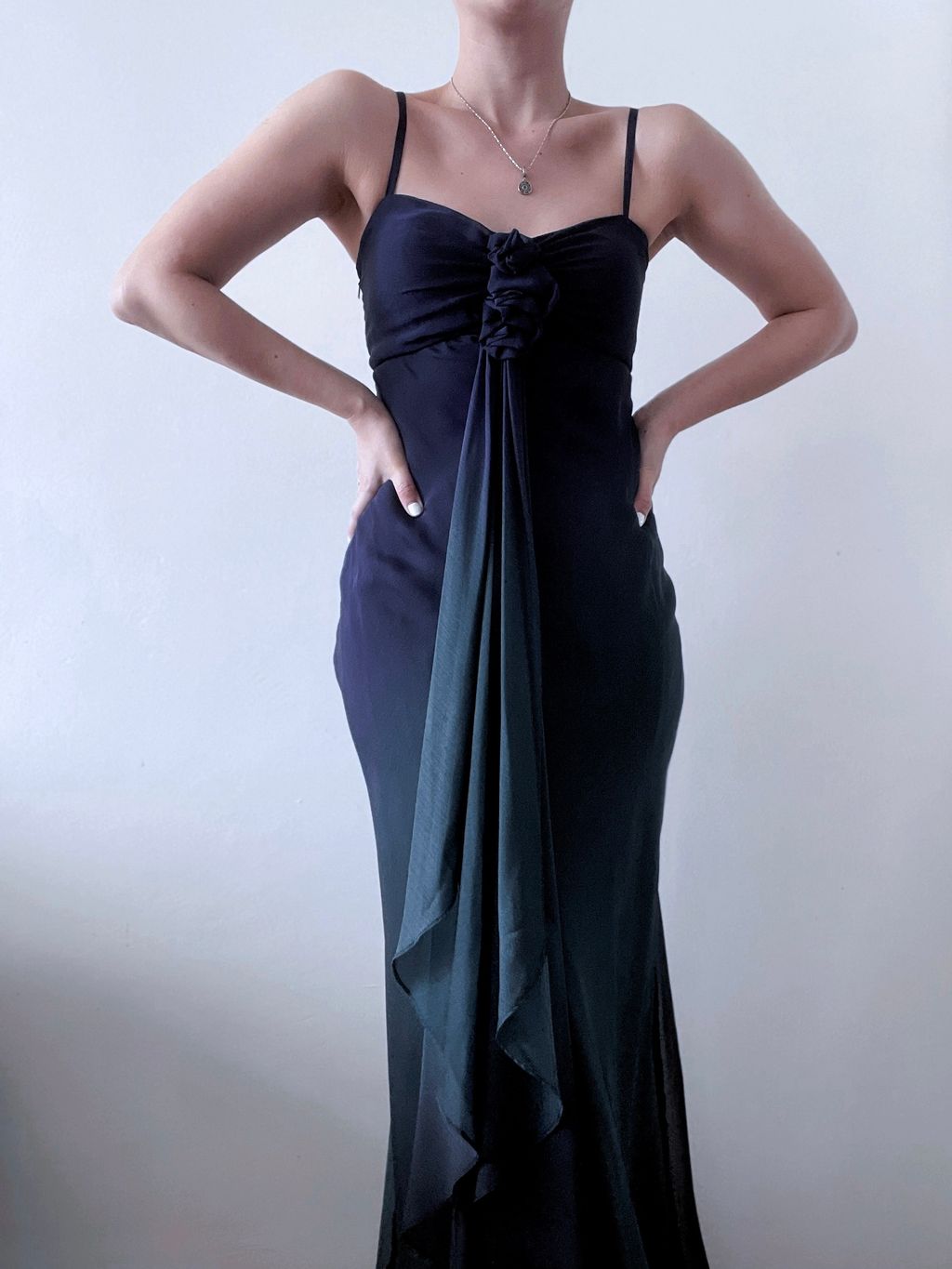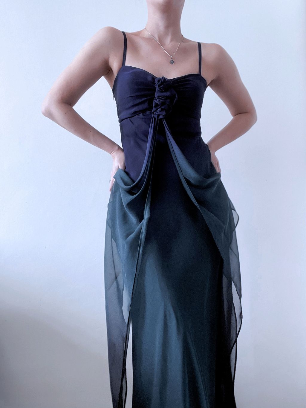 An ethereal ombré chiffon maxi dress, fading seamlessly from oceanic blue to soft green in a dreamy gradient. Designed with delicate straps and cascading ruffled drapes, it moves with weightless fluidity, capturing light and air with every step. Made in Romania, this piece evokes a sense of effortless romance and timeless elegance—perfect for evenings where grace meets allure.
