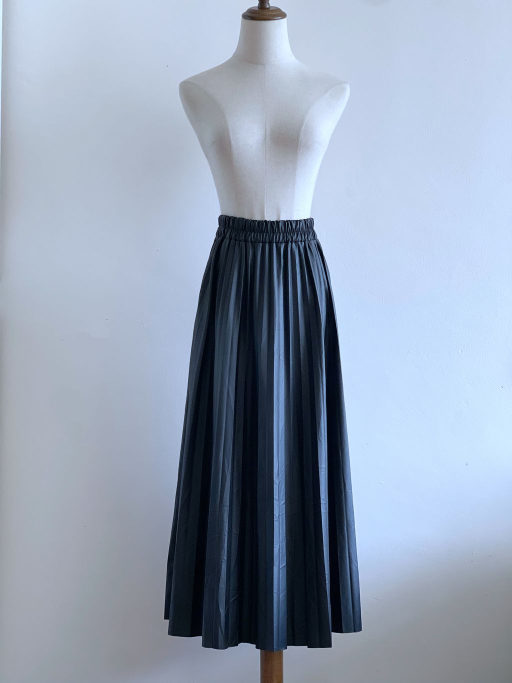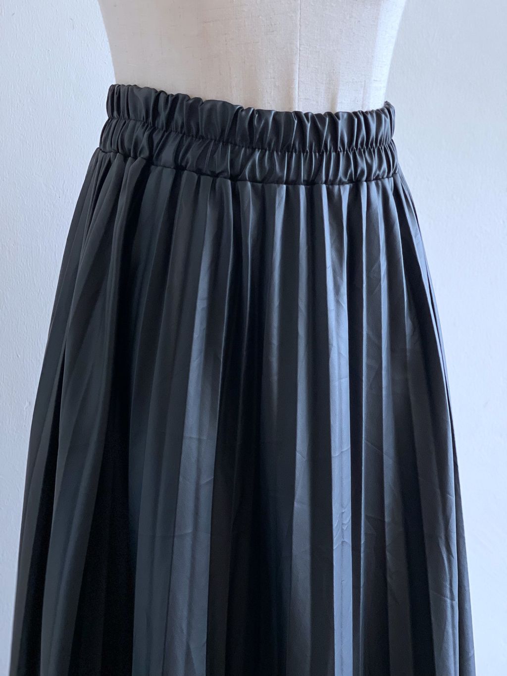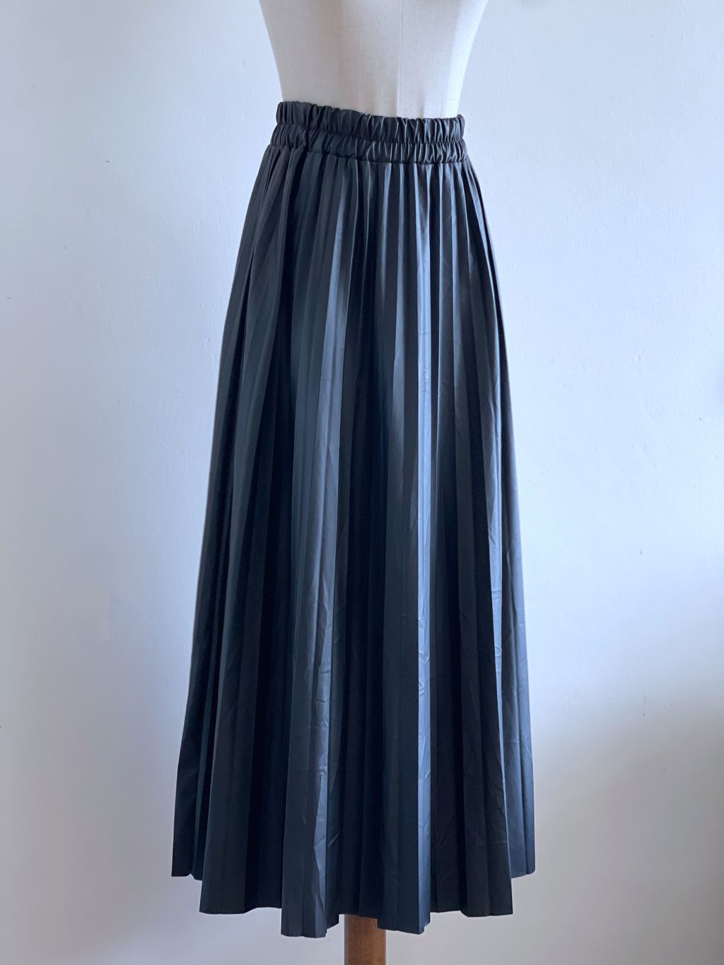 A faux leather pleated skirt, defined by sharp folds that create rich texture and a flowing, sculptural silhouette. Designed with a comfortable stretchy waistline, it offers ease of fit while maintaining its polished shape. The sleek finish adds modern edge, while the pleating brings movement and dimension. A versatile piece that balances structure with fluidity—perfect for styling with both casual knits and tailored tops.