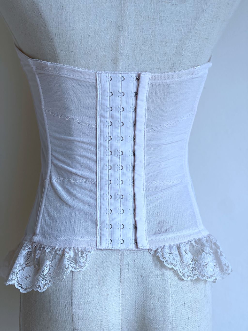 Absolutely beautiful 90s corset with floral embroidered mesh and romantic ruffled lace hem. Comes with hook & eye closure at the back.