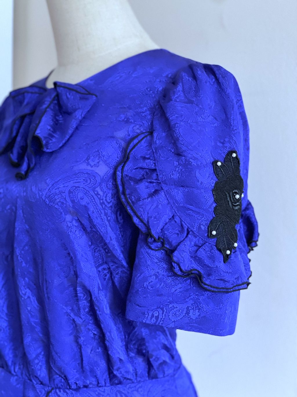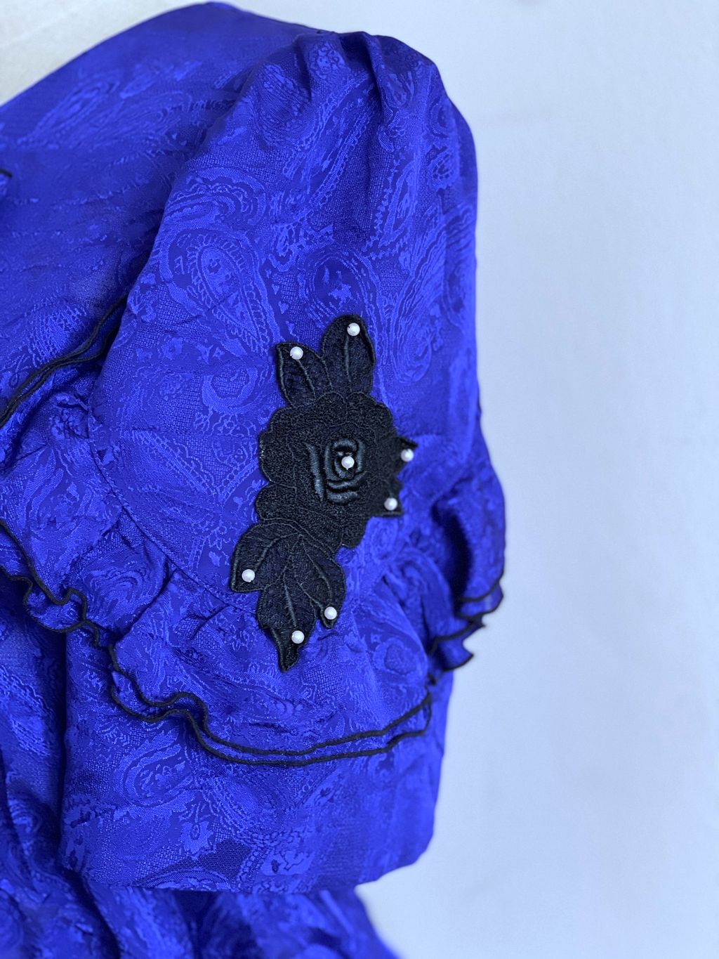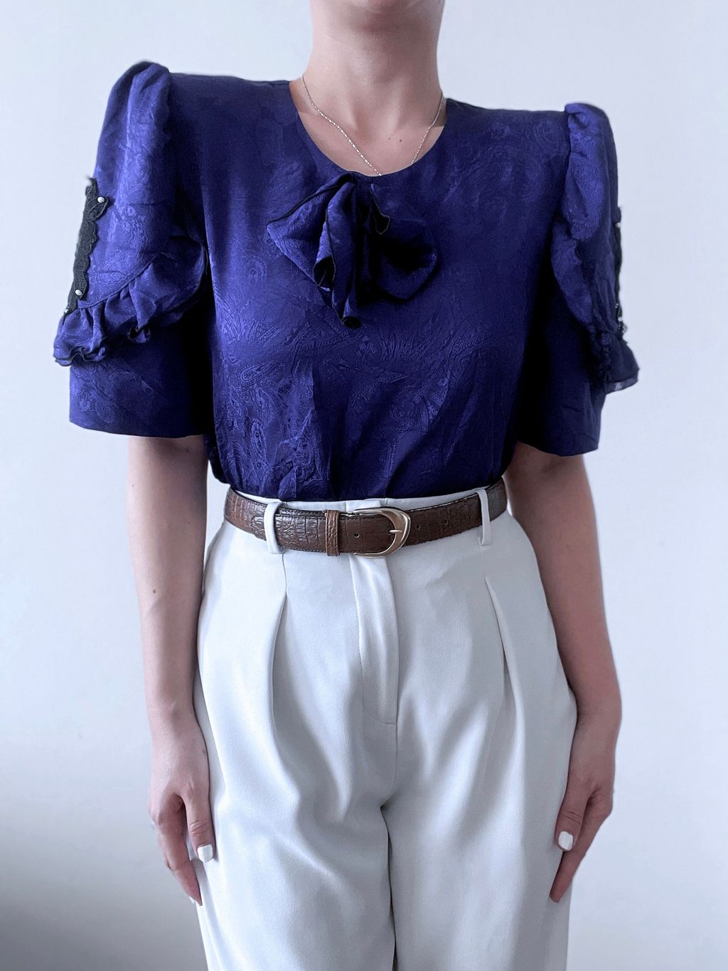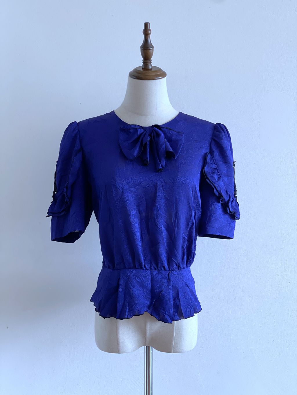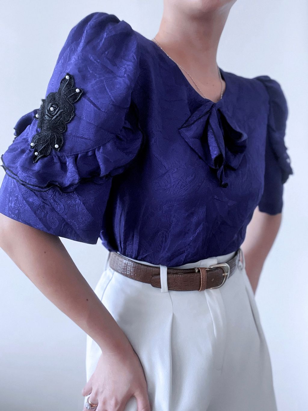 An opulent 1980s vintage blouse, crafted in a semi sheer subtle jacquard paisley fabric that catches the light with understated texture. Designed with voluminous puff sleeves adorned with black floral appliqué and delicate pearl accents, it exudes a decorative, romantic charm characteristic of the era. A detachable ribbon at the neckline offers a bold, playful flourish, while the gathered waist creates a gentle peplum effect that enhances the silhouette.