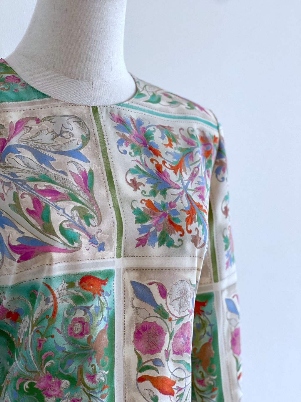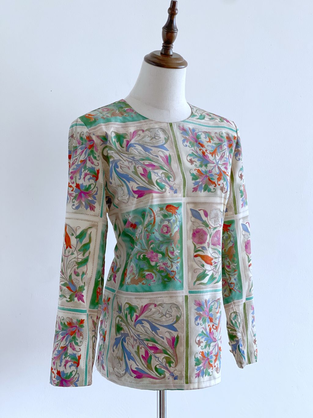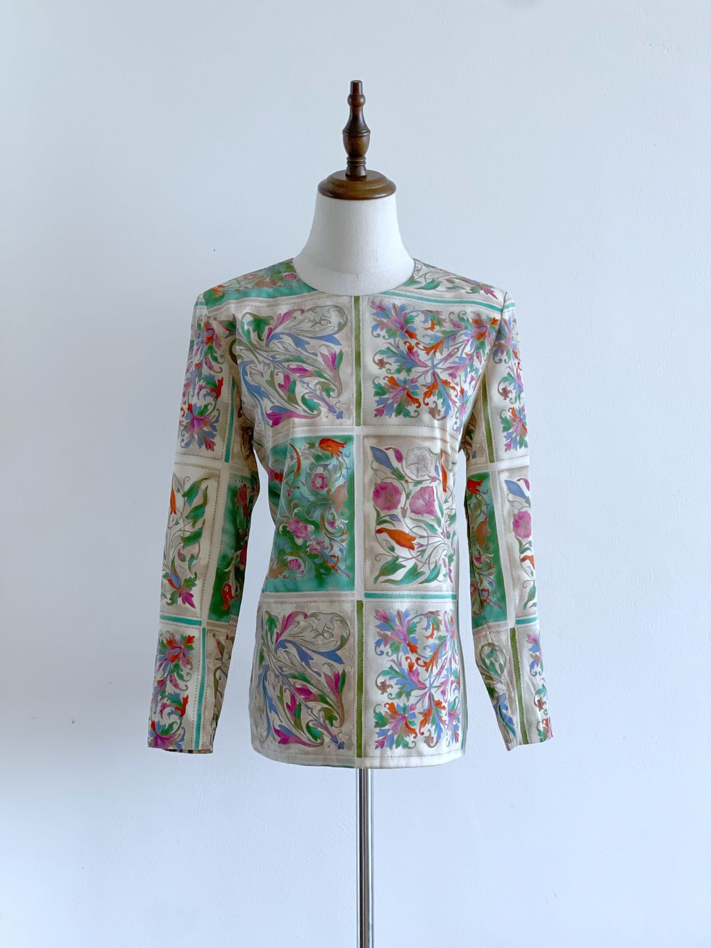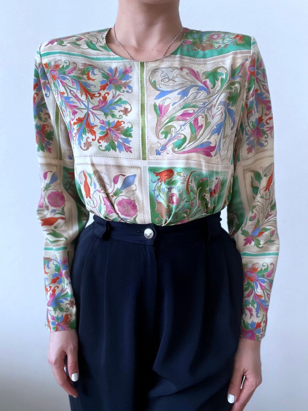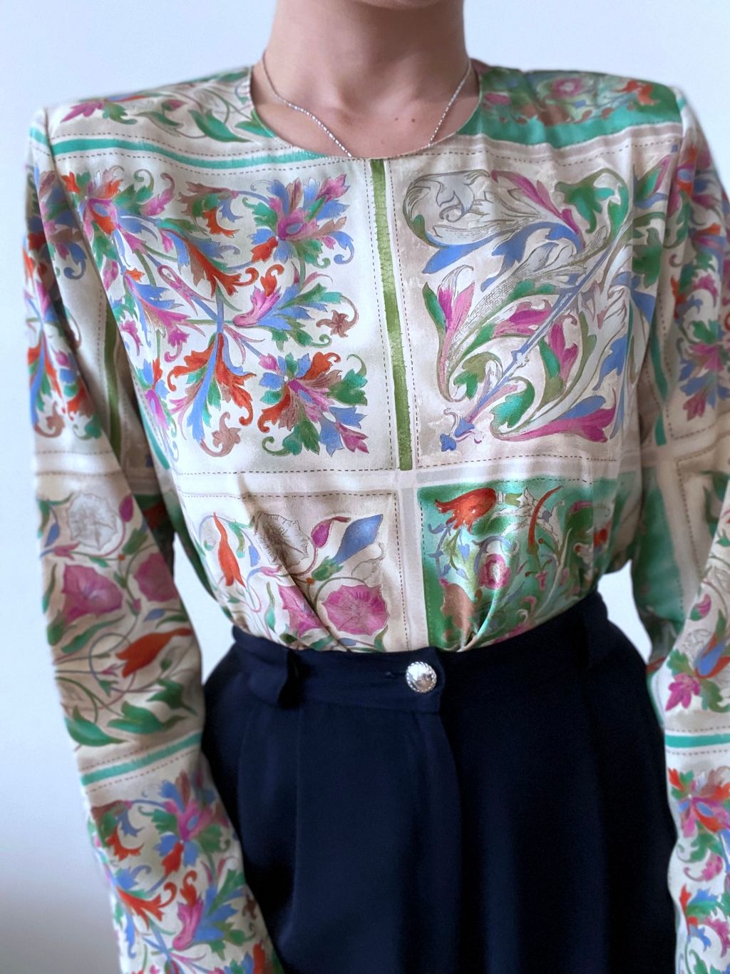 Evoking the ornate elegance of Art Nouveau design, this vintage blouse is a wearable tapestry of swirling lines and botanical flourishes. Intricate floral motifs are arranged within distinct panelled squares, creating a structured yet highly decorative composition. The fluidity of the print is balanced by a tailored silhouette, enhanced with subtle shoulder pads for a poised finish. A bold, artistic statement—refined in detail and timeless in its visual impact.