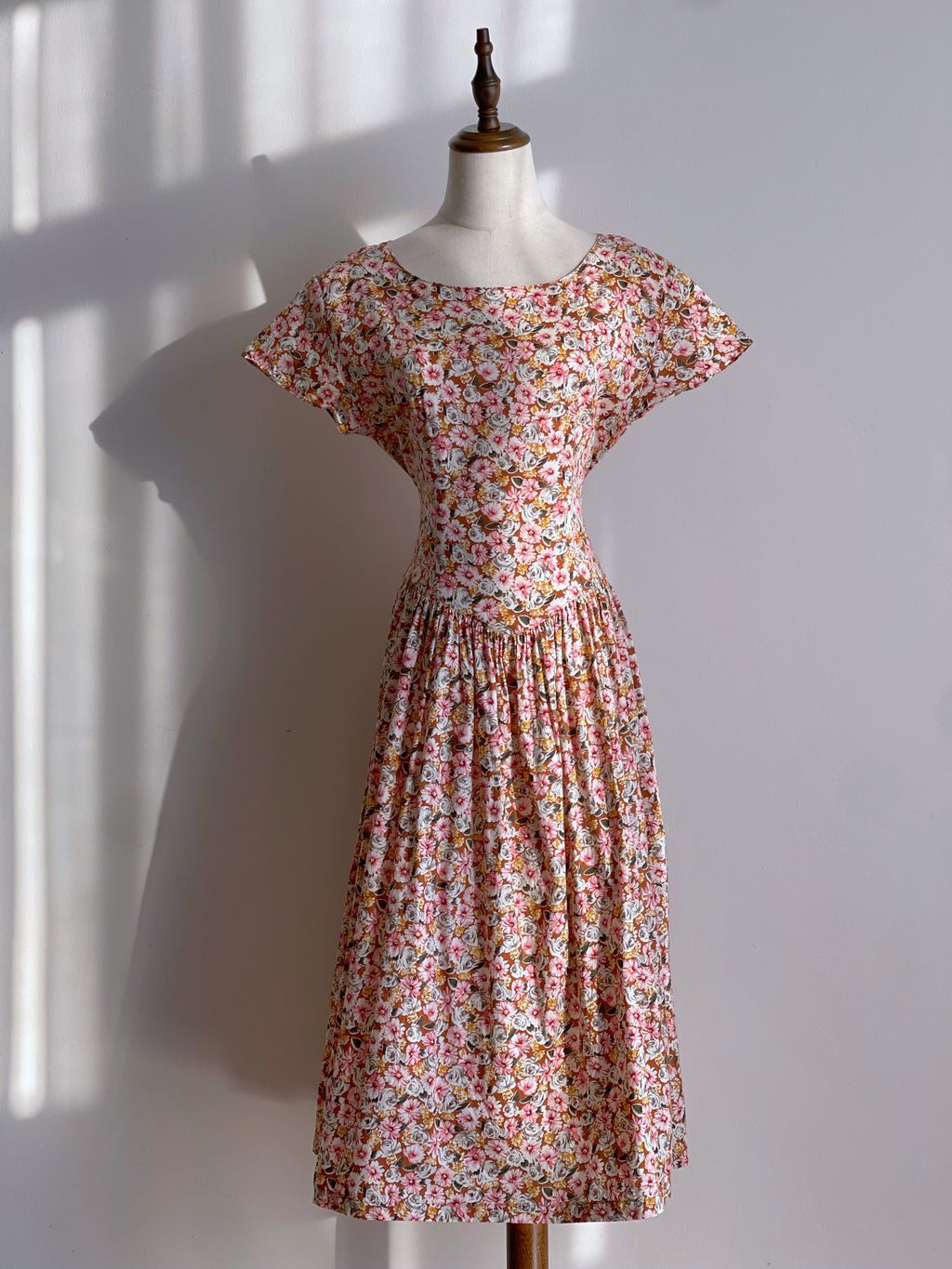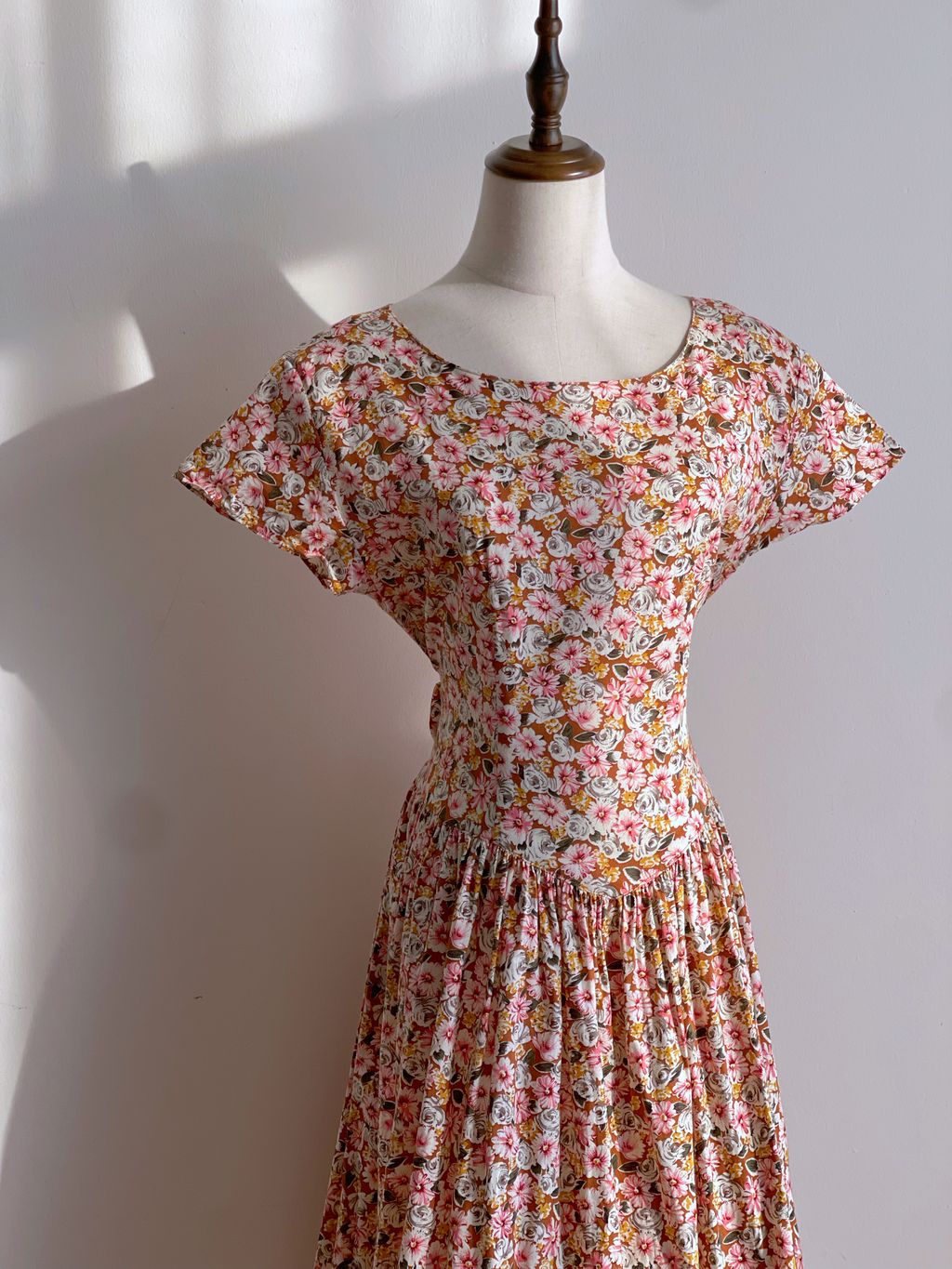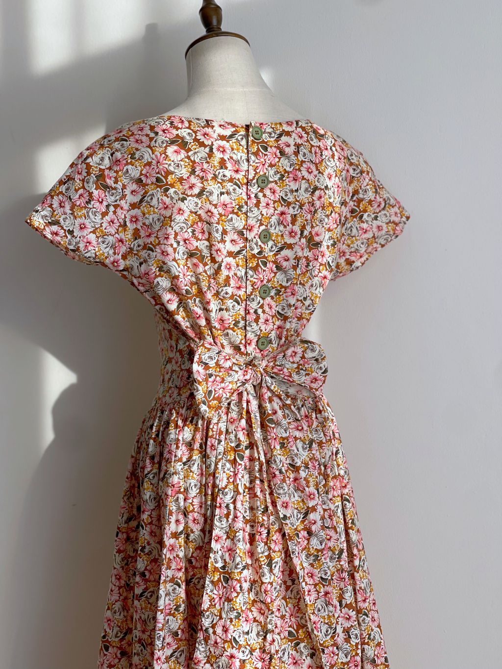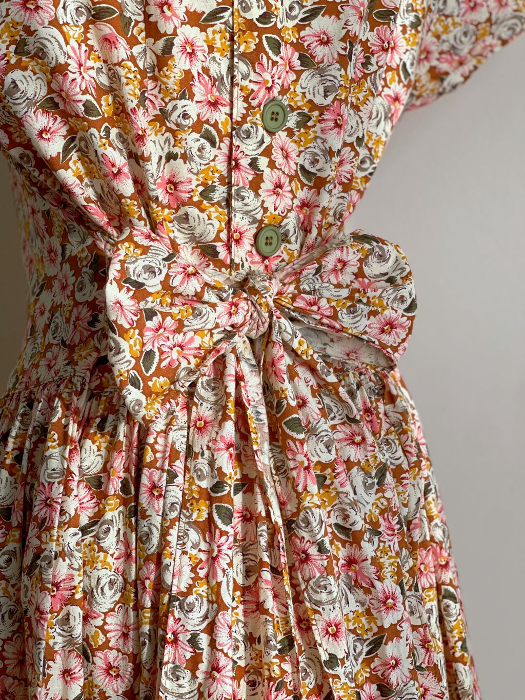 Romantic vintage floral cotton dress / buttons at the back / basque waistline / tieable straps belt / no lining / shoulder pads