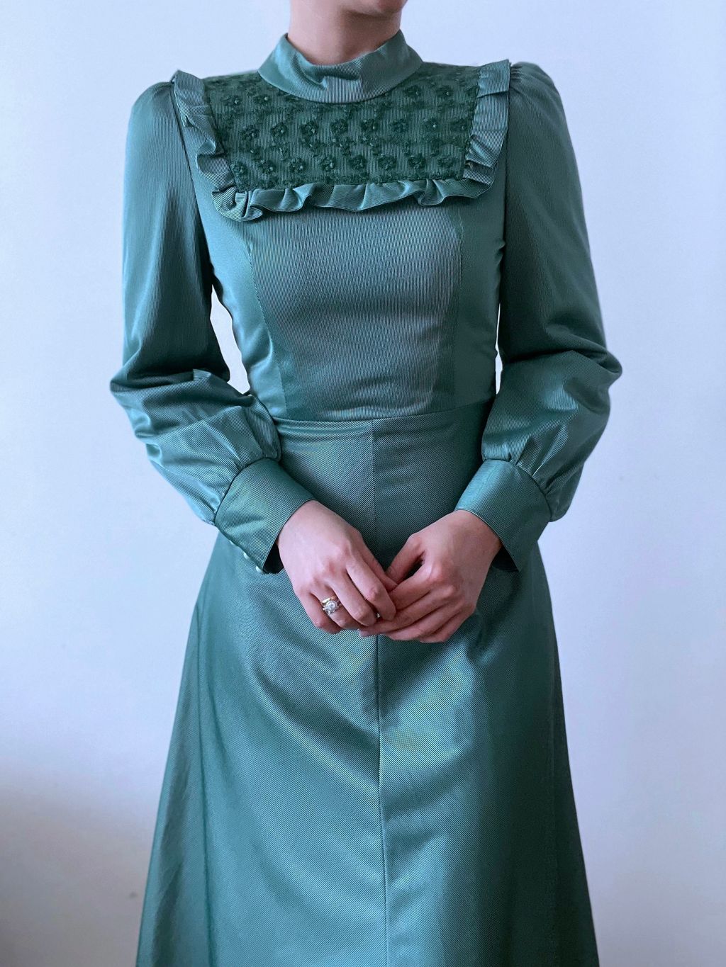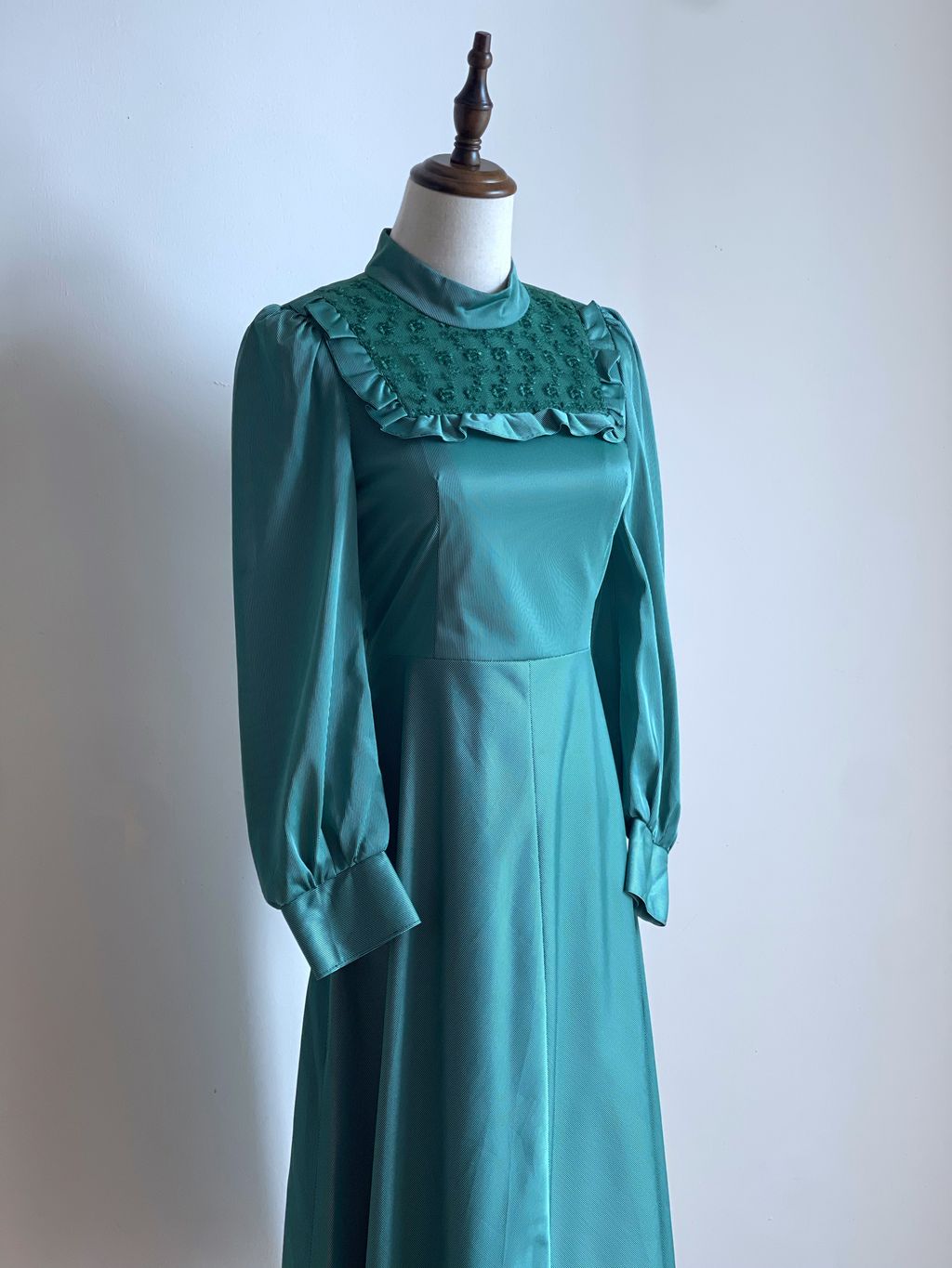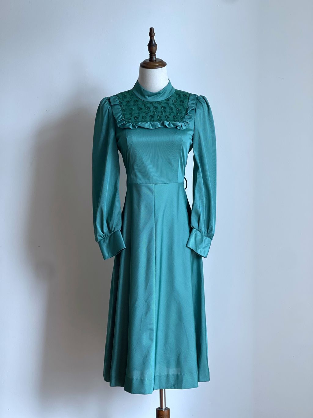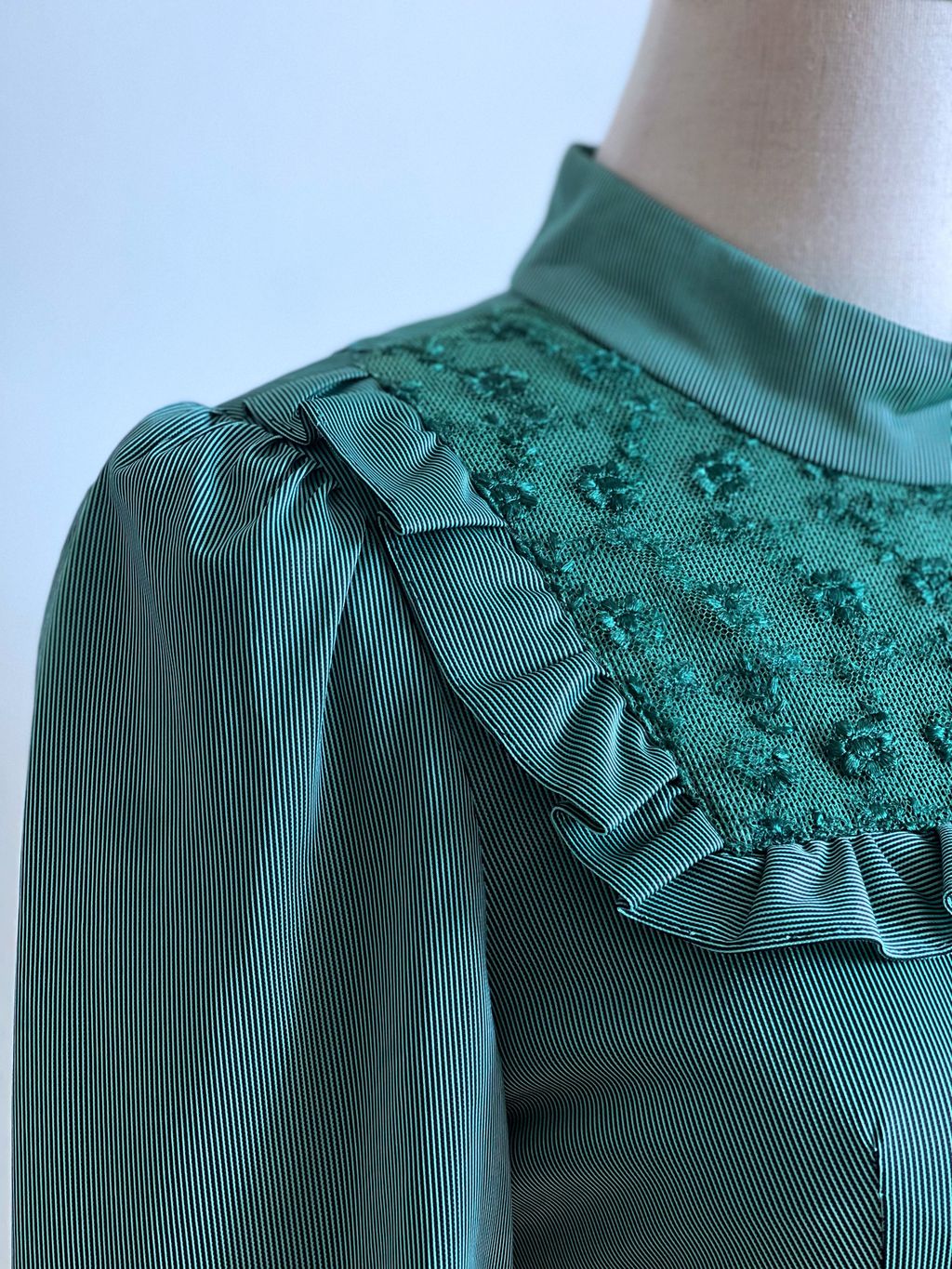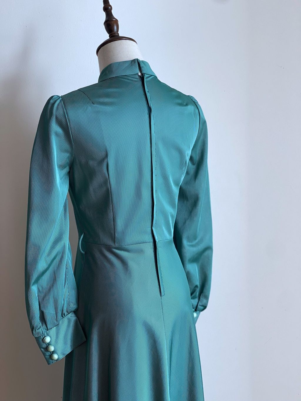Gracefully modest and quietly striking, this vintage teal midi dress features a high ruffled collar, puffed sleeves with wide cuffs and an embroidered yoke with delicate floral detailing. Features structured shoulder pads, a fully lined interior and a back zipper for ease of wear. Soft A - line skirt evoke timeless charm - a beautiful nod to late 1960s to early 1970s sophistication.